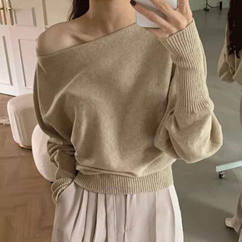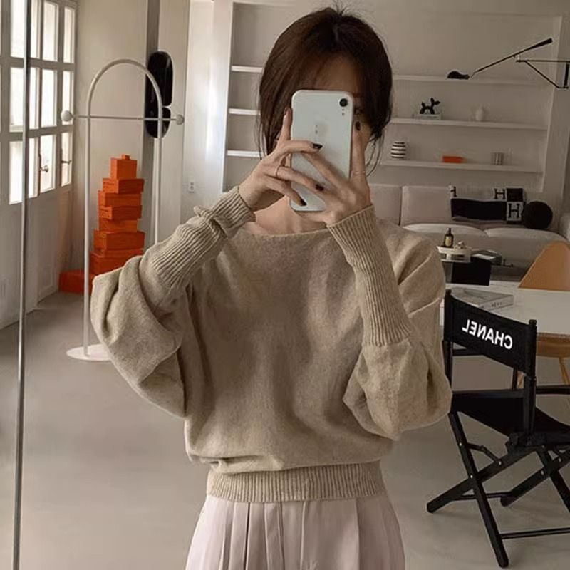 한국 세련된 가을 레트로 우아한 라운드 넥 풀오버 솔리드 컬러 느슨한 올 매치 랜턴 슬리브 니트 스웨터