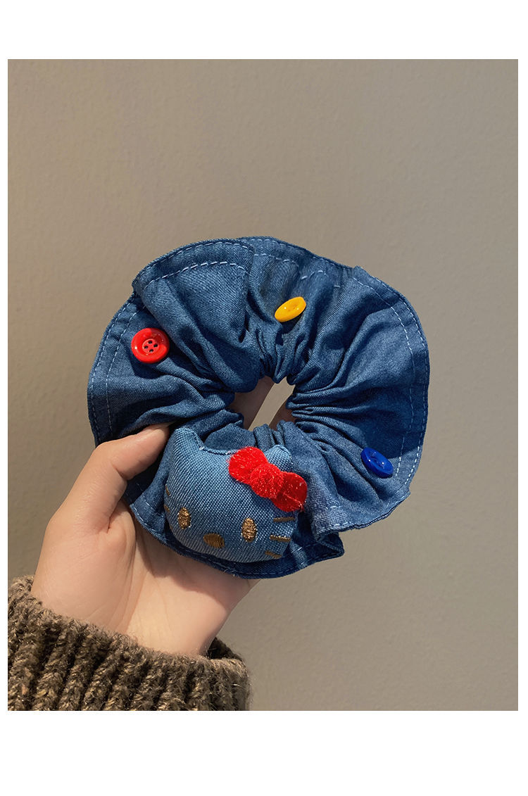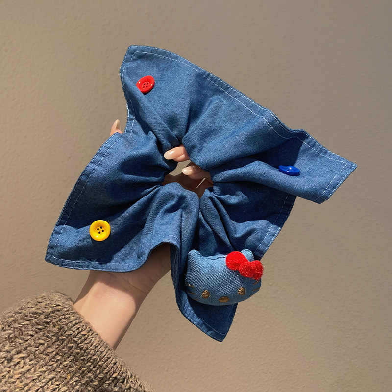 귀여운 데님 키티 고양이 버튼 스퀘어 스카프 대형 내장 헤어 링 여성 한국 스타일 레트로 스퀘어 하이 엔드 센스 헤드 라인 헤어 액세서리