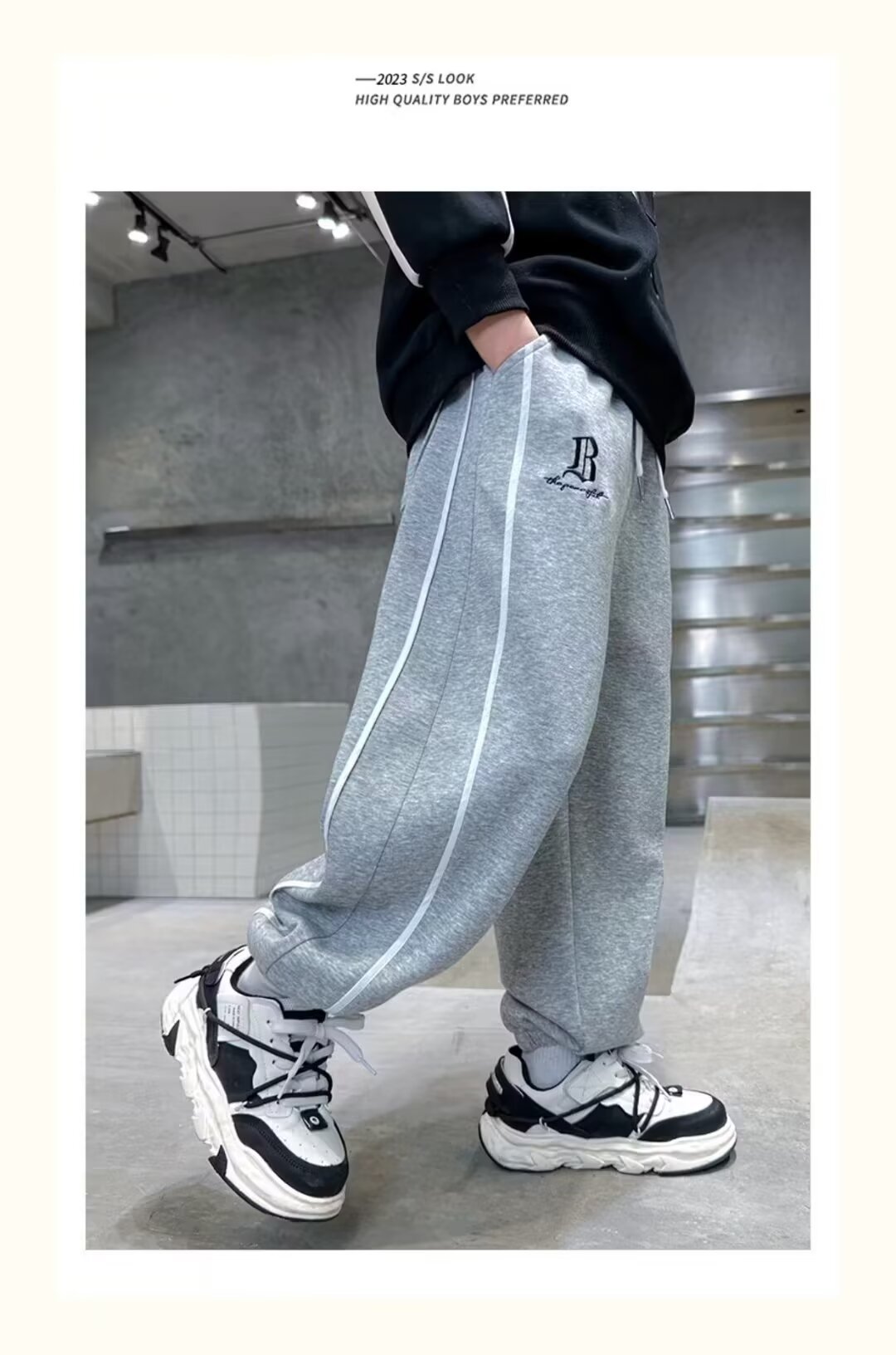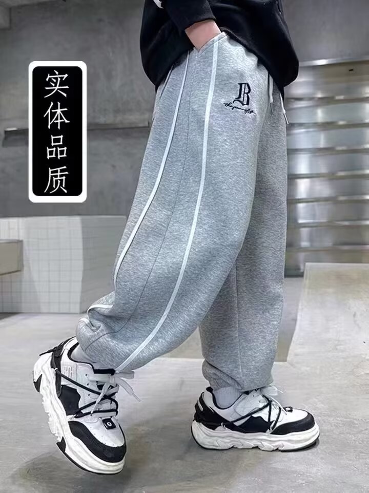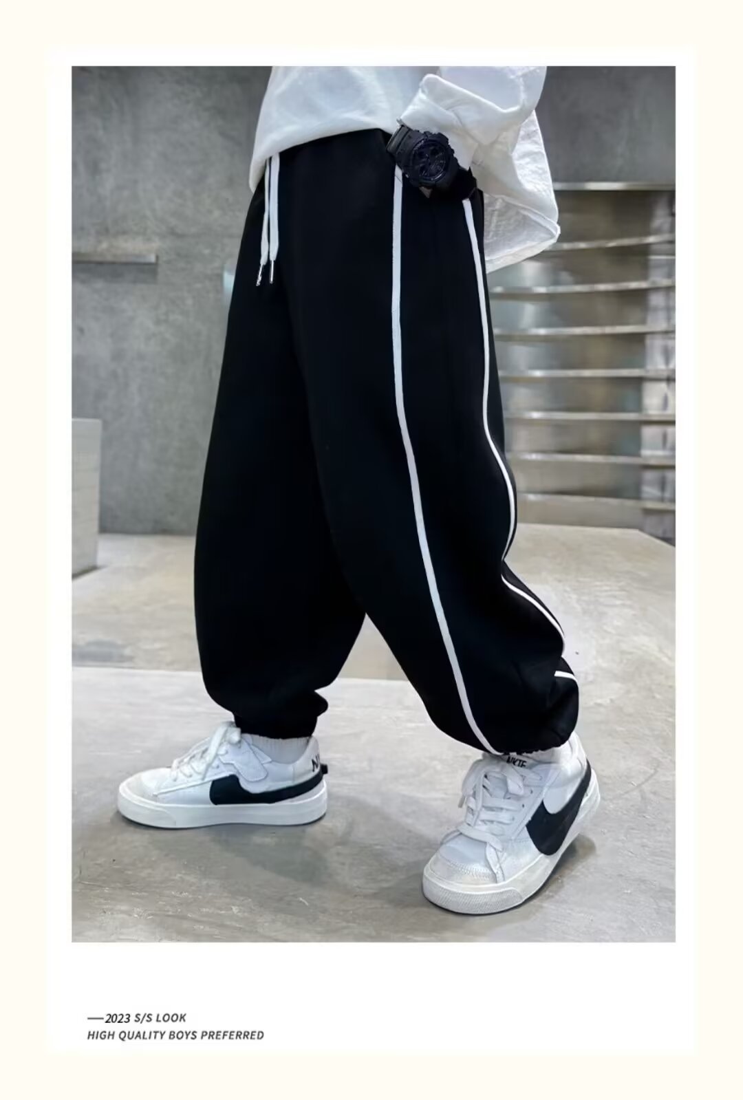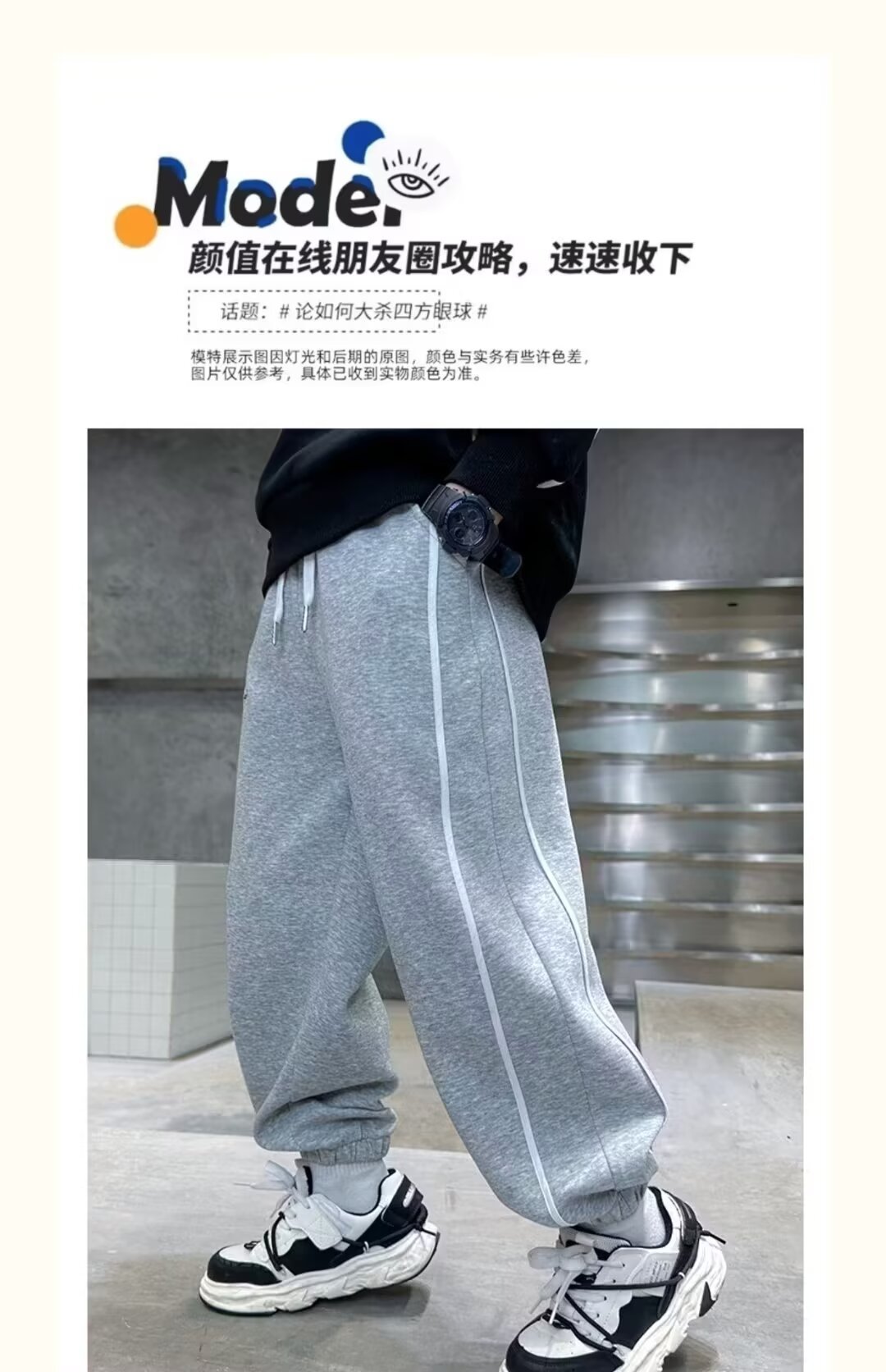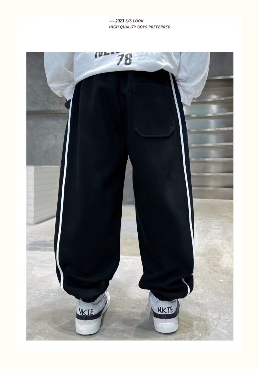 2024 가을/겨울 새로운 홍콩 스타일 줄무늬 캐주얼 바지 소년 느슨한 스트레이트 발 바지 기모 바지