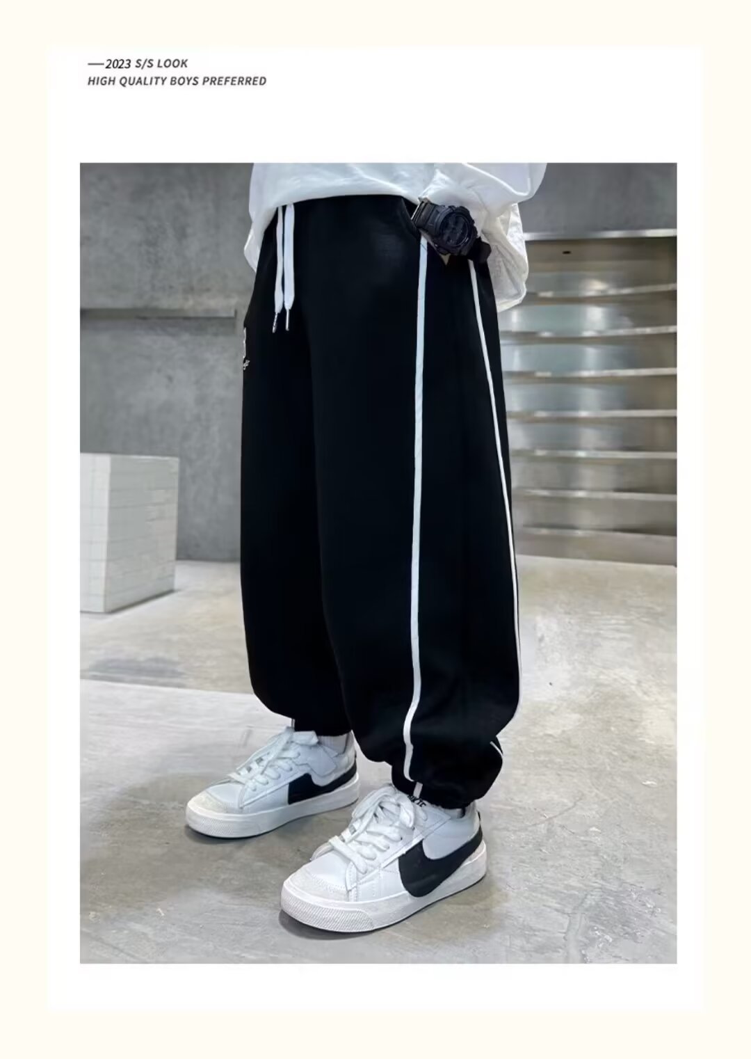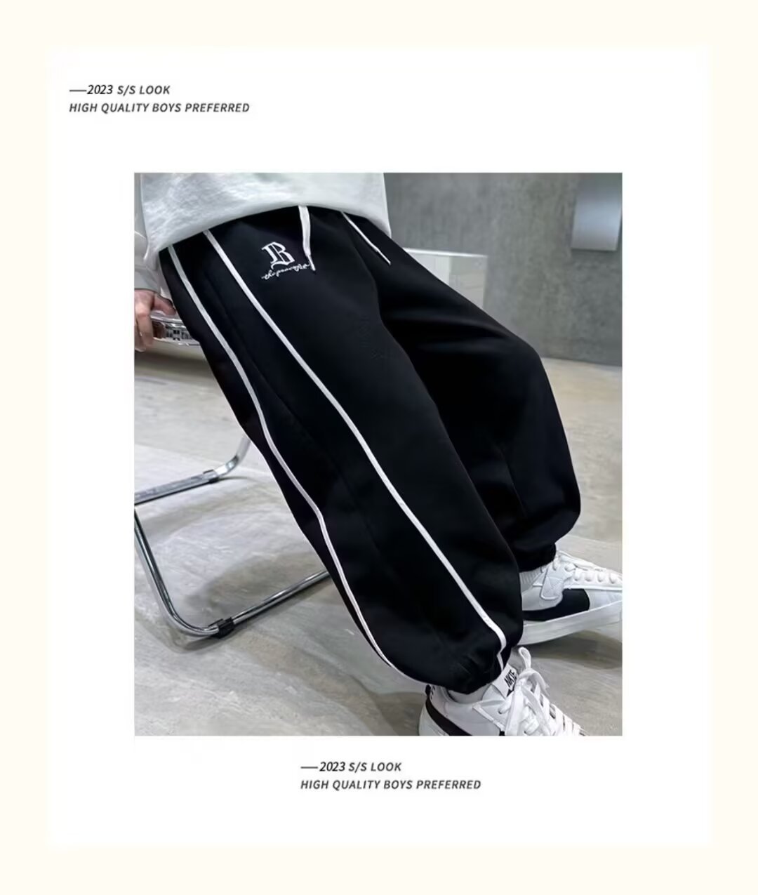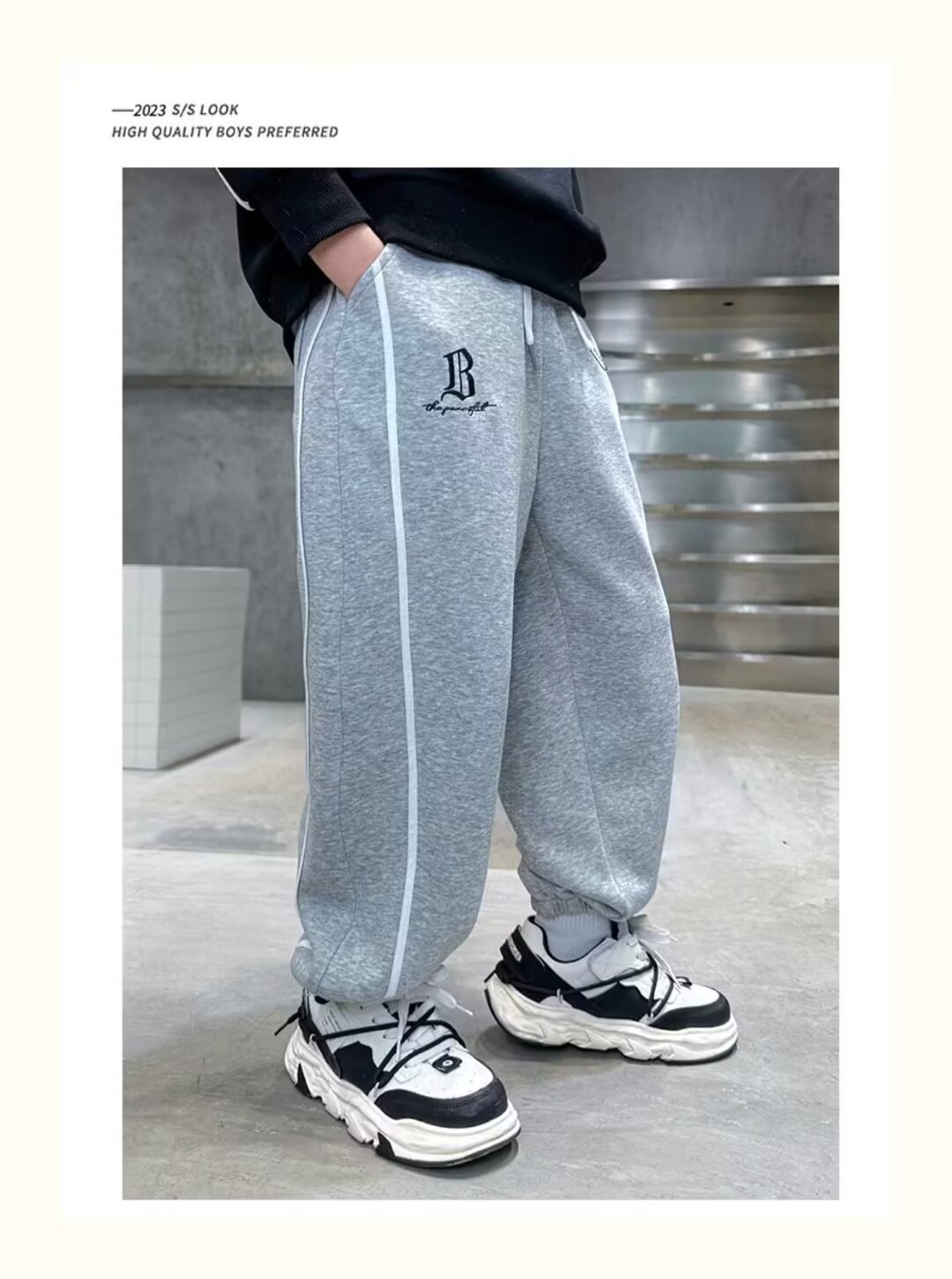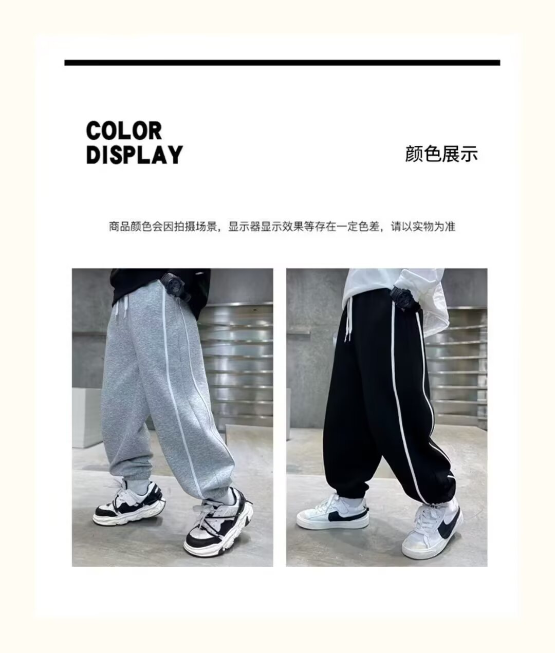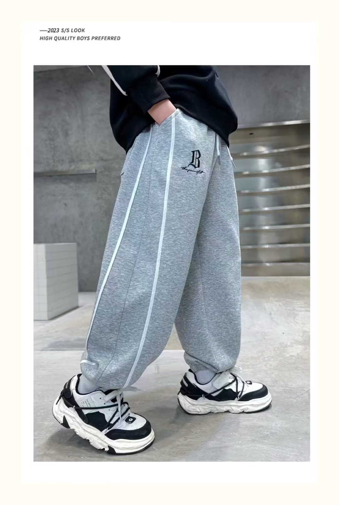 2024 가을/겨울 새로운 홍콩 스타일 줄무늬 캐주얼 바지 소년 느슨한 스트레이트 발 바지 기모 바지