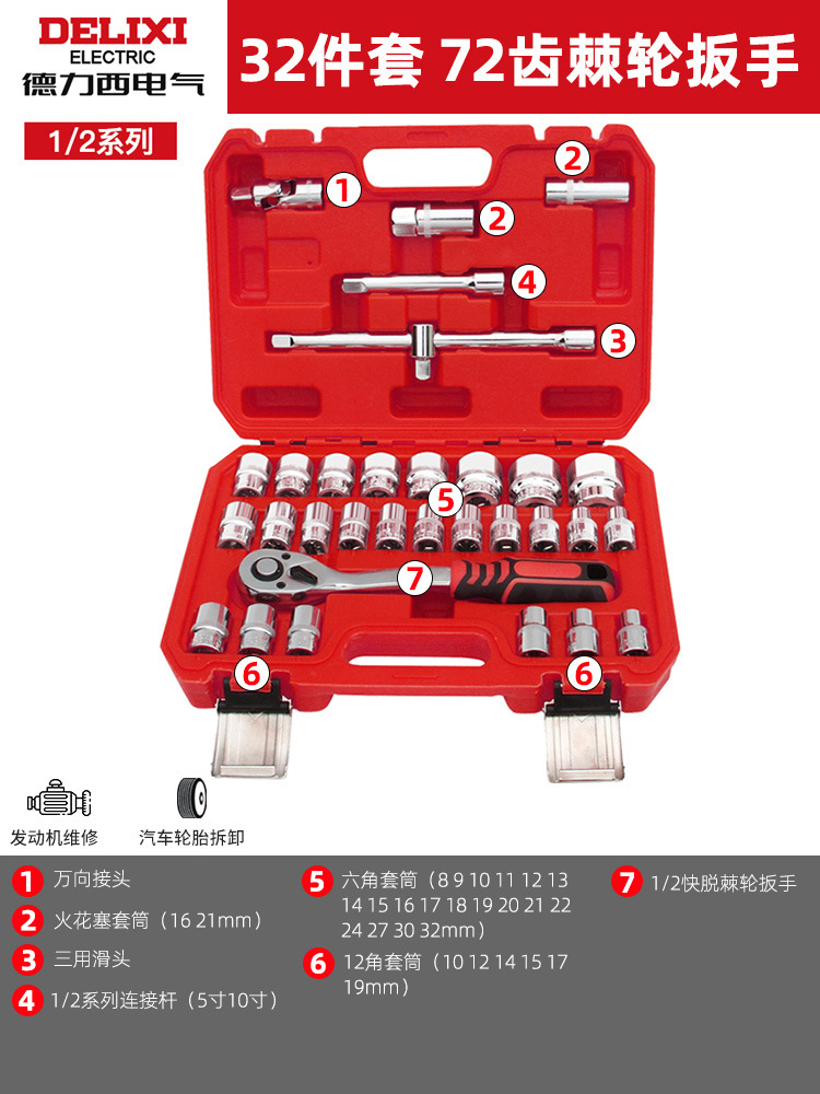• Delixi Electric-[72톱니 곡선 핸들 래칫] 32피스 소켓 세트