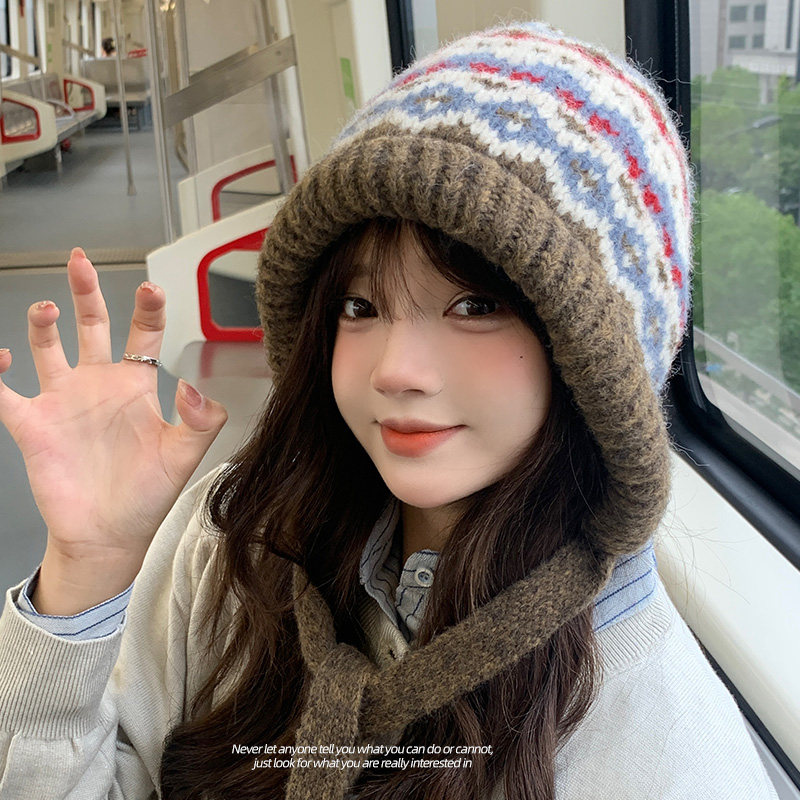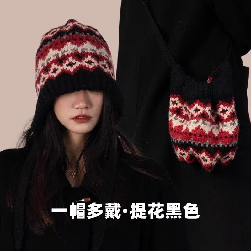 페어 아일 스타일 니트 모자 여성용 겨울 바라클라바 모자 겸용 가방 따뜻한 울 모자 자카드