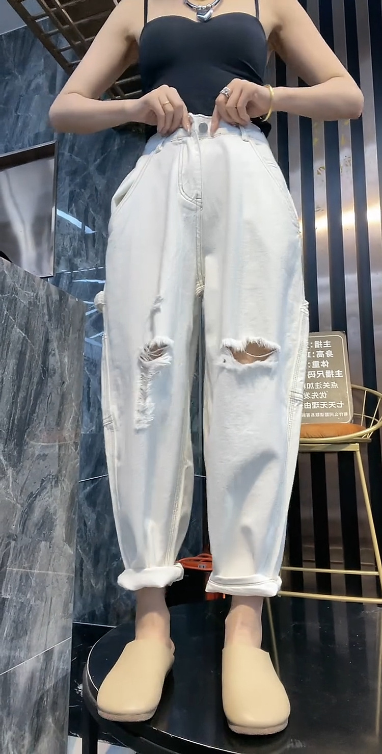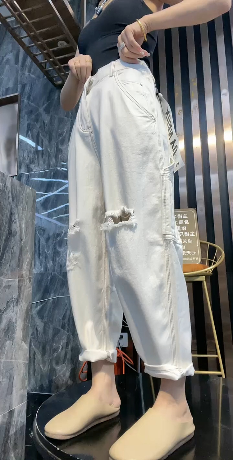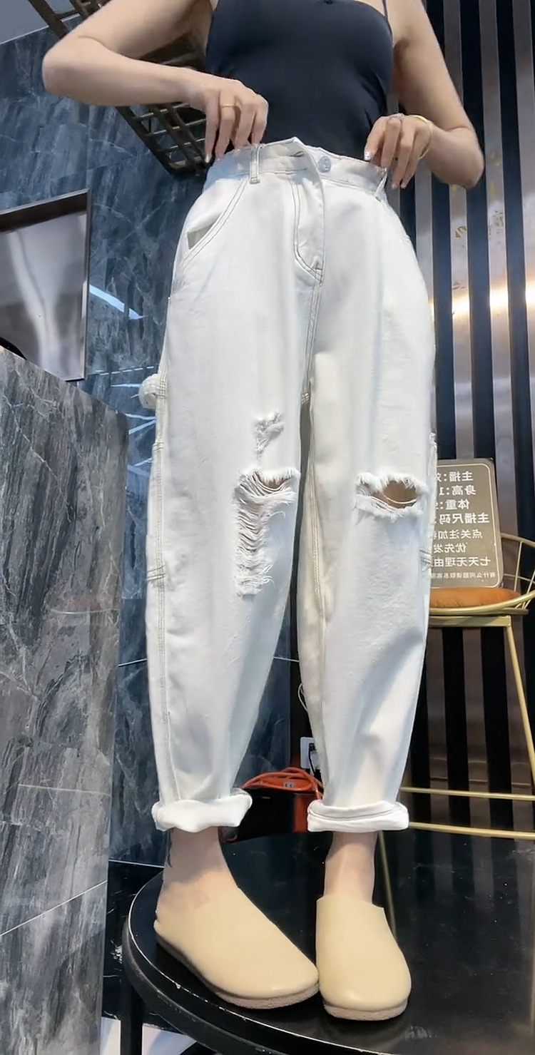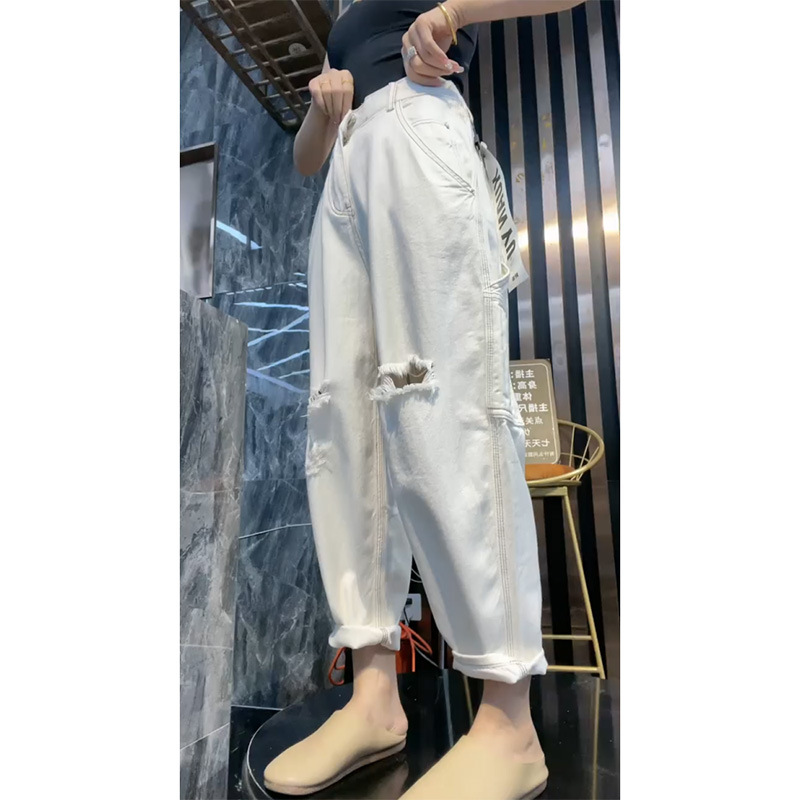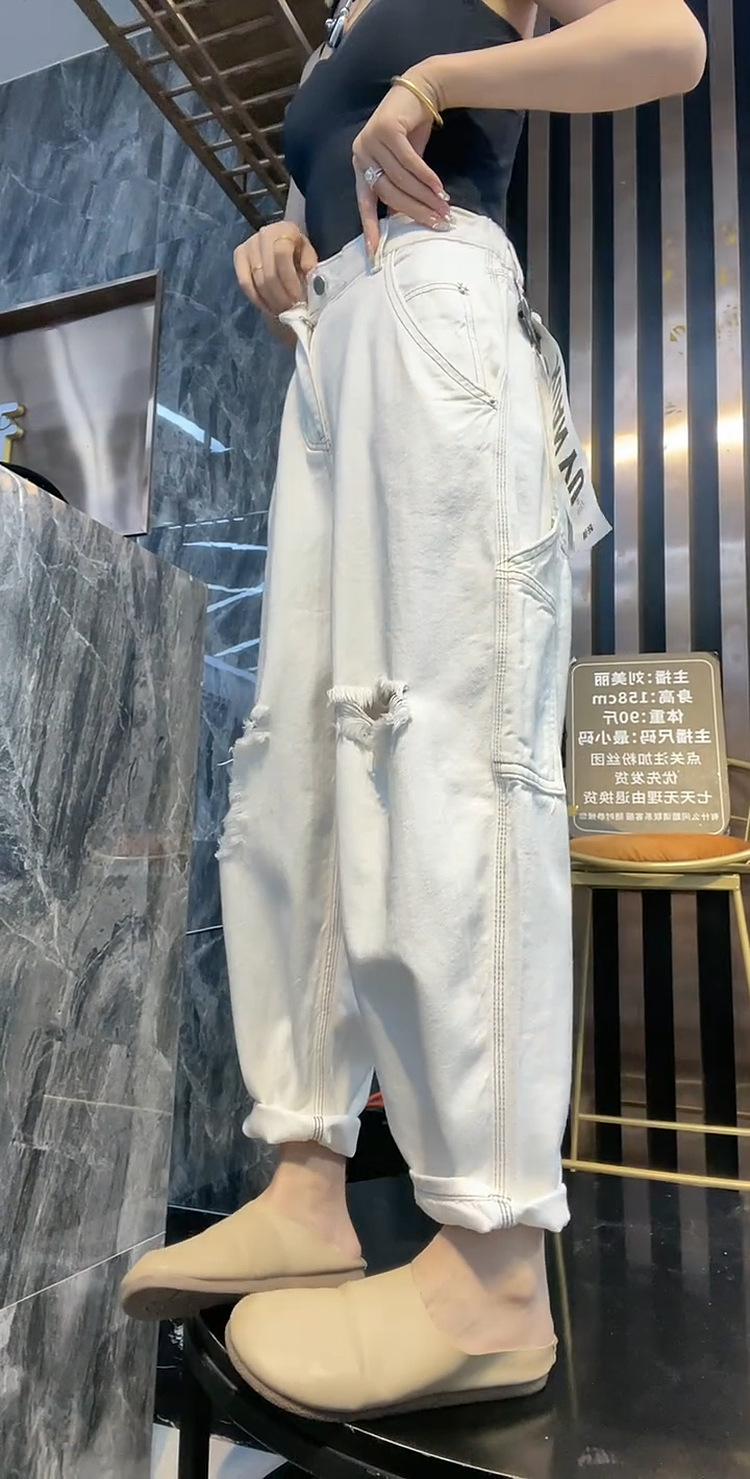 배 모양의 그림 플러스 사이즈 흰색 구멍 Harlan 청바지 여성의 봄과 가을 느슨한 슬리밍 크롭 와이드 레그 바지스토어 가기