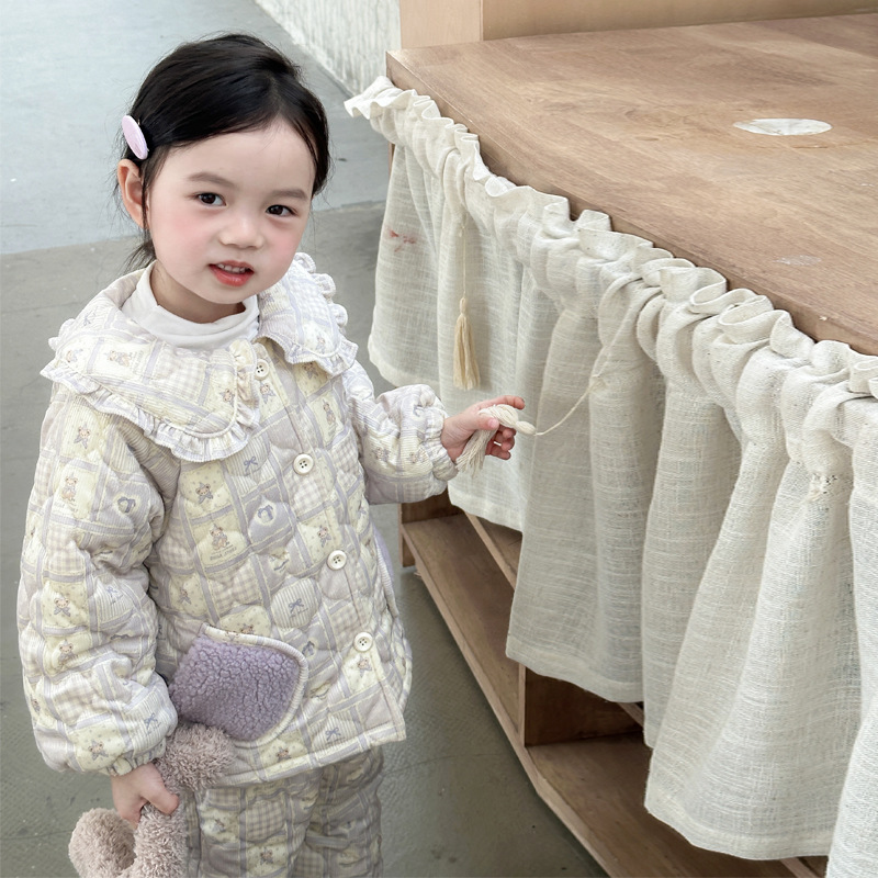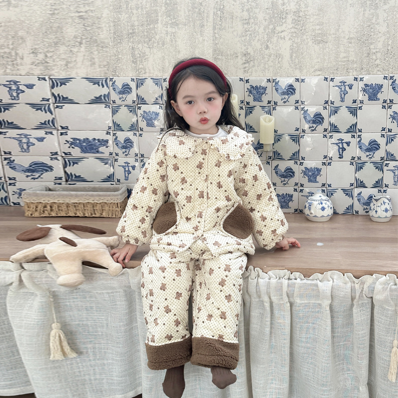 겨울 소녀 새로운 전신 인쇄 잠옷 기모 두꺼운 3 층 퀼트 유행 어린이 홈 의류 및 바지 세트