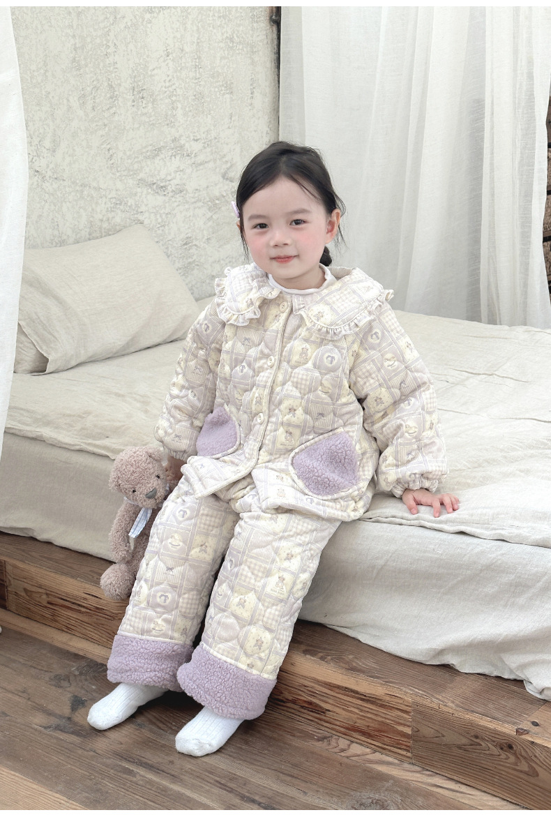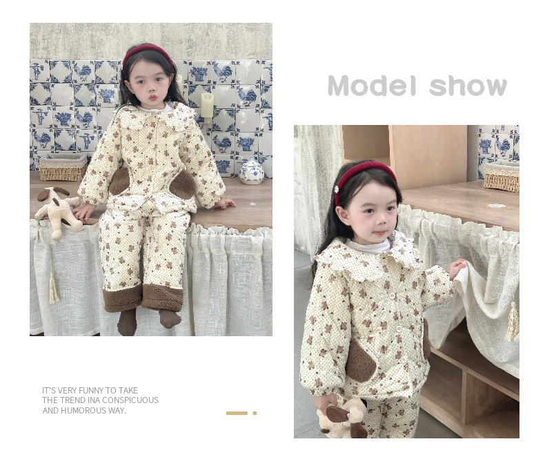 겨울 소녀 새로운 전신 인쇄 잠옷 기모 두꺼운 3 층 퀼트 유행 어린이 홈 의류 및 바지 세트스토어 가기