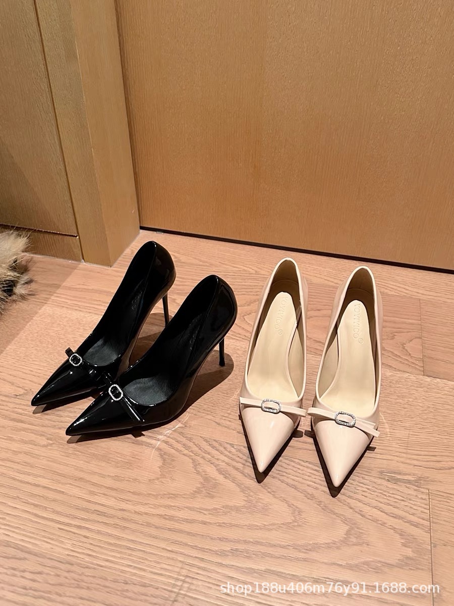 [재고] 새로운 블랙 우아한 특허 가죽 하이힐 여성 프랑스 틈새 디자인 스틸레토 힐 포인팅 싱글 신발 여성