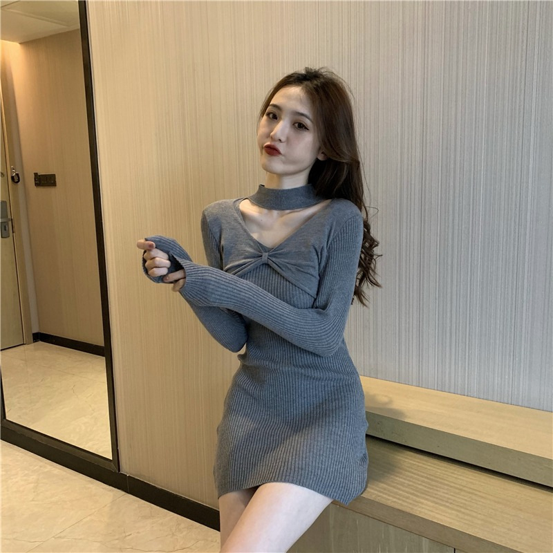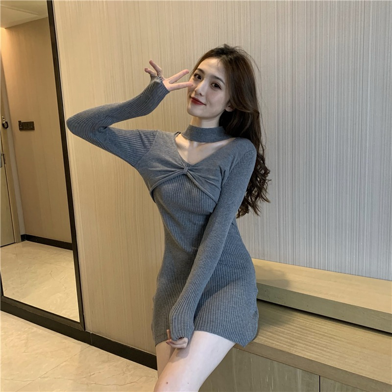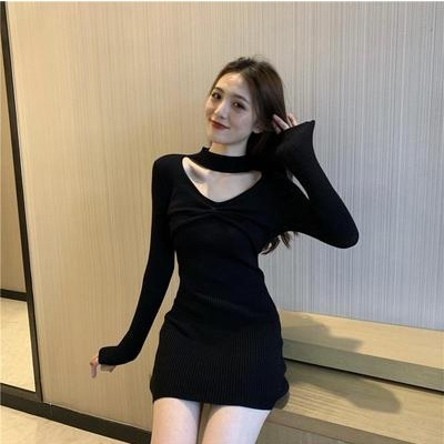 봄과 가을 새로운 우아한 교수형 목 중공 디자인 모든 경기 슬림 핏 원피스 타이트 허리 타이트한 힙베이스 스커트