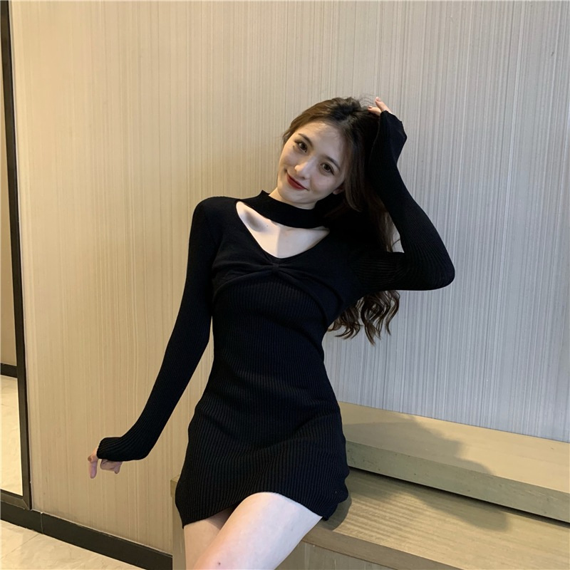 봄과 가을 새로운 우아한 교수형 목 중공 디자인 모든 경기 슬림 핏 원피스 타이트 허리 타이트한 힙베이스 스커트스토어 가기