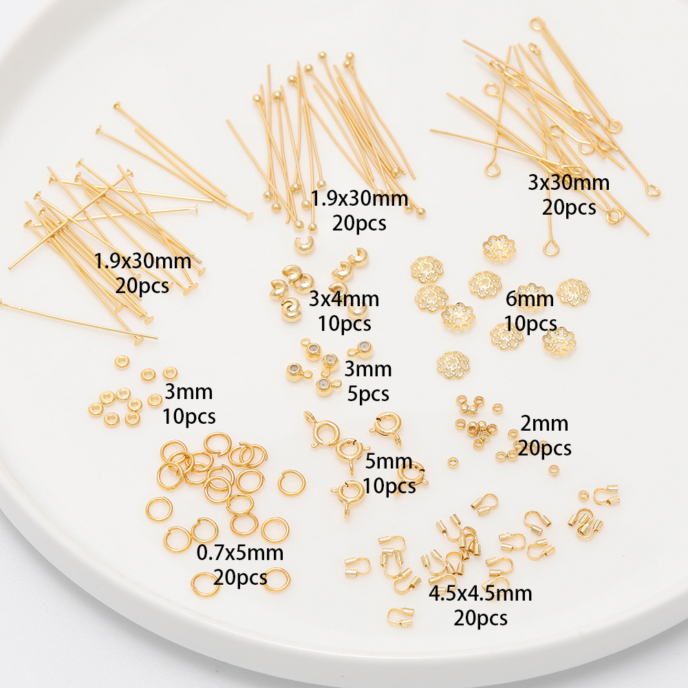 包装:(30mm平针20个+30mm球头针20个+30mm9字针20个+3mm圆片10个+3mm开口珠10个+3mm有吊胶珠5个+6mm花托10个+5mm单圈20个+5mm弹簧扣10个+2mm定位珠20个+4.5mmU型管20个)1套