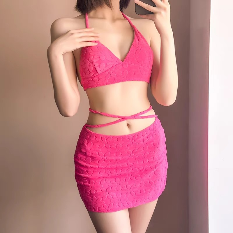 새로운 스타일 신선한 단색 비키니 Ins 스타일 작은 가슴 흰색 수건 소재 해변 휴일 수영복 여성 3 종 세트스토어 가기