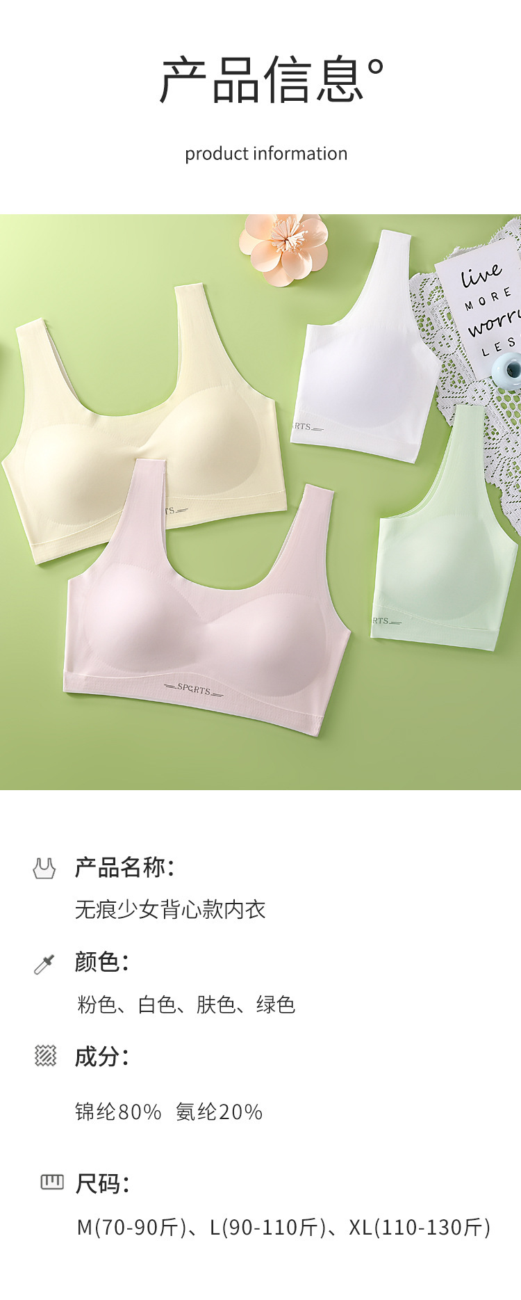 중학교 학생을위한 청소년 브래지어 새 소녀 고정 컵 스포츠 조끼 얇은 속옷