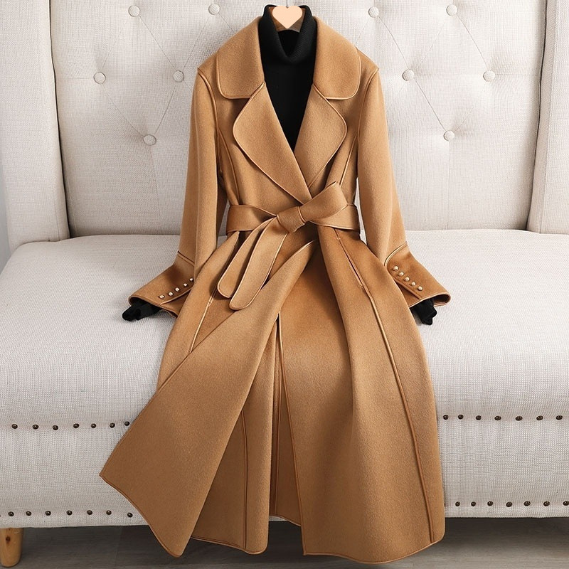 2024 년 가을과 겨울을위한 엣지 양면 님 블던 코트가있는 여성용 중간 길이의 코트 새로운 슬림 핏 슬리밍 하이 엔드 울 코트