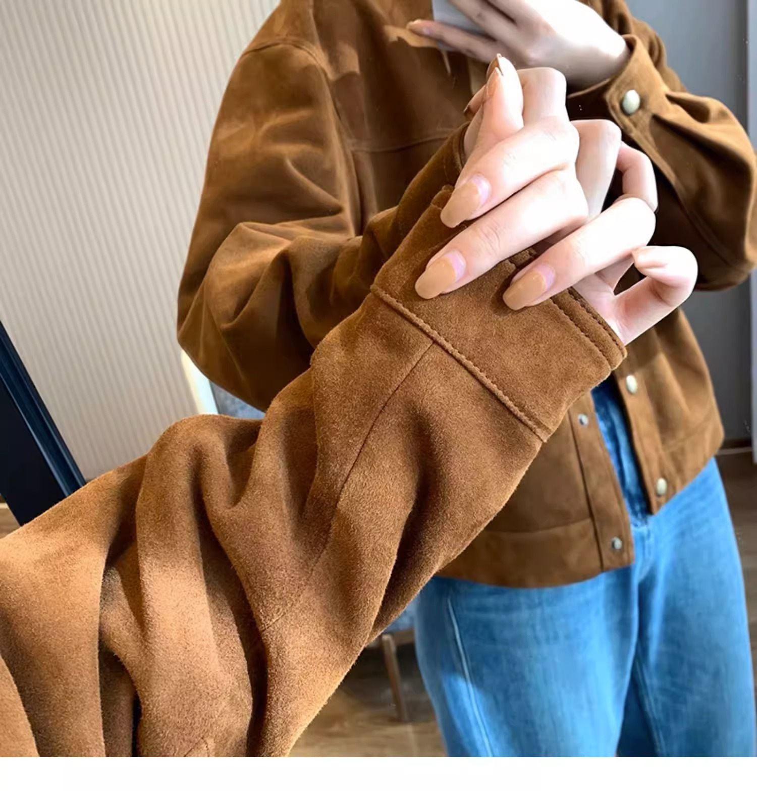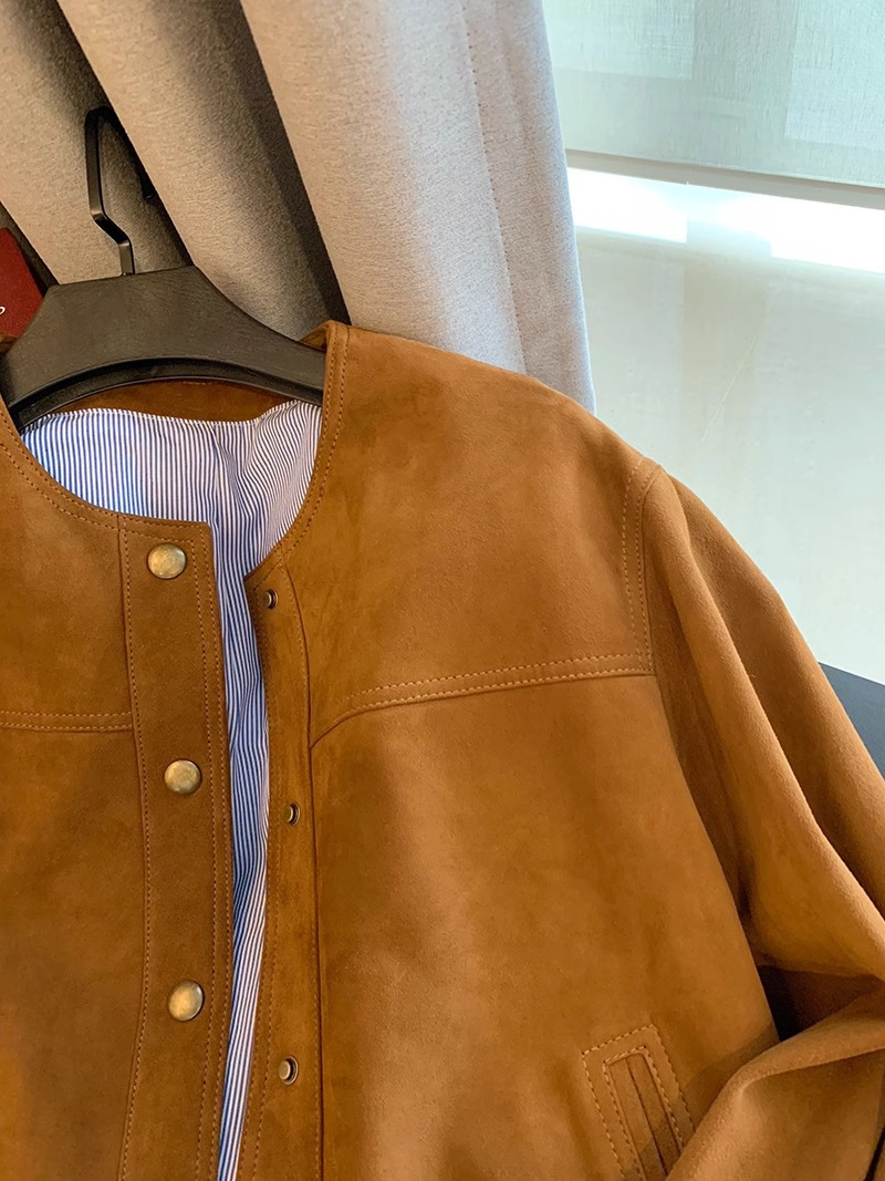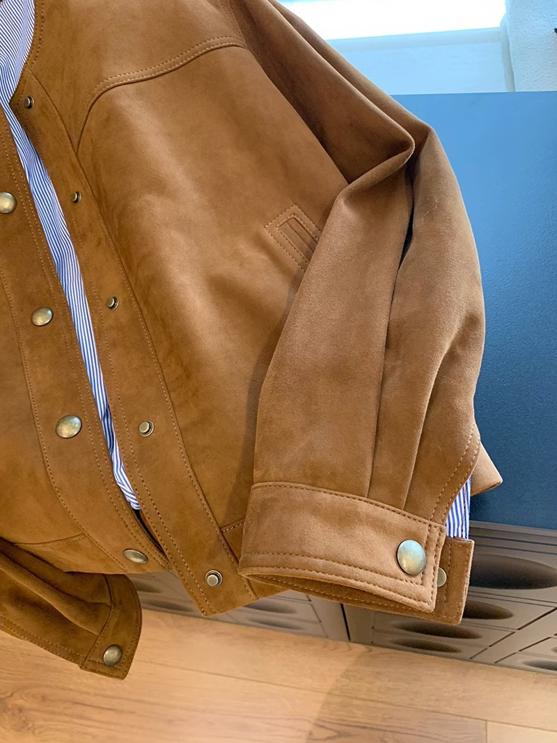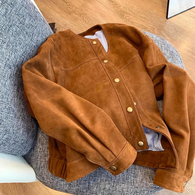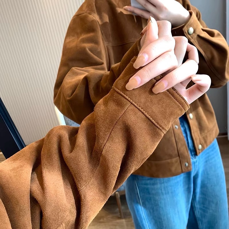 高级感棕色麂皮短外套女复古2024新款设计感美式休闲潮牌夹克上衣