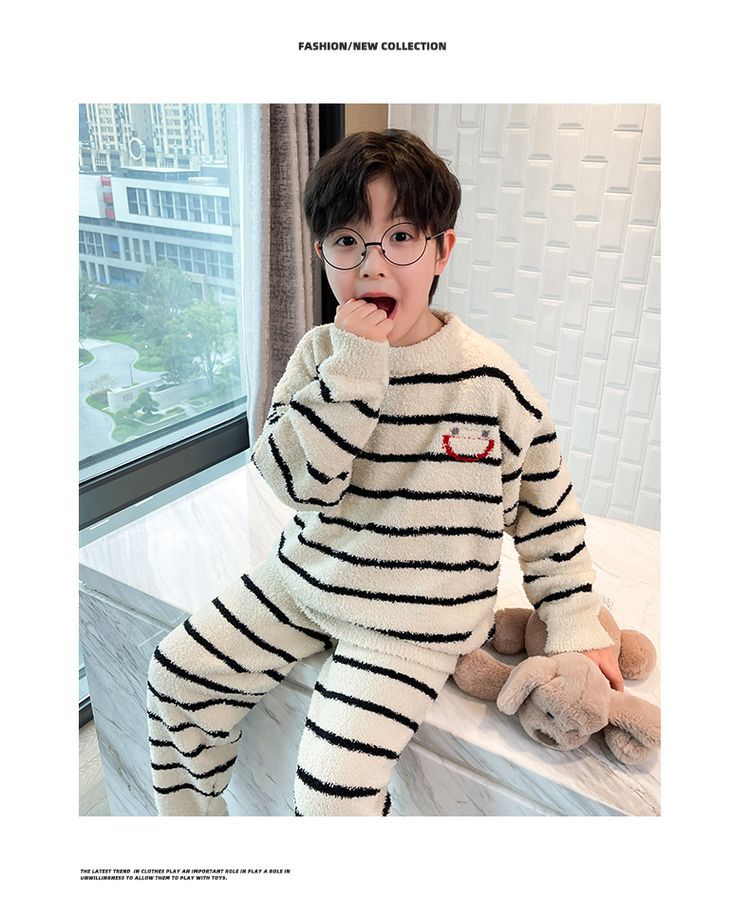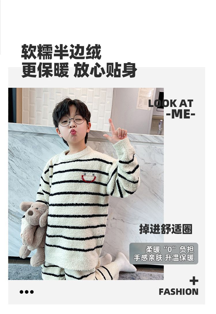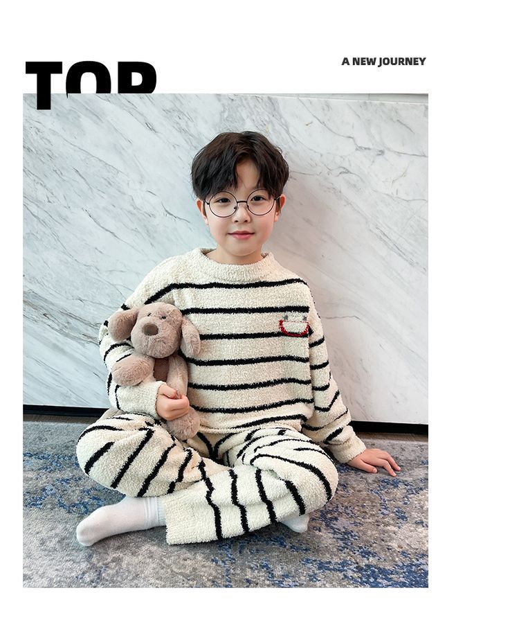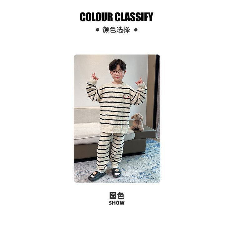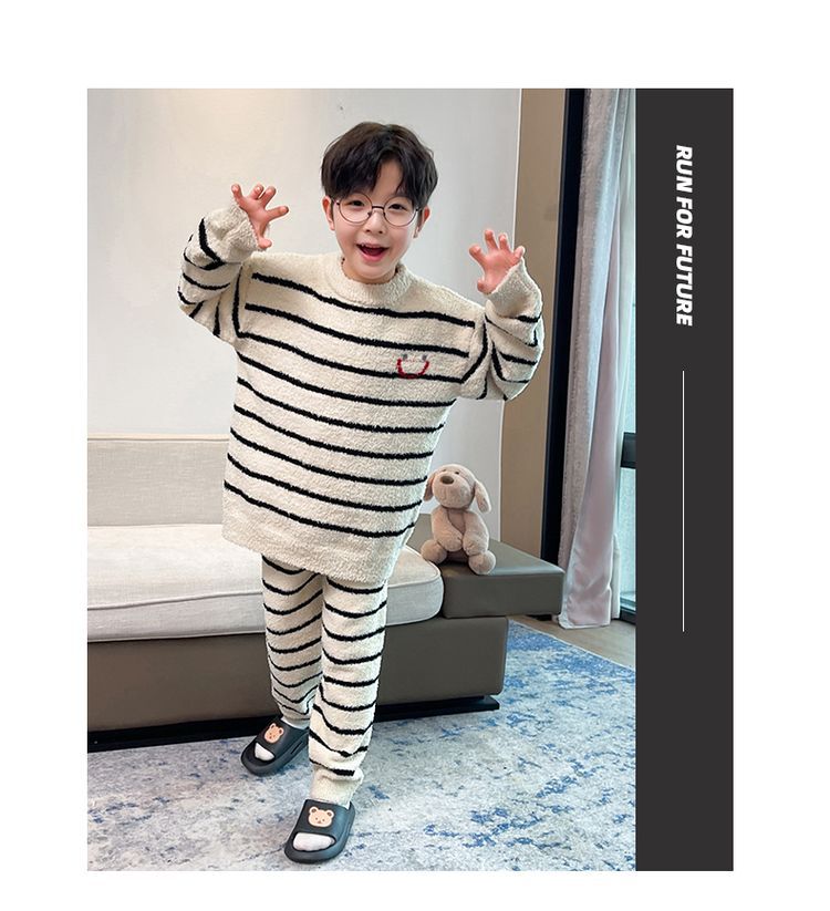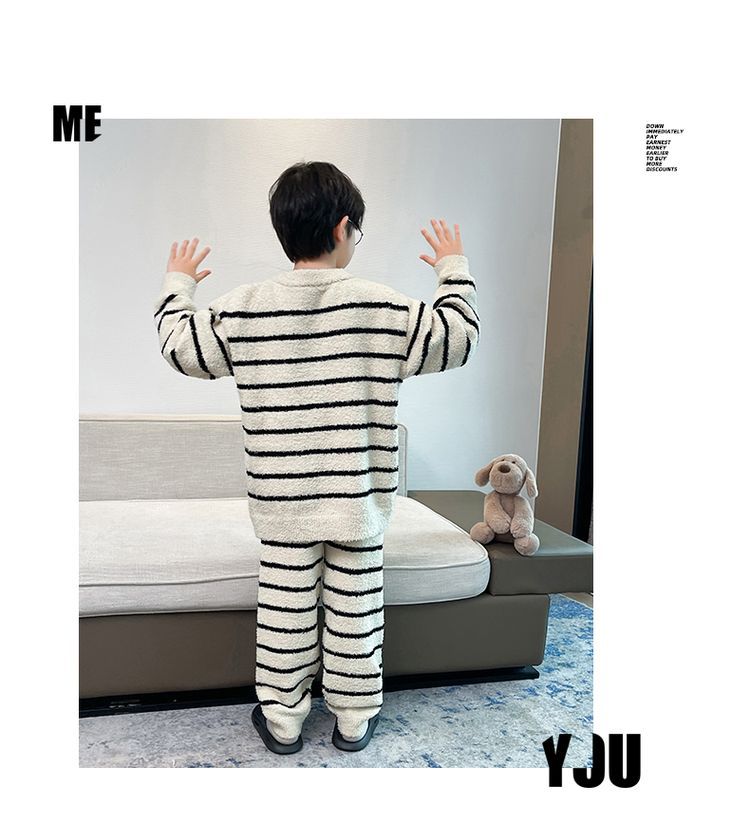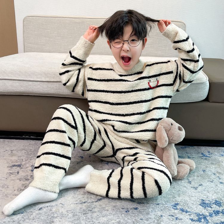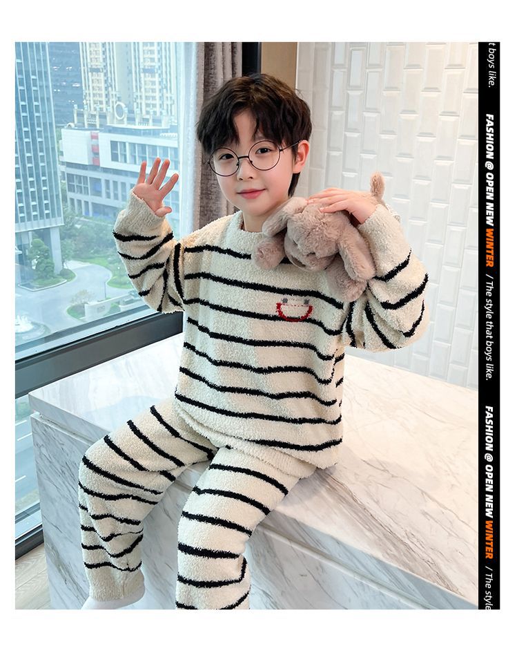 소년 줄무늬 홈 옷 두꺼운 반쪽 벨벳 캐주얼 풀오버 가을 및 겨울 소년 게으른 스타일 외부 파자마 세트