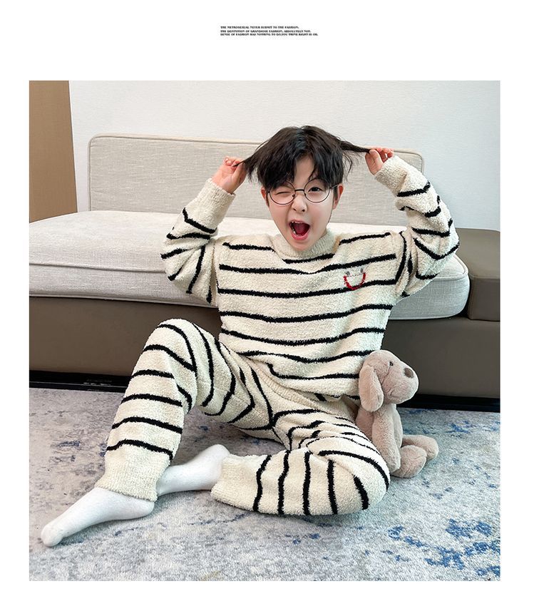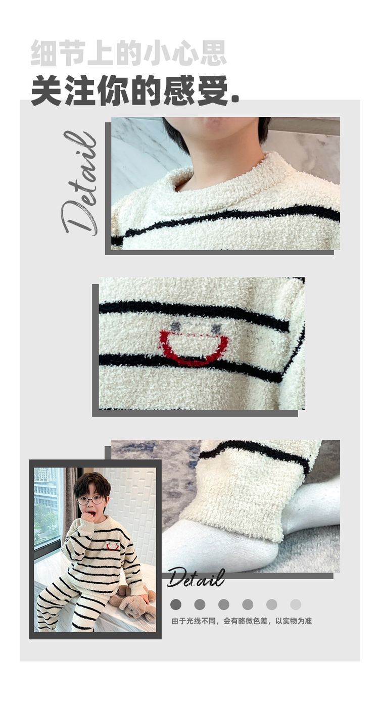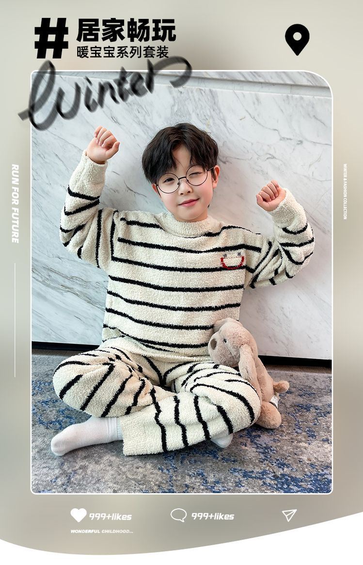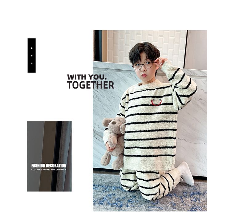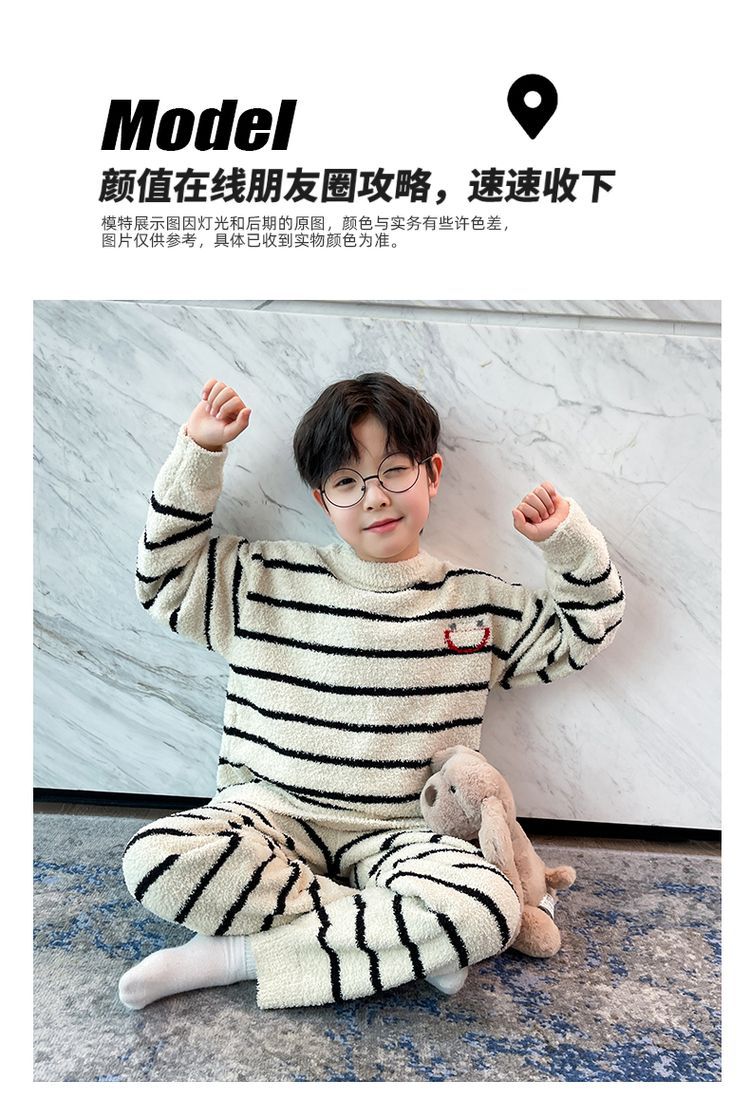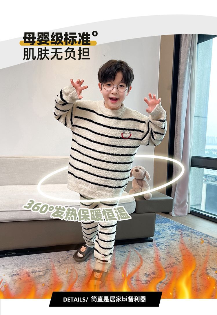 소년 줄무늬 홈 옷 두꺼운 반쪽 벨벳 캐주얼 풀오버 가을 및 겨울 소년 게으른 스타일 외부 파자마 세트