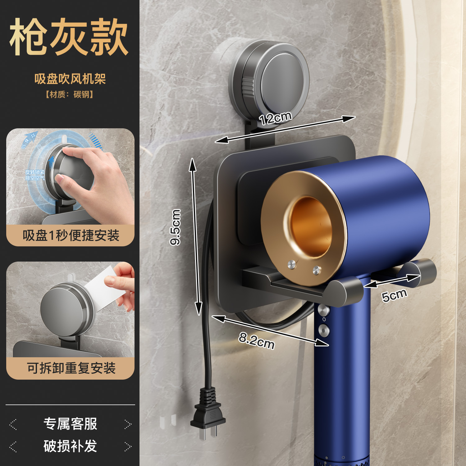 • [건그레이 헤어드라이어 홀더] 몇 초 만에 설치 가능한 흡입 컵(부드러운 쿠션 포함)