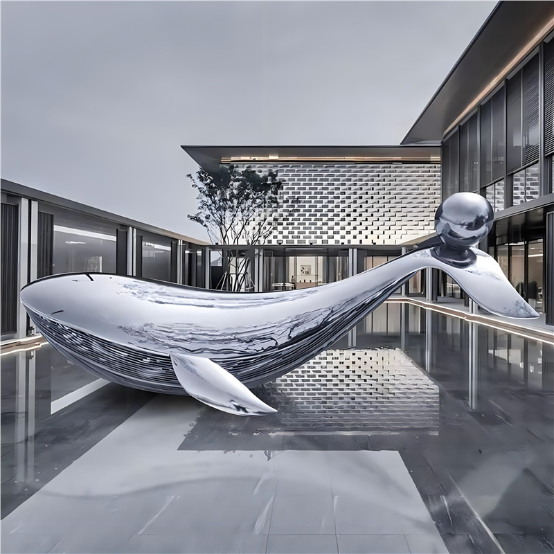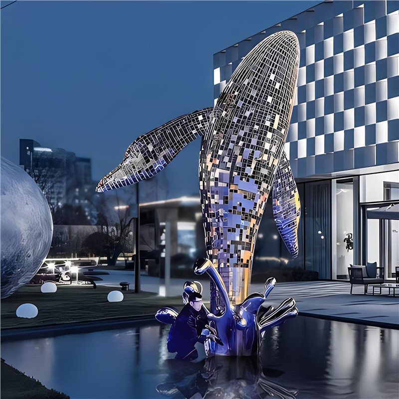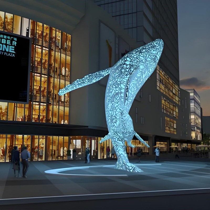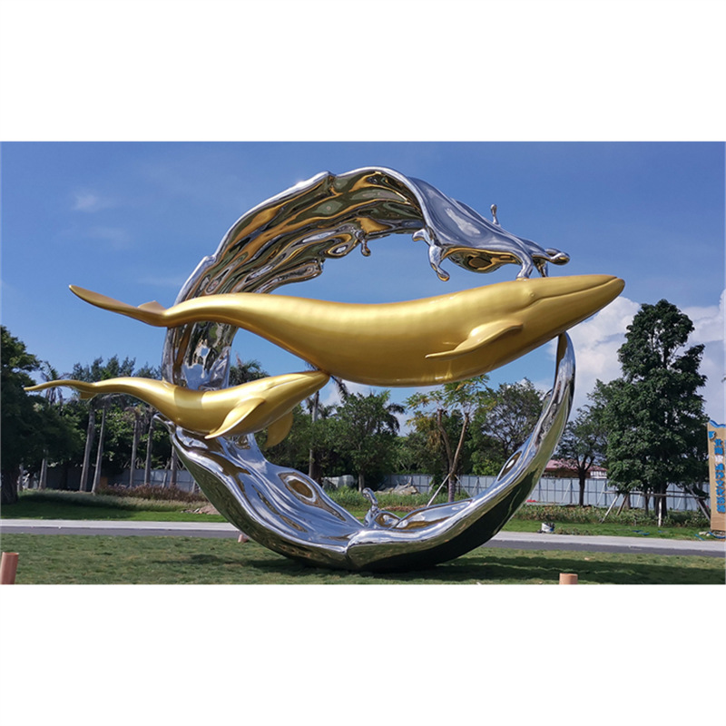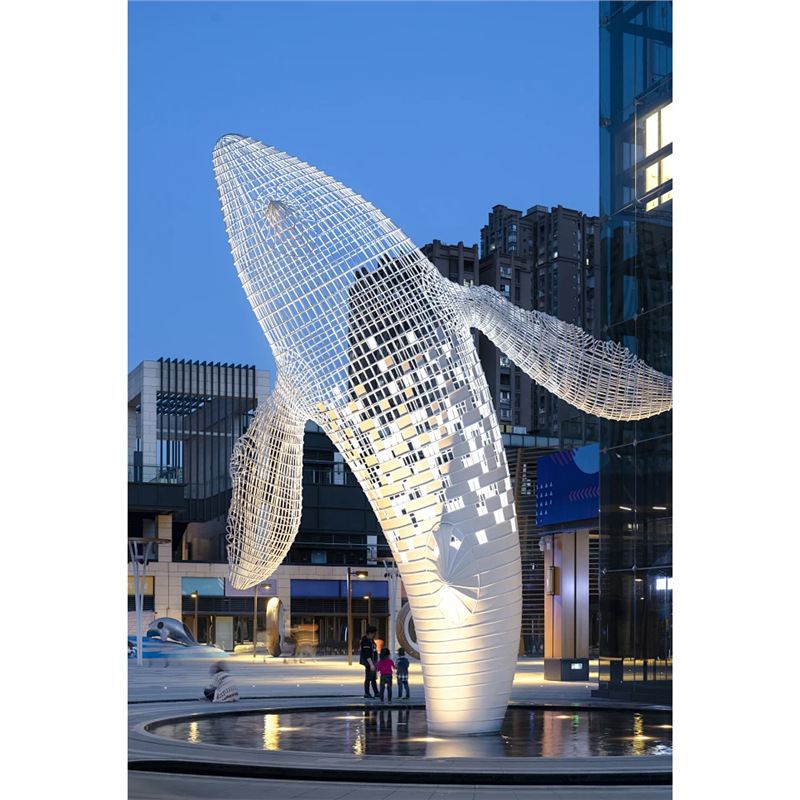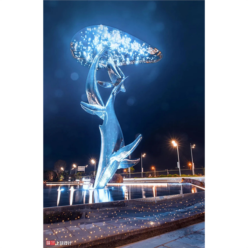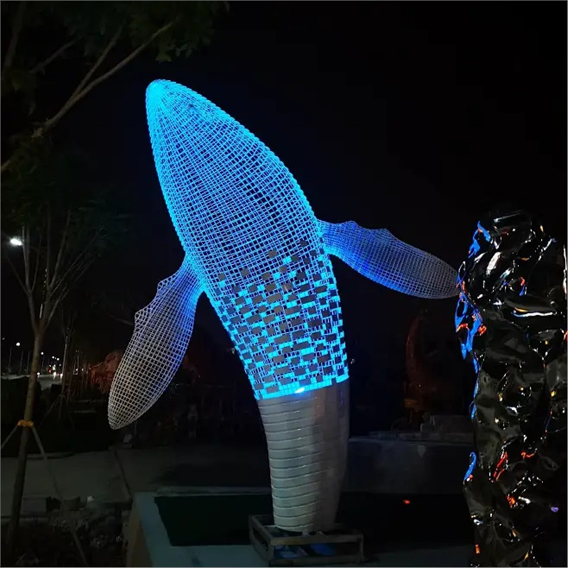 대형 스테인레스 스틸 고래 돌고래 조각 도시 건물 랜드마크 풍경 빛나는 중공 파도 물고기 장식품스토어 가기