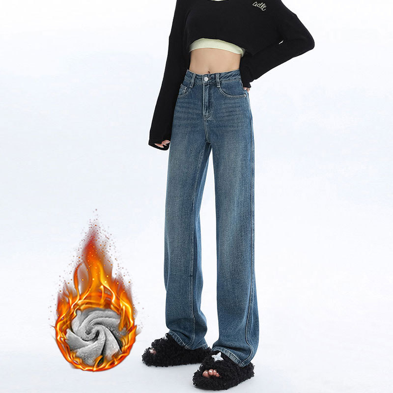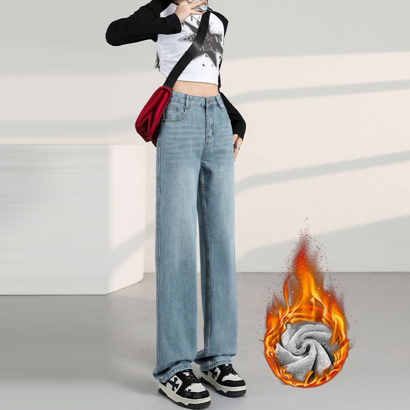 육식 좁은 데님 넓은 다리 바지 여성의 가을과 겨울 기모 따뜻한 높은 허리 스트레이트 느슨한 두꺼운 바닥 바지스토어 가기