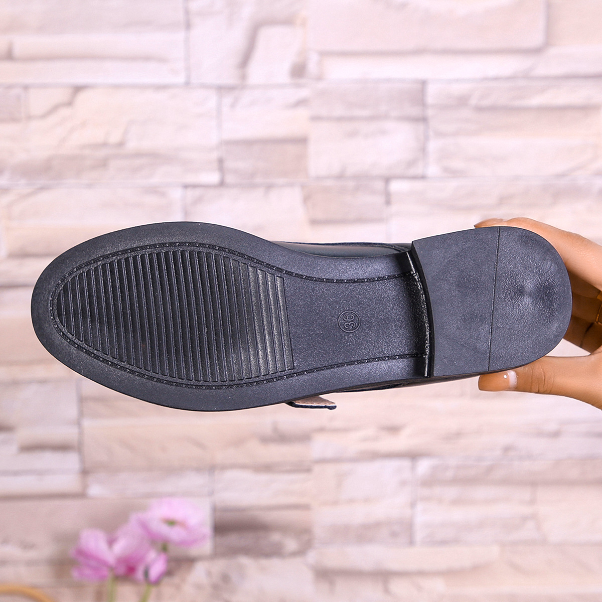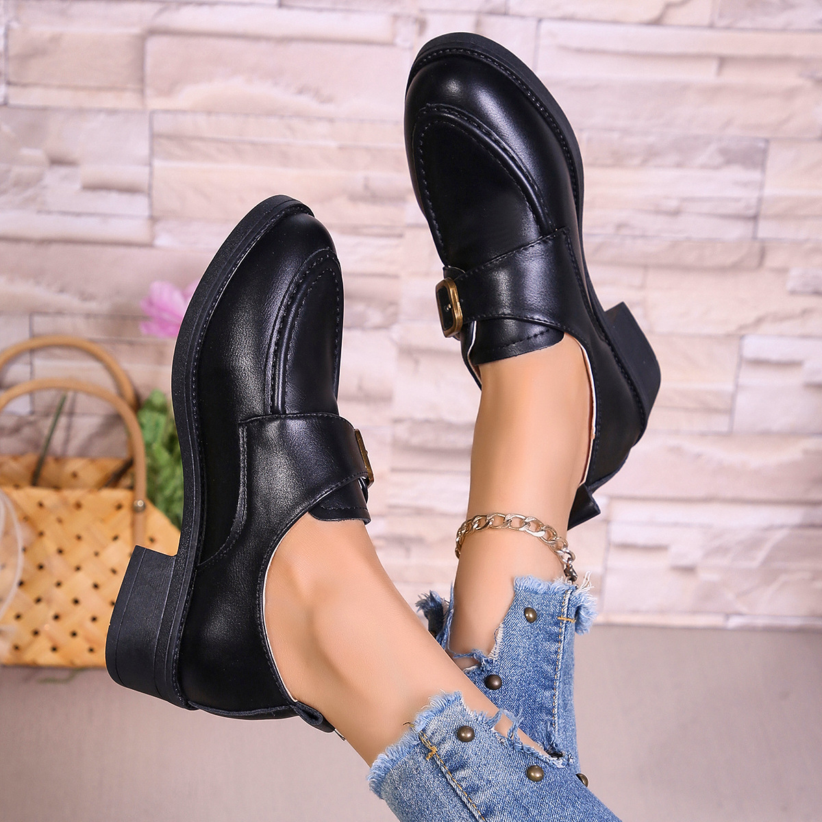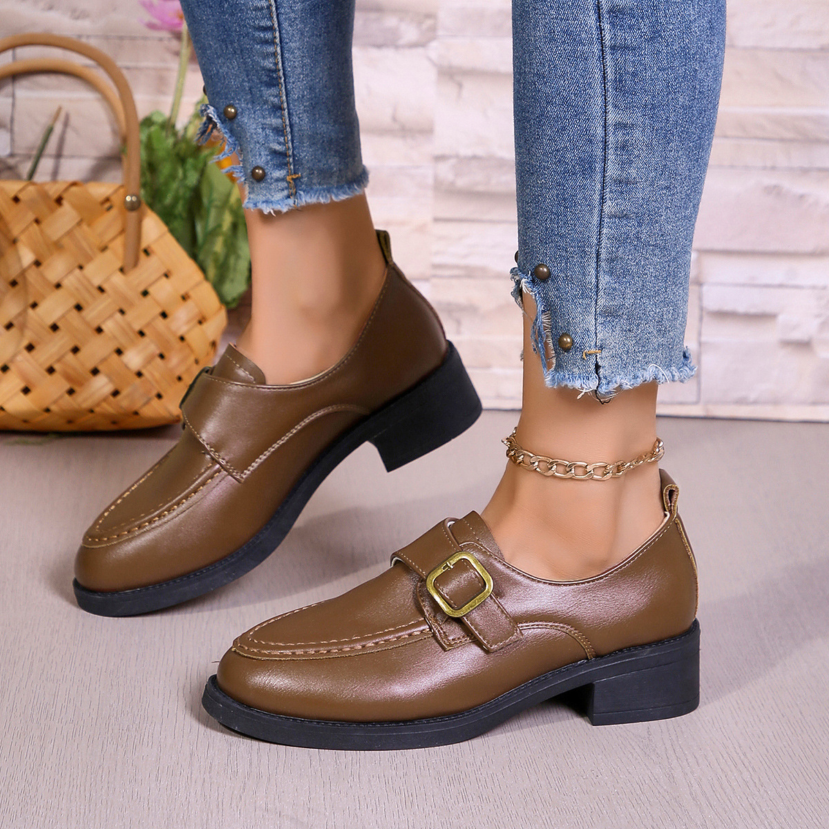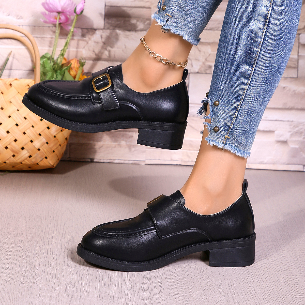 2024 봄과 가을 새로운 로우 힐 청키 힐 신발 여성용 영국 스타일 슬립 온 로퍼 라운드 토메 가죽 신발 벨트 버클스토어 가기