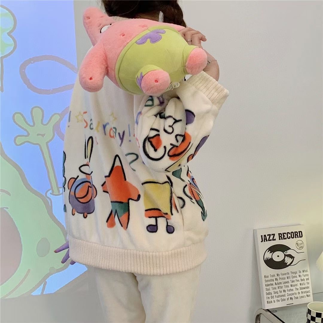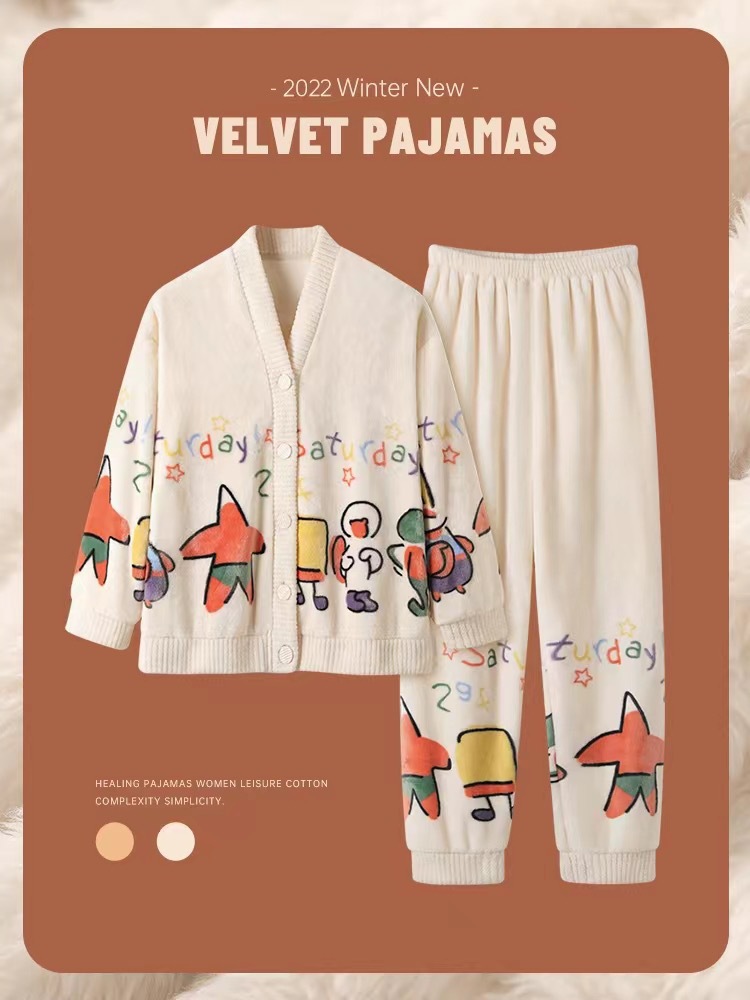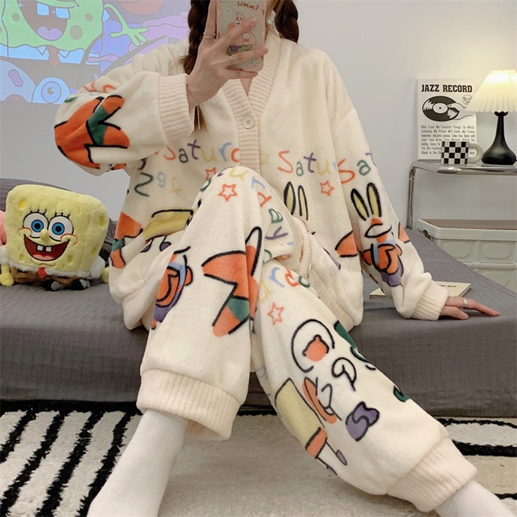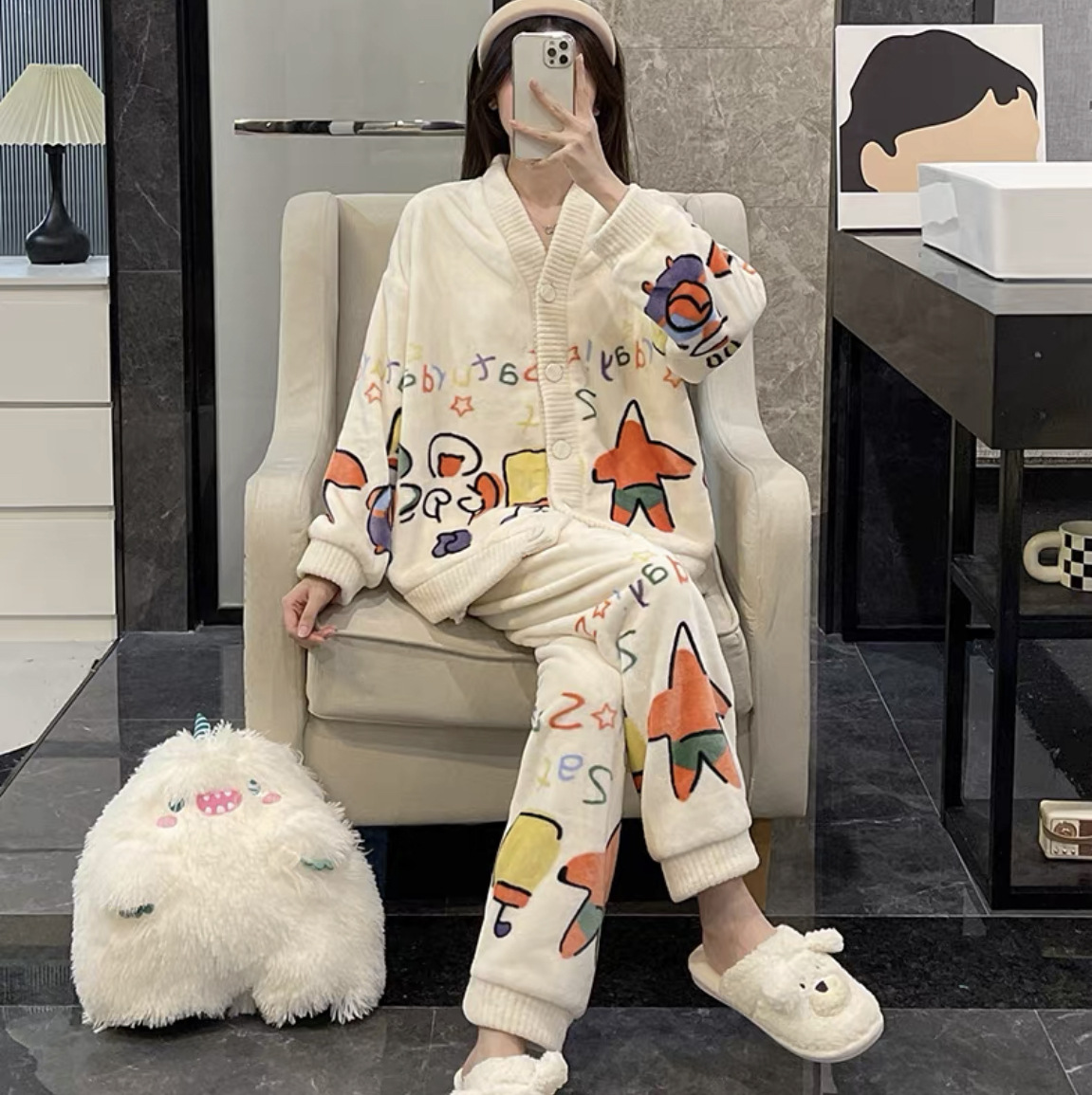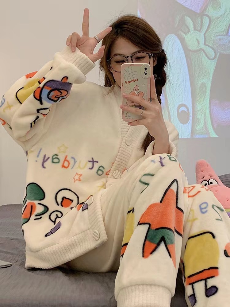 PaiDa 스타 잠옷 세트 여성의 가을과 겨울 두꺼운 새로운 귀여운 인쇄 산호 양털 만화 달콤한 카디건 투피스 세트