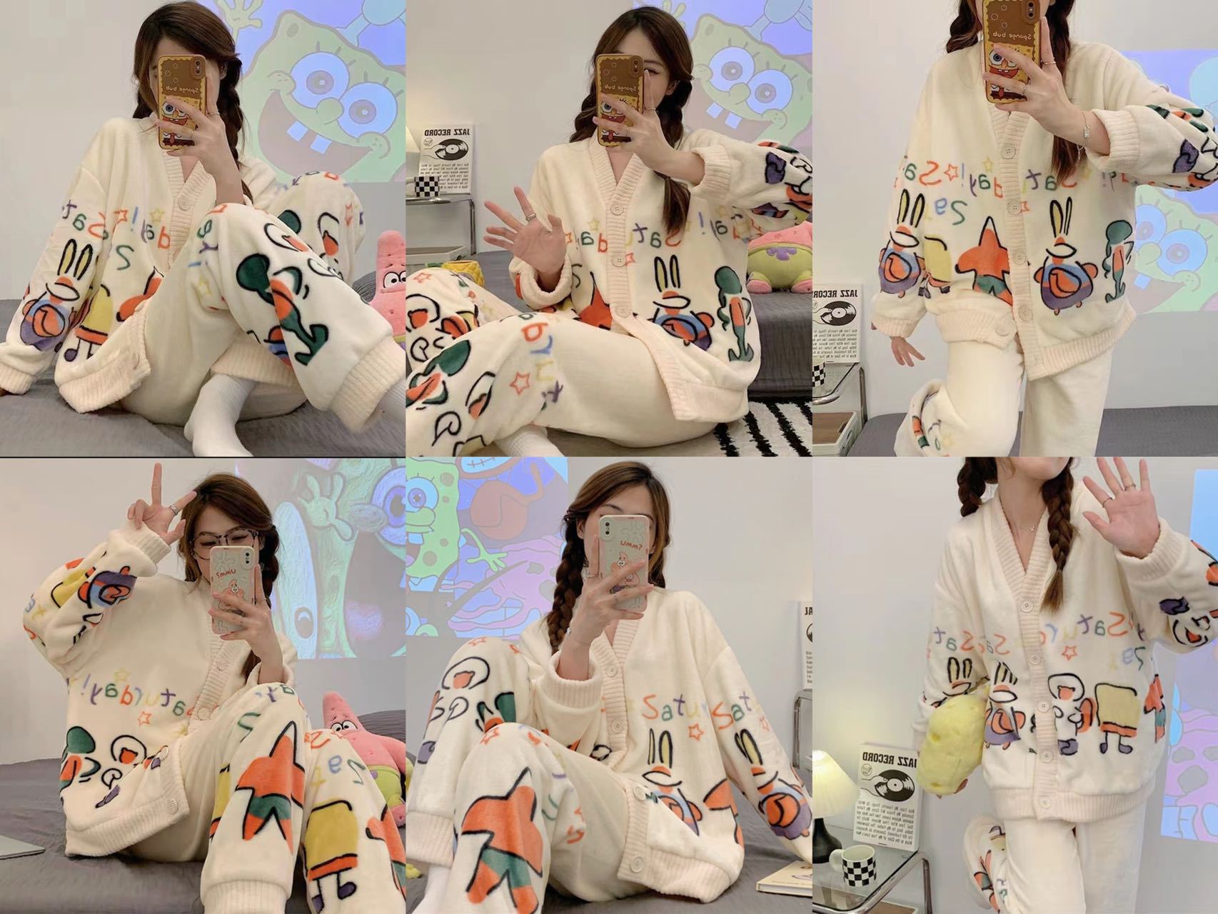 PaiDa 스타 잠옷 세트 여성의 가을과 겨울 두꺼운 새로운 귀여운 인쇄 산호 양털 만화 달콤한 카디건 투피스 세트스토어 가기