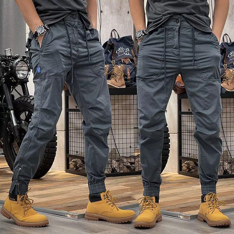 봄 새로운 미국 스타일 레트로 크라우드 워크 바지 남성용 트렌디 한 Elastomic 허리 지퍼 간단한 대형 포켓 다리 번들 캐주얼 바지스토어 가기