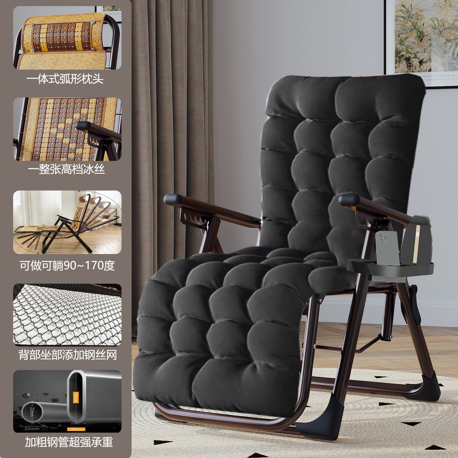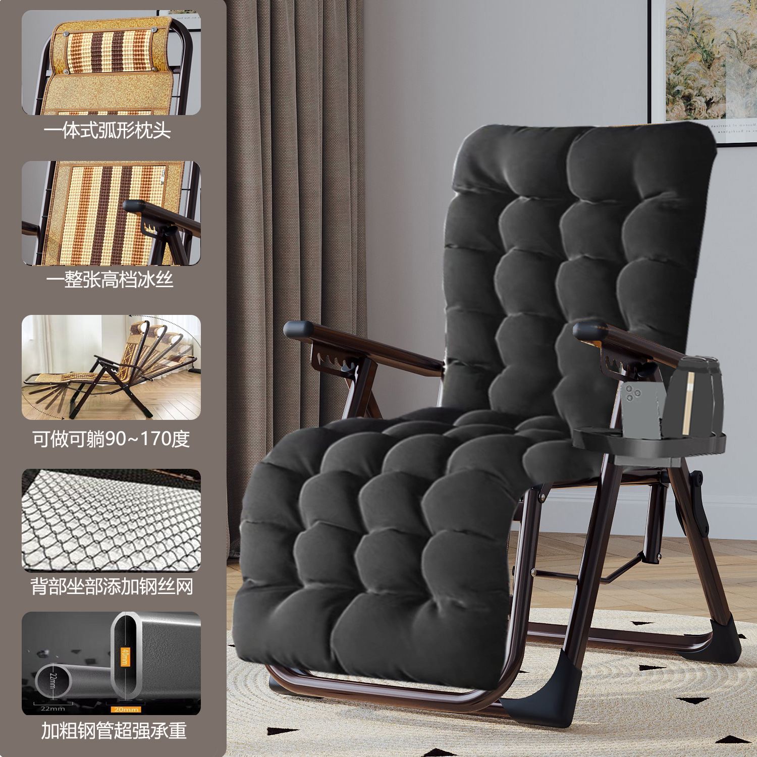 • [매우 두꺼운 사각 튜브] 스틸 메쉬 아이스 실크 의자 - 3가지 색상 + 컵 홀더 + 대형 화장솜 블랙