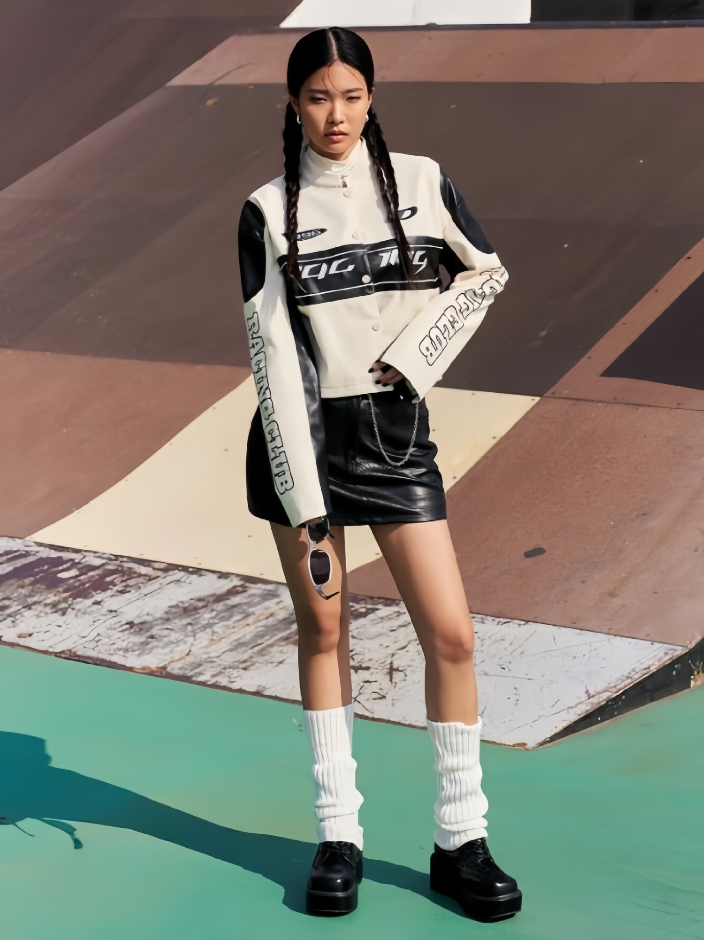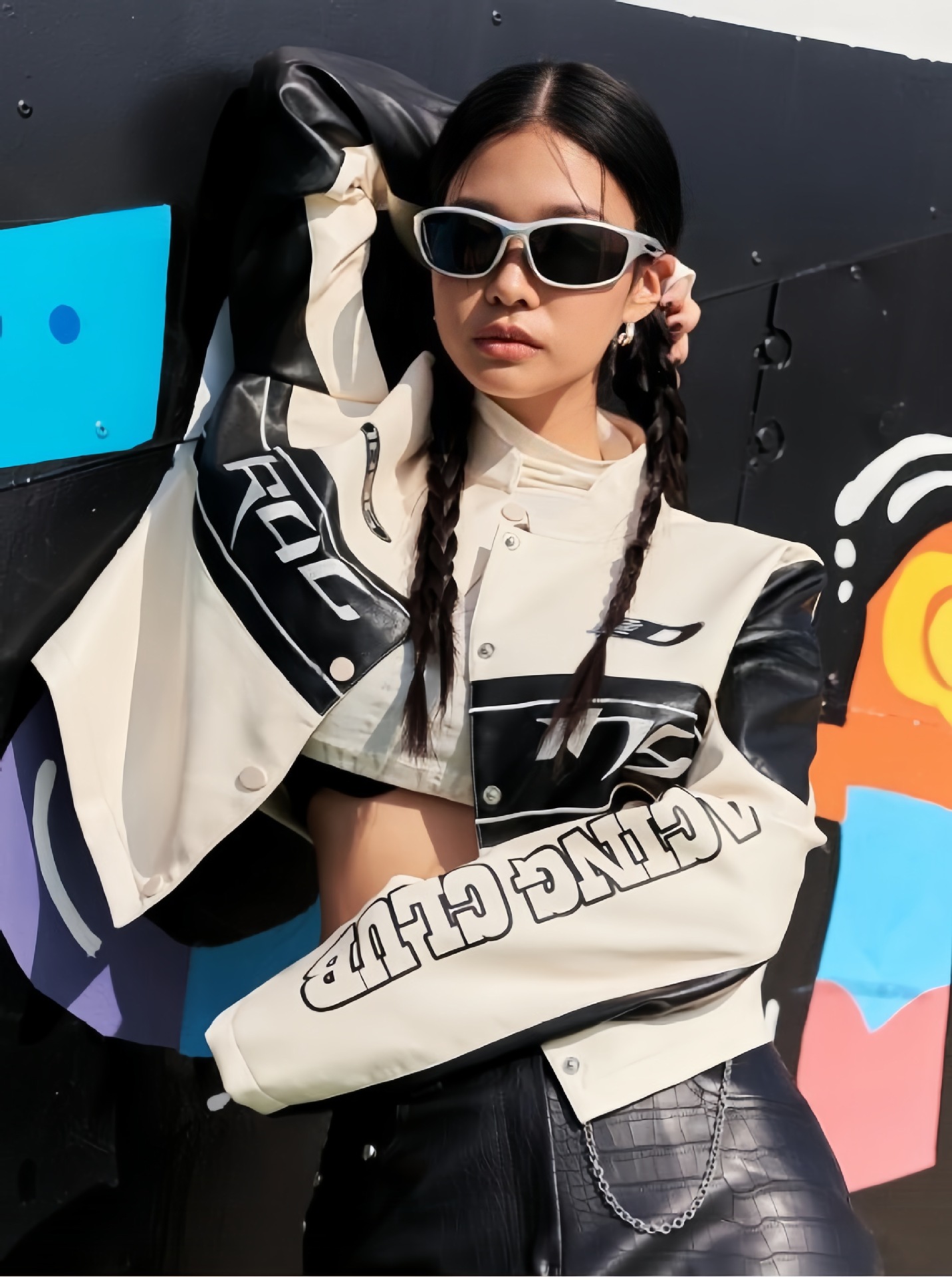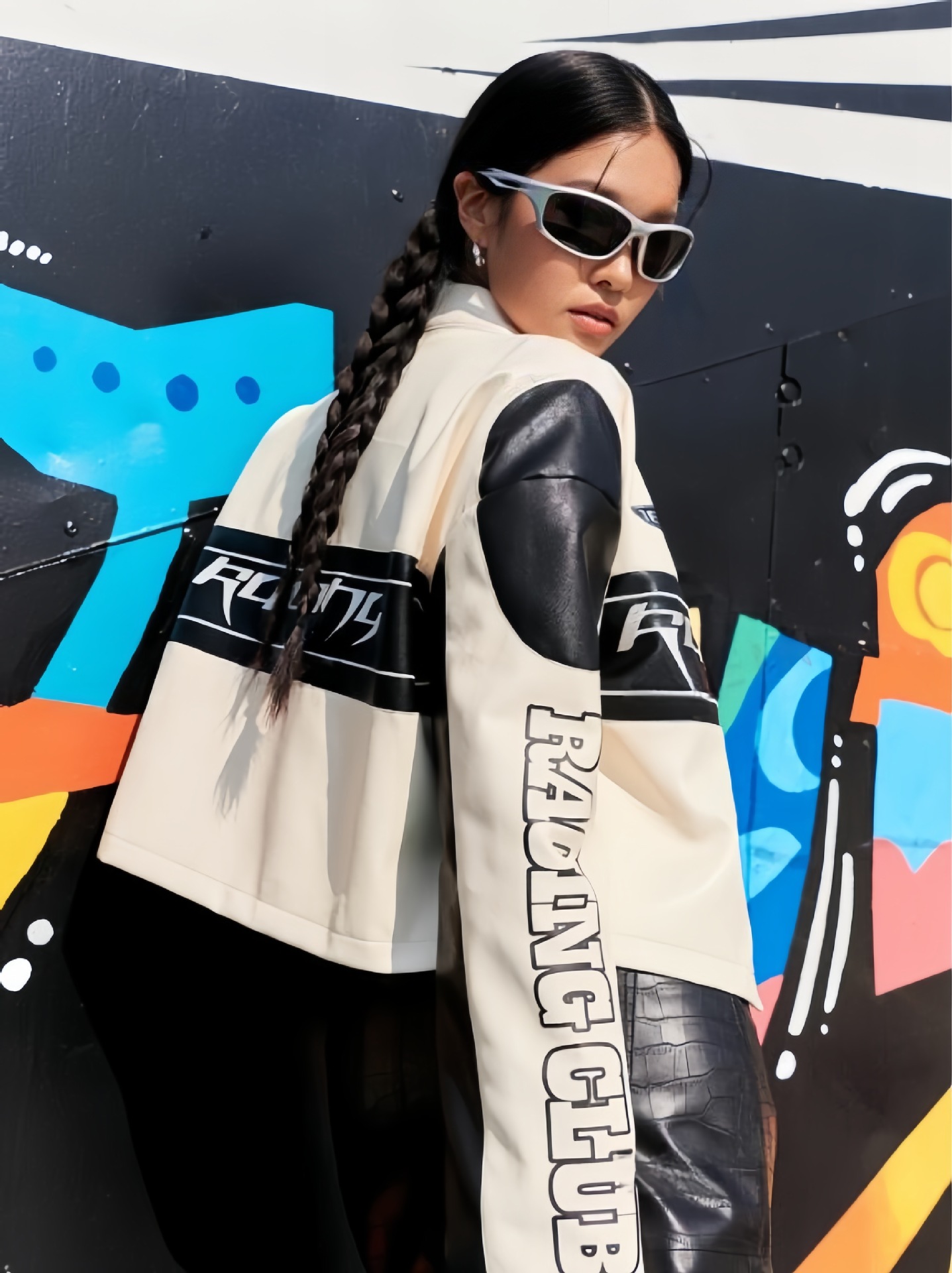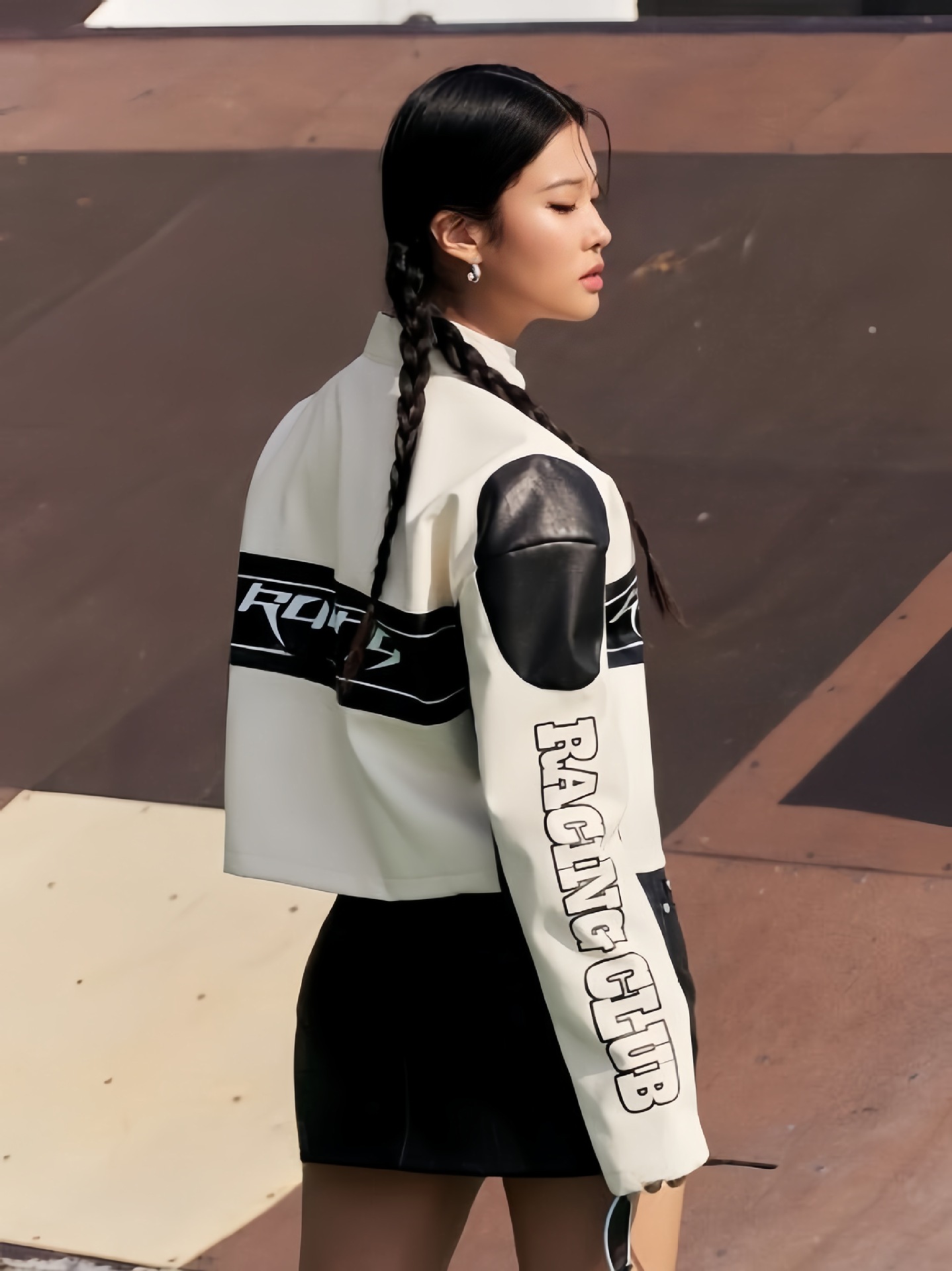 미국 스타일의 오토바이 편지 명암 컬러 가죽 최고 여성의 2024 가을과 겨울 새로운 독특한 유행 다크 버튼 수직 칼라 재킷 코트스토어 가기