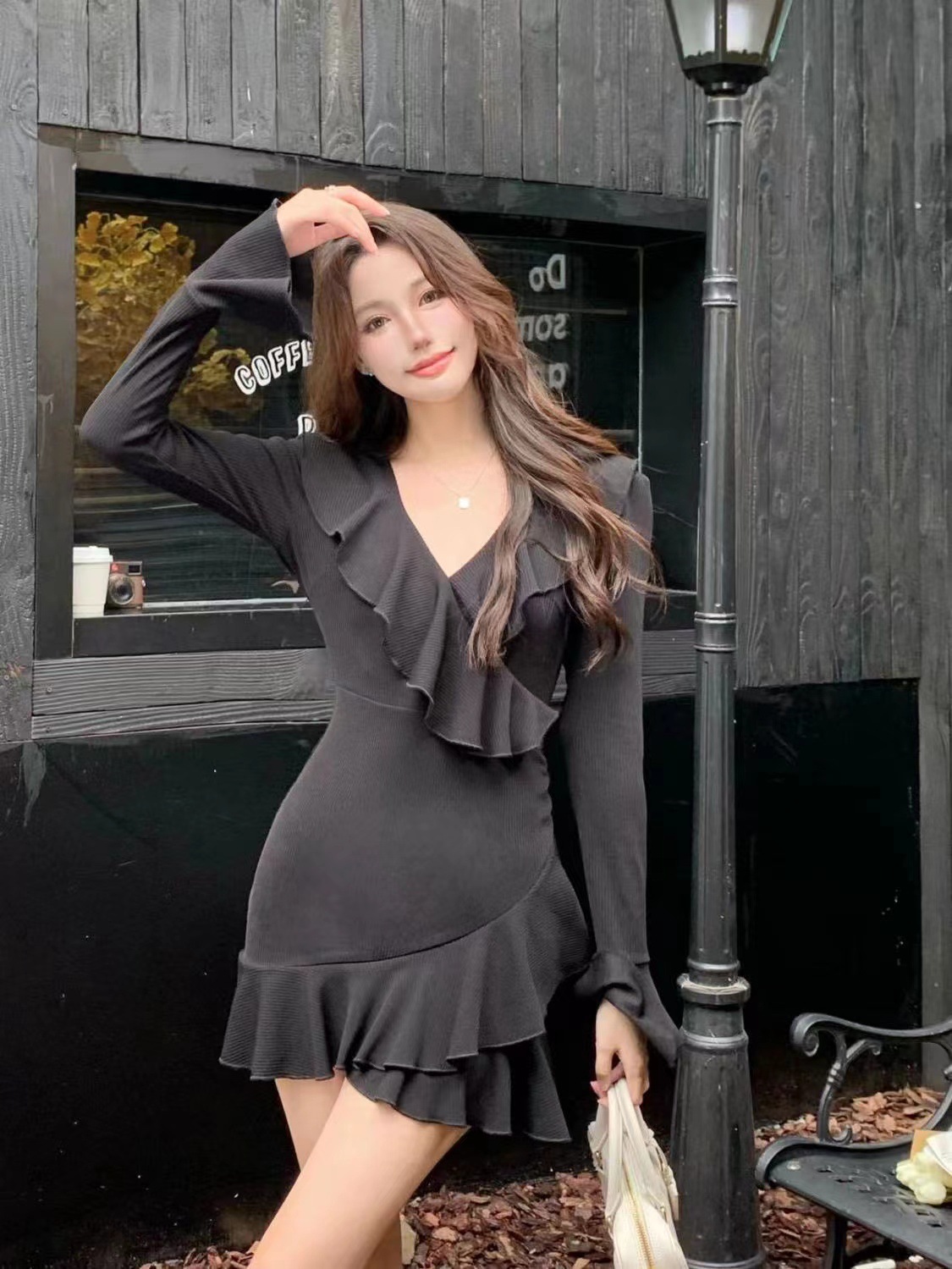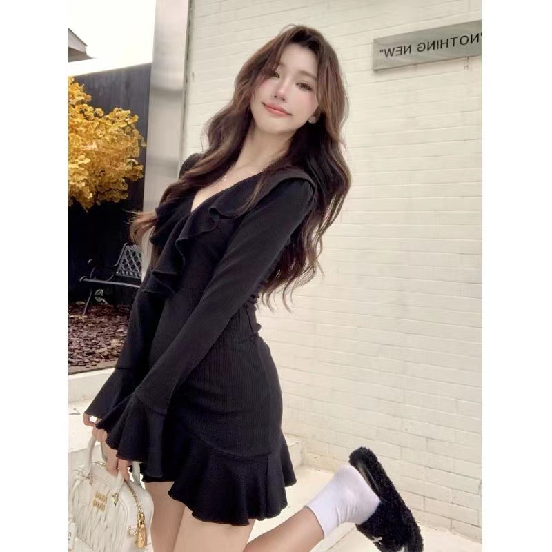 De Velvet Horn Sleeve 원피스 순수한 욕망 V-넥 러플 가을 및 겨울 인테리어 슬림 핏 틈새 우아한 블랙 스커트스토어 가기