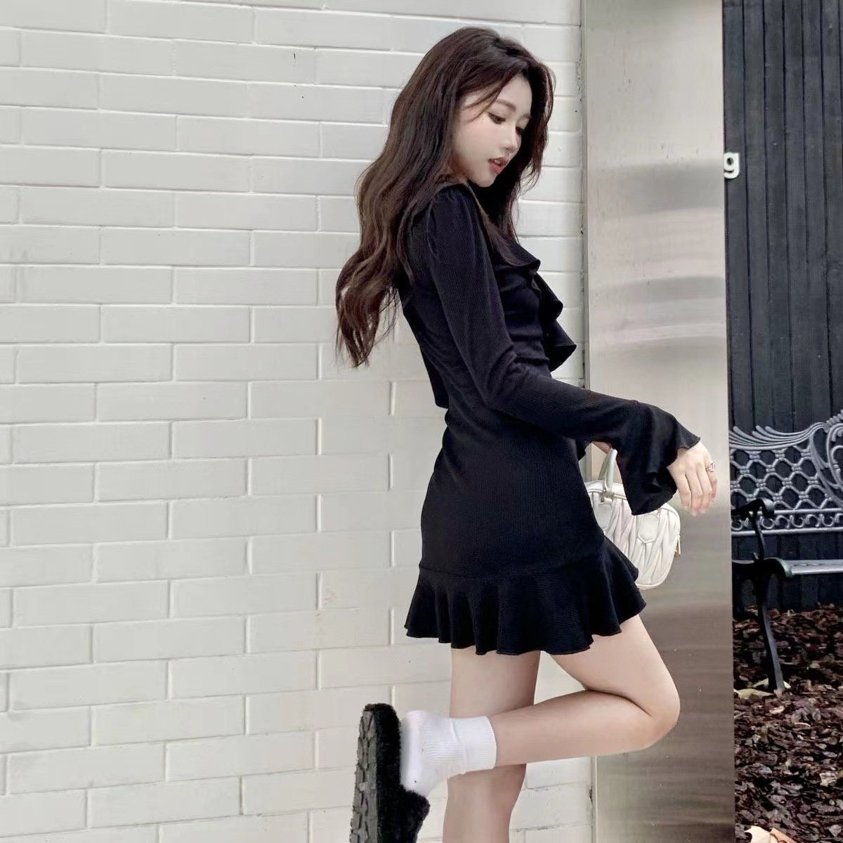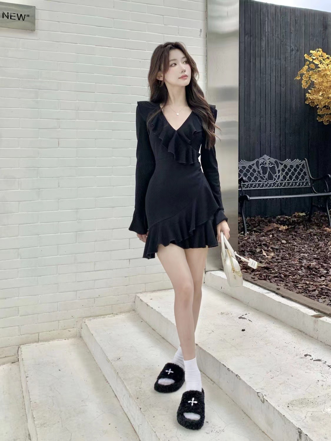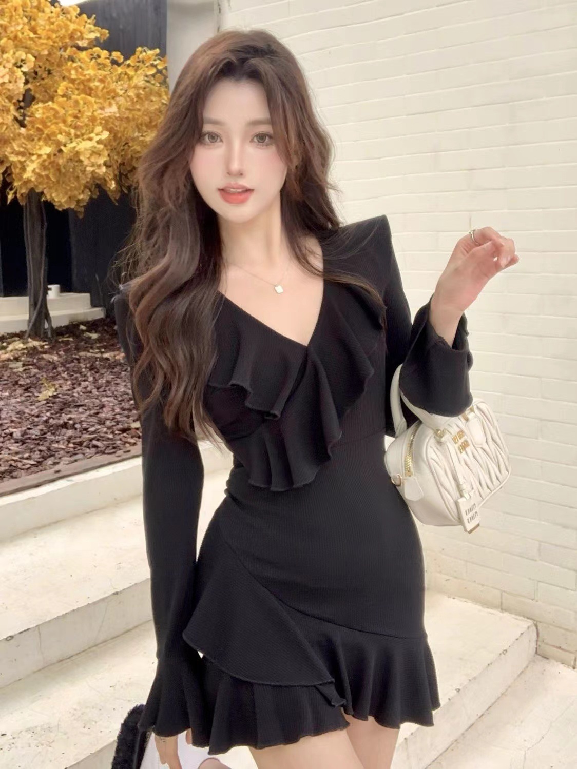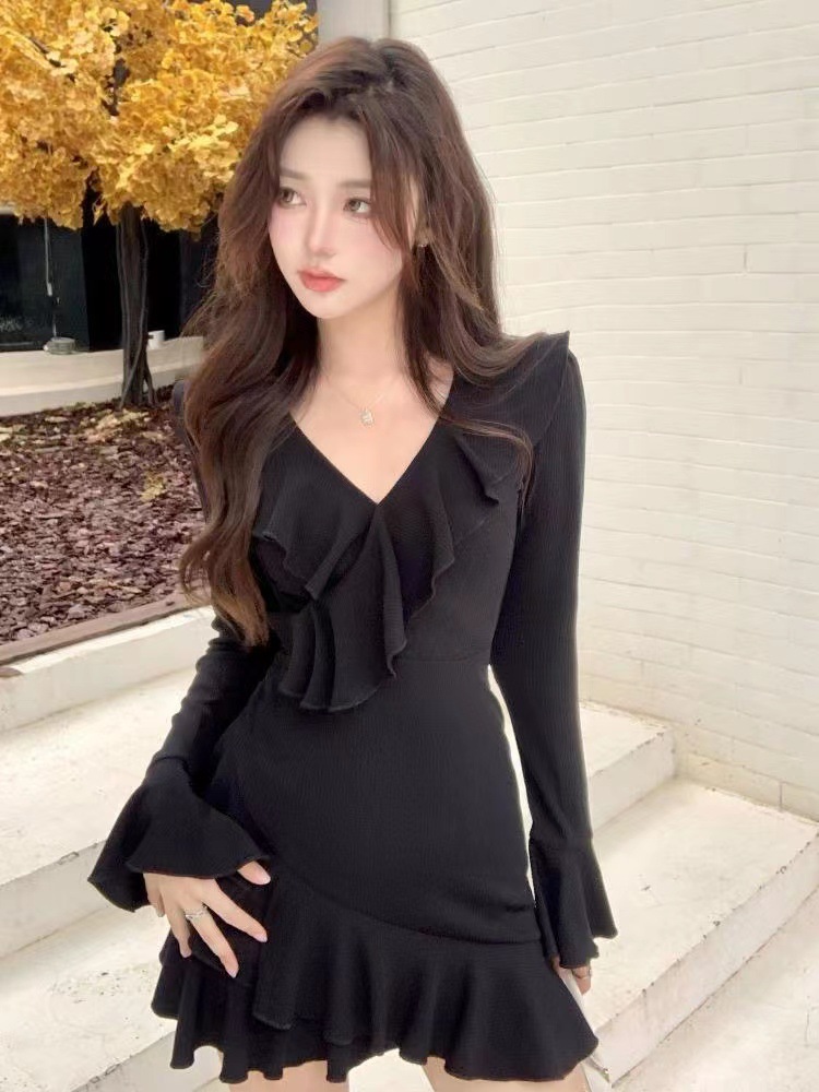 De Velvet Horn Sleeve 원피스 순수한 욕망 V-넥 러플 가을 및 겨울 인테리어 슬림 핏 틈새 우아한 블랙 스커트