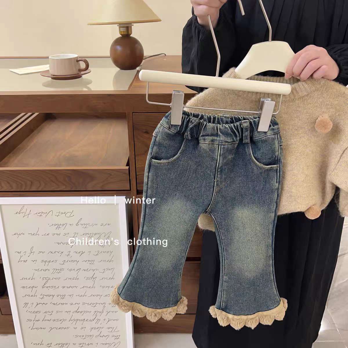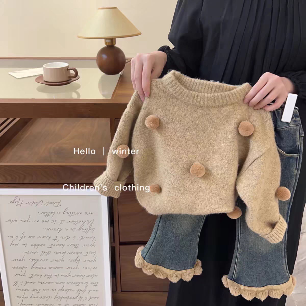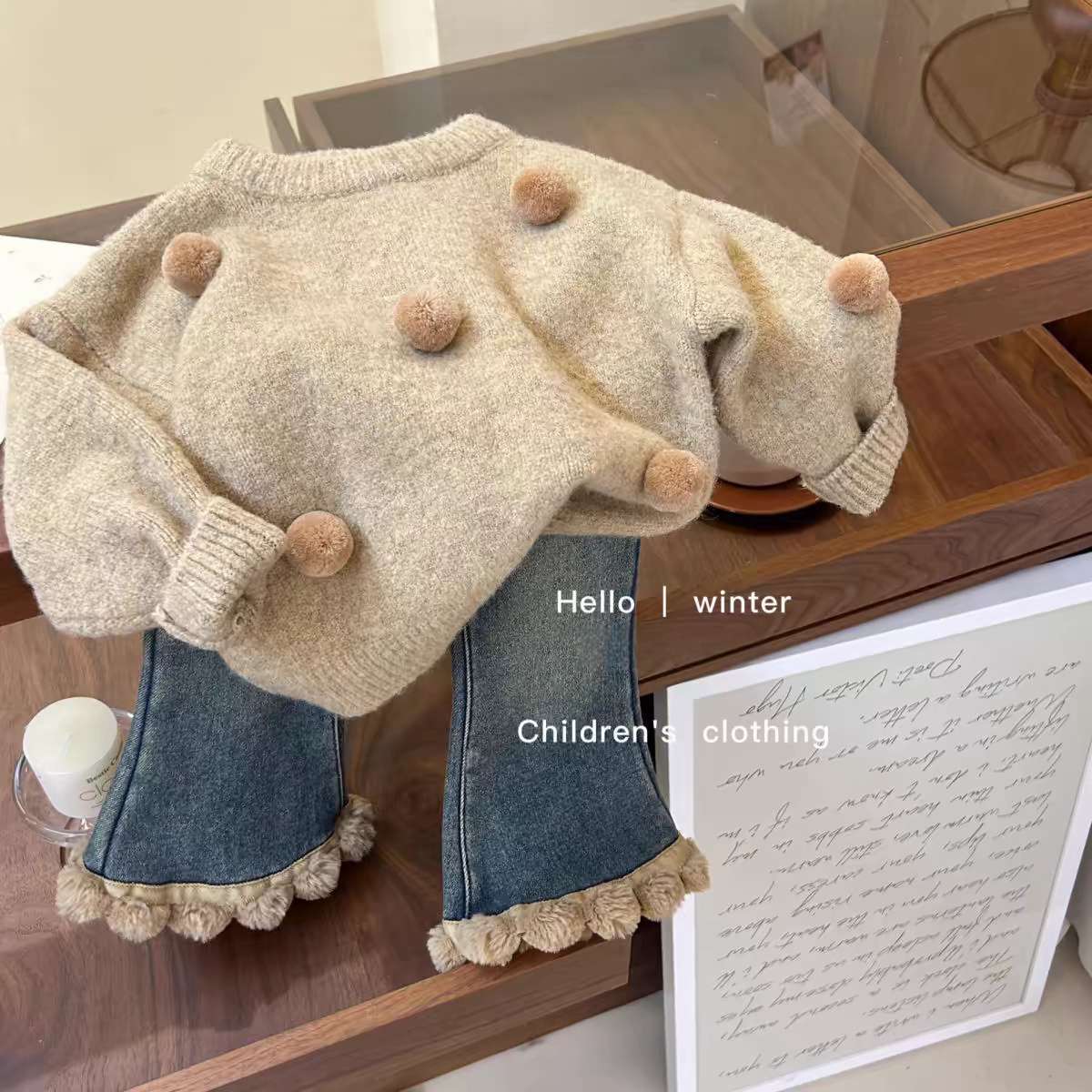 여아 스웨터 세트 2025 가을 겨울 신상 스타일리시 아기 니트 상의와 일체형 벨벳 청바지 투피스 세트 트렌디스토어 가기