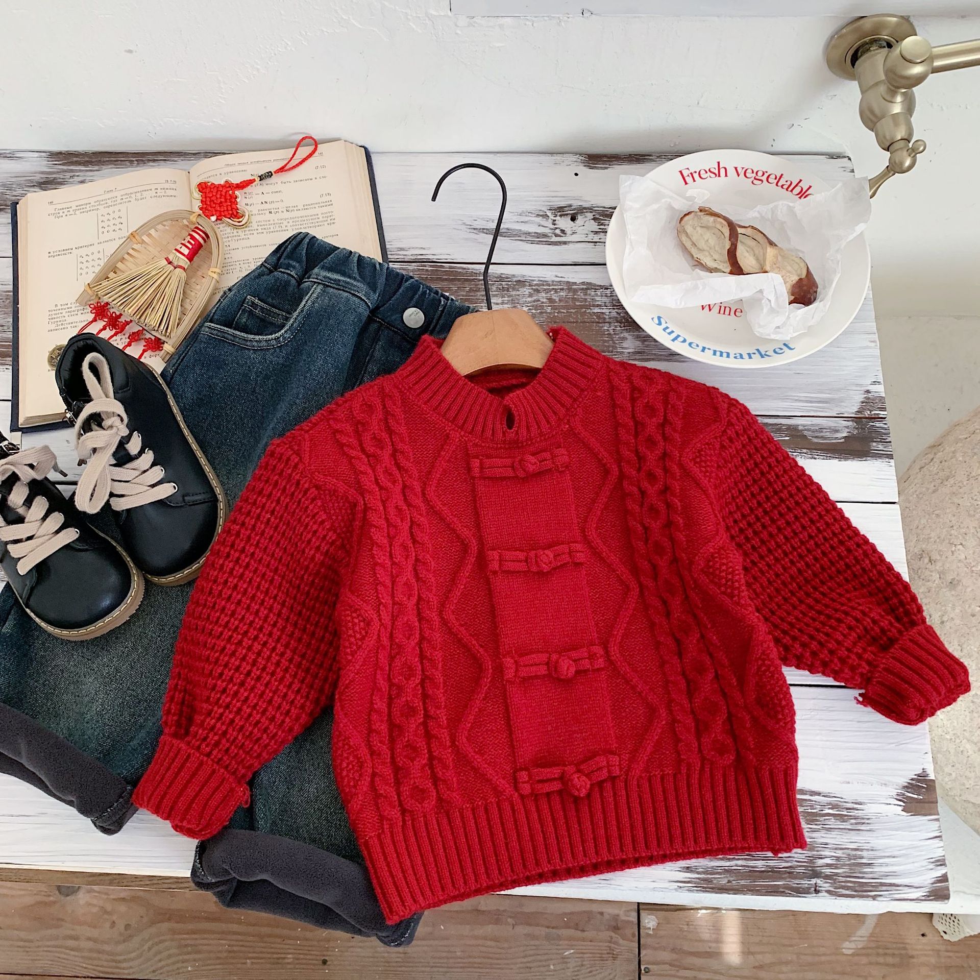 어린이 스웨터 방청 2025 겨울 기본 의류 빨간색 설날 전통 스타일 단추 니트 설날 의상 F0642