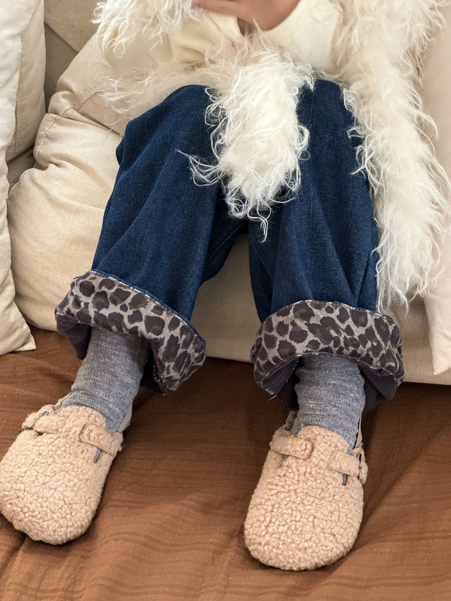유유 공주 소년 소녀 기모 바지 어린이 겨울 한국식 레오파드 무늬 플랜지 스트레이트 바지 원피스 양털 청바지