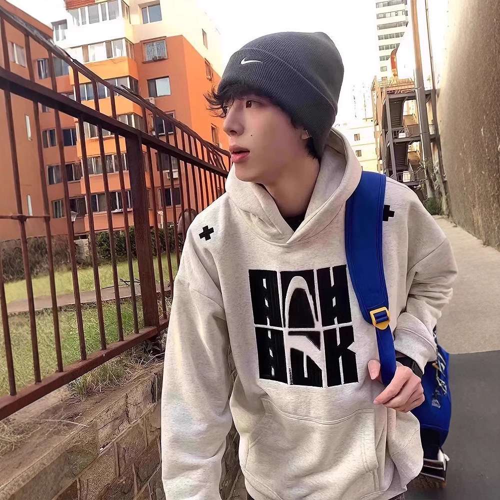 멜란지 그레이 수 놓은 후드 스웨터 남성 가을 겨울 미국 레트로 패션 브랜드 하이 엔드 센스 헤비 재킷스토어 가기
