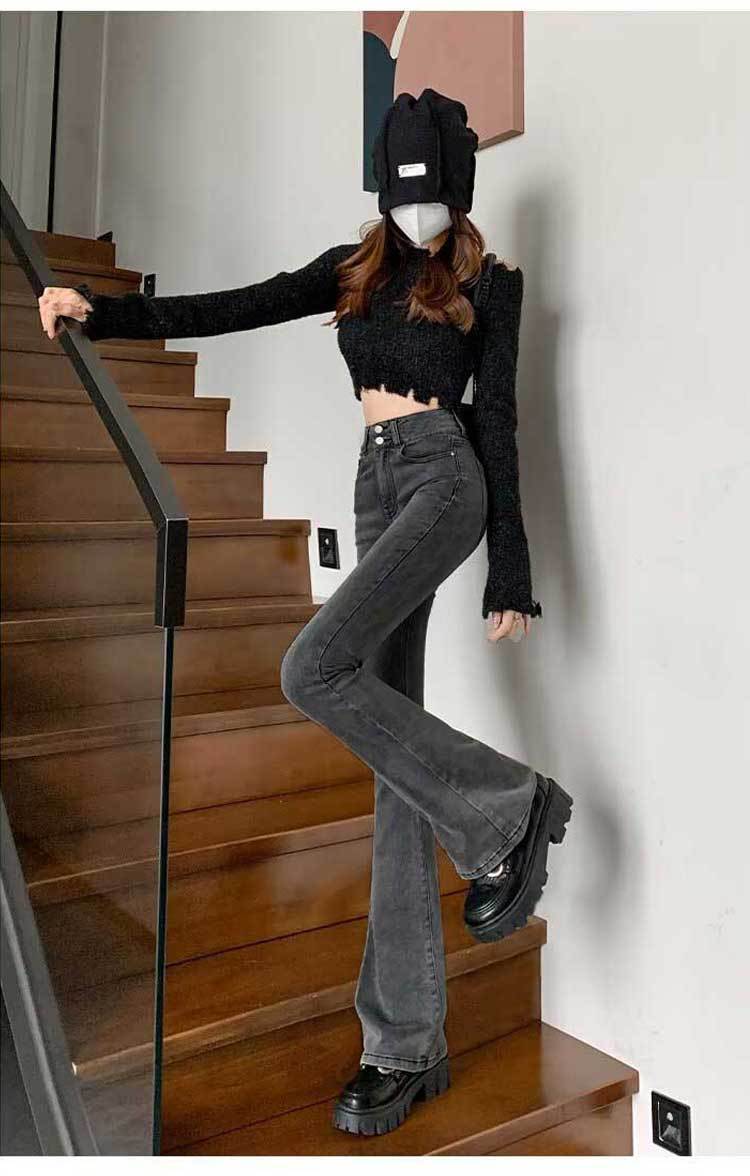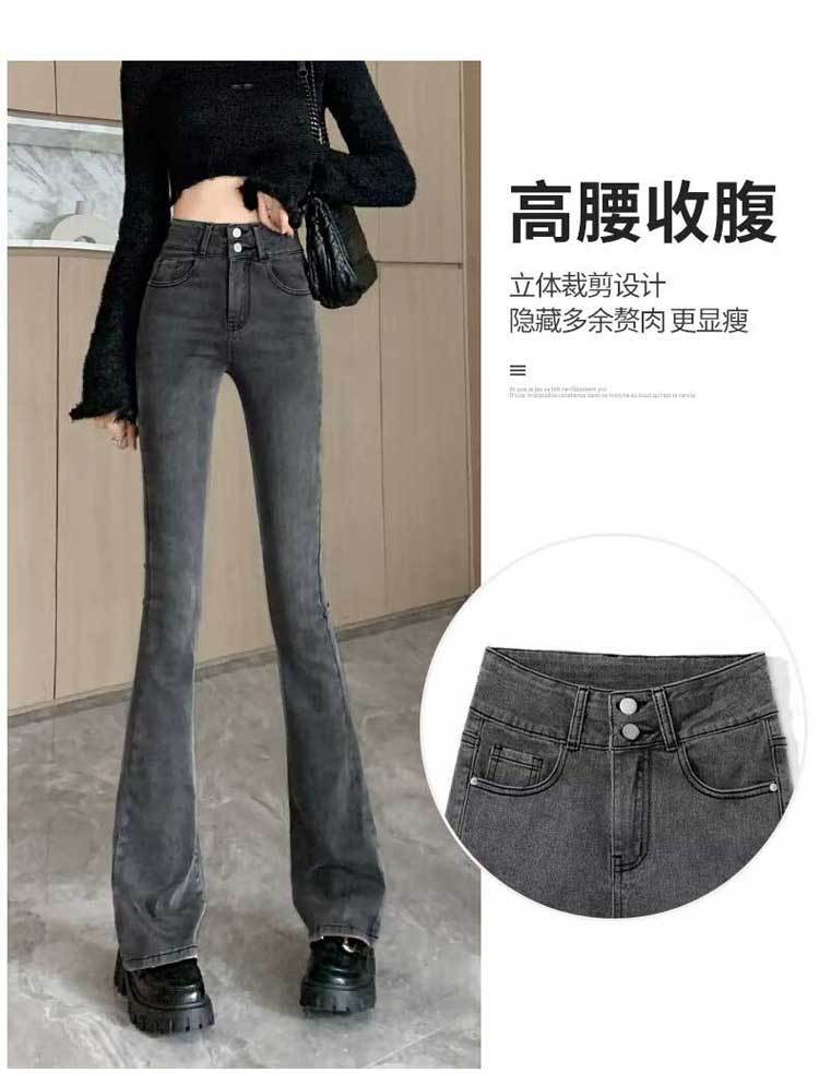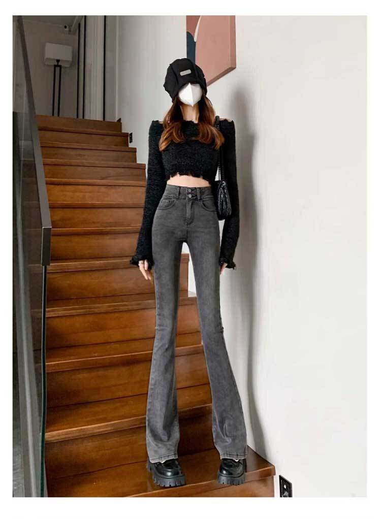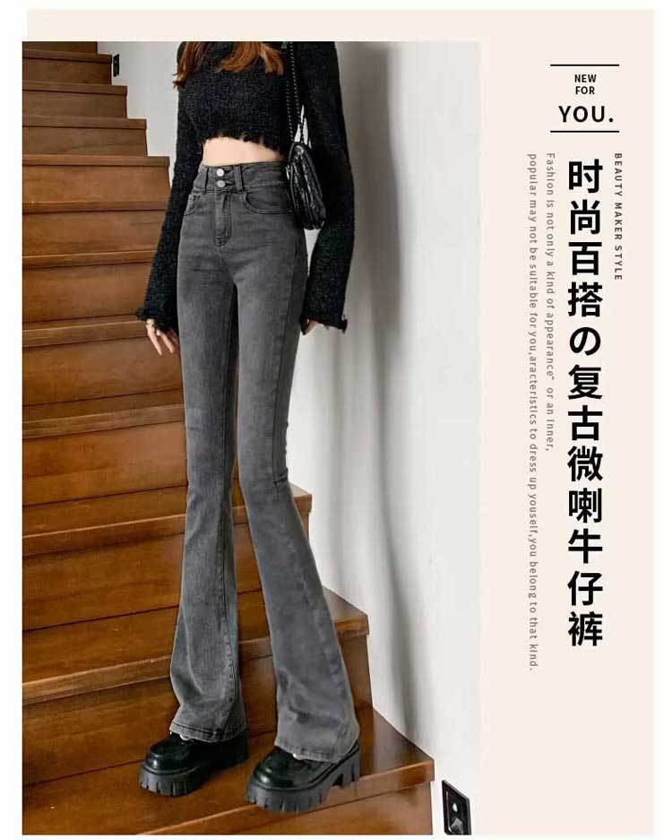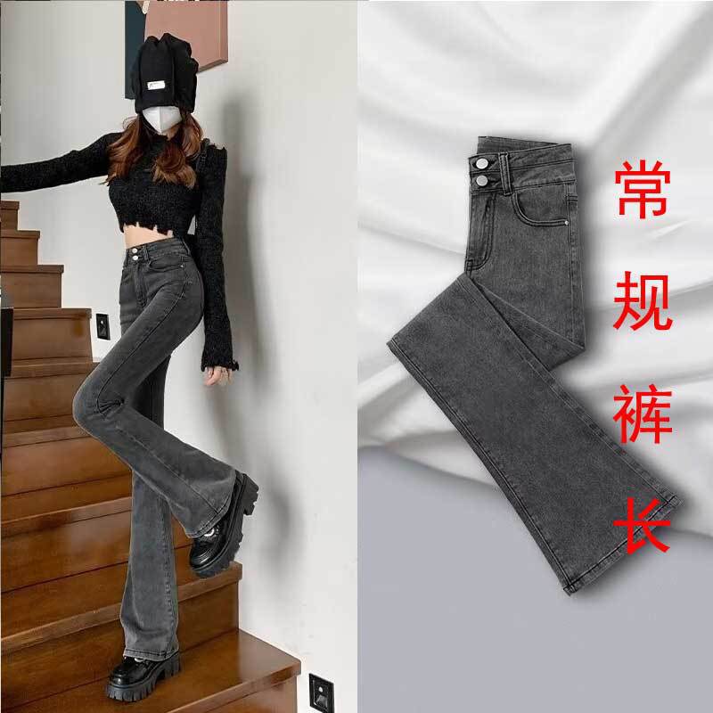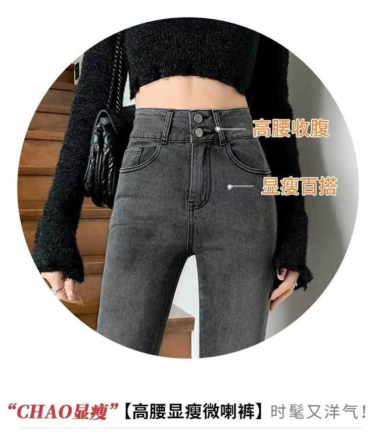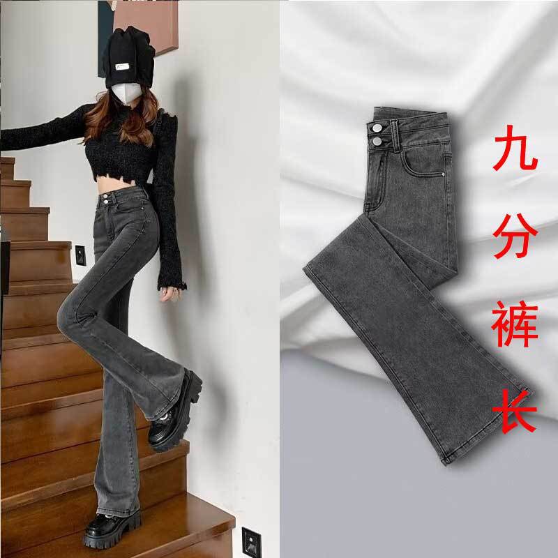 시멘트 재 약한 청바지 여성의 봄과 가을 높은 허리 슬리밍 작은 복고풍 딥 호른 바지 검은 국경스토어 가기