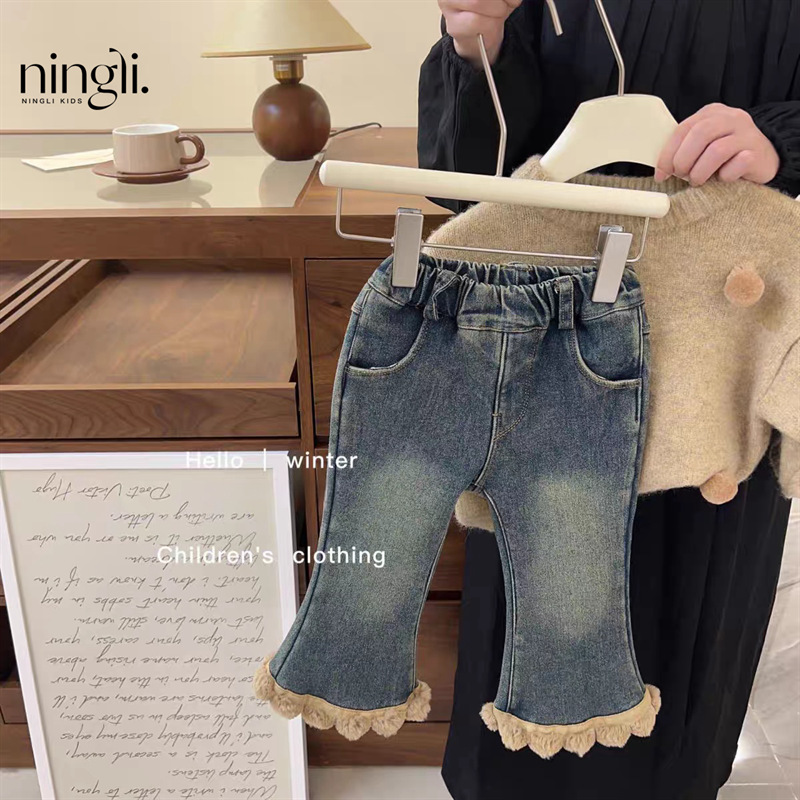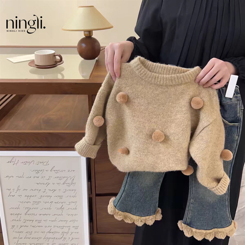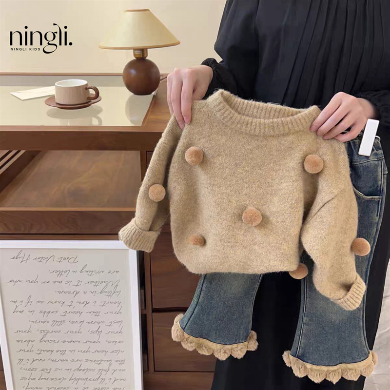 Lingli 여아 스웨터 세트 25 가을 겨울 신상 패셔너블한 아기 니트 상의와 일체형 벨벳 청바지 투피스 세트스토어 가기