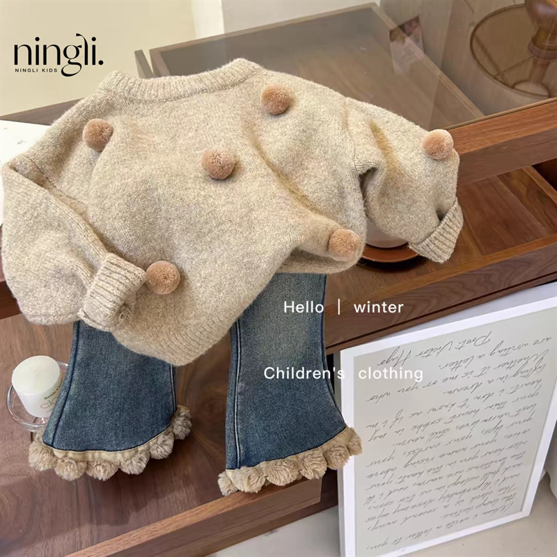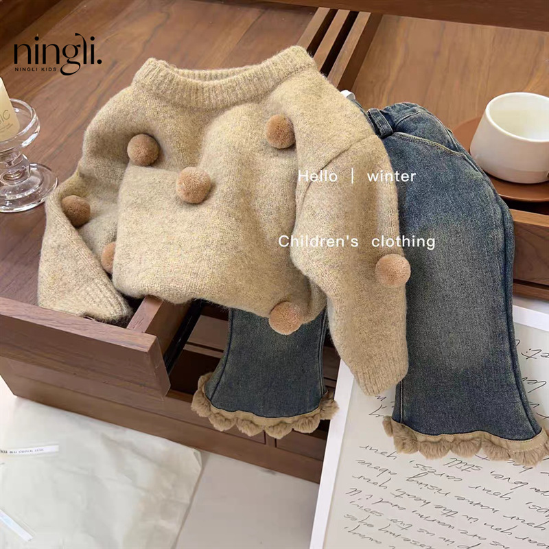Lingli 여아 스웨터 세트 25 가을 겨울 신상 패셔너블한 아기 니트 상의와 일체형 벨벳 청바지 투피스 세트