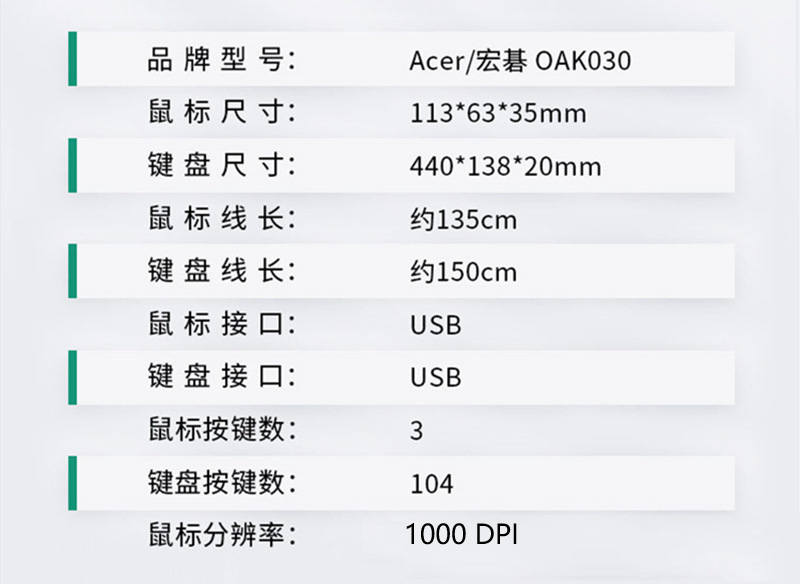 ACER OAK030 키보드 및 마우스 세트 USB 유선 오피스 멀티미디어 컴퓨터 비즈니스 오피스 게임에 적합