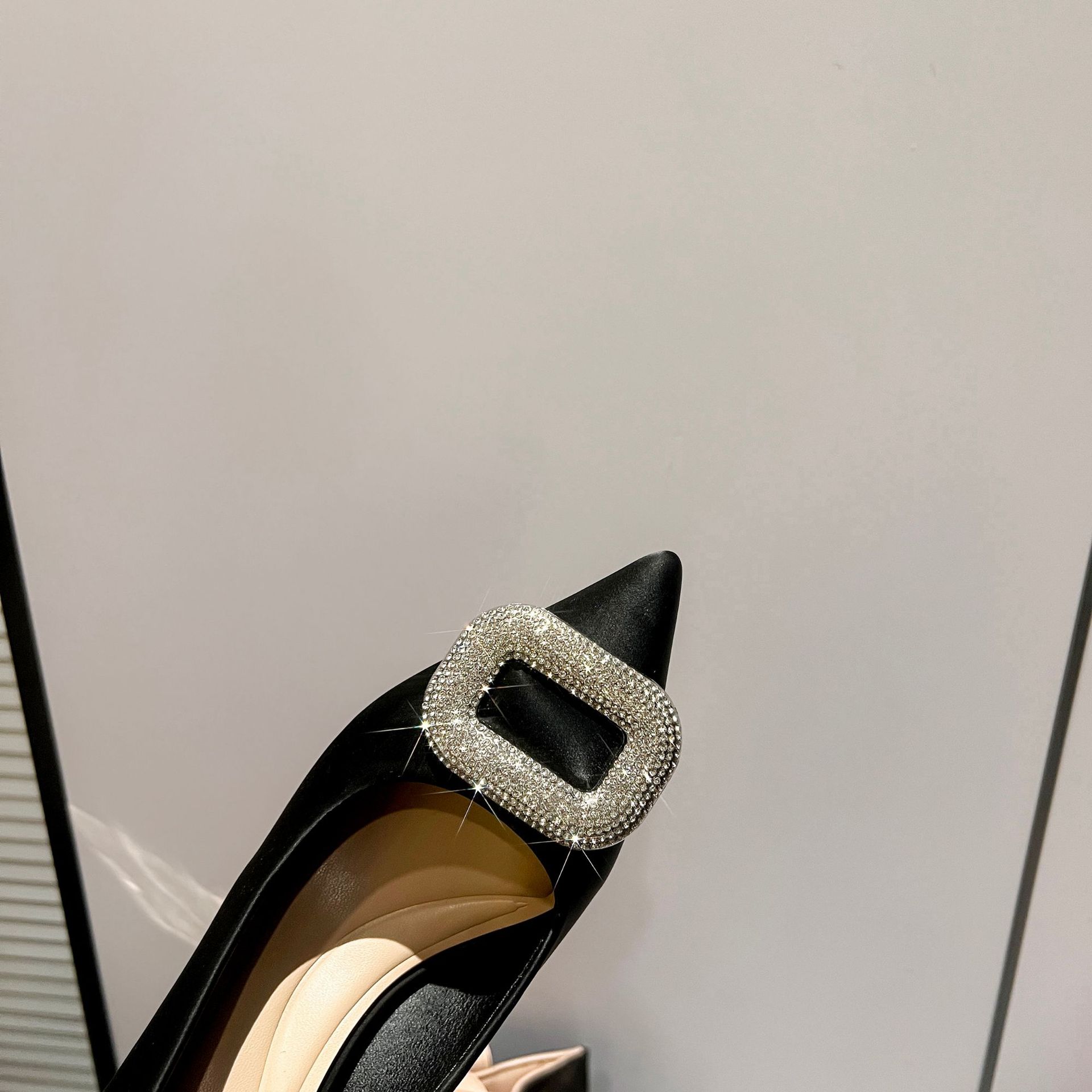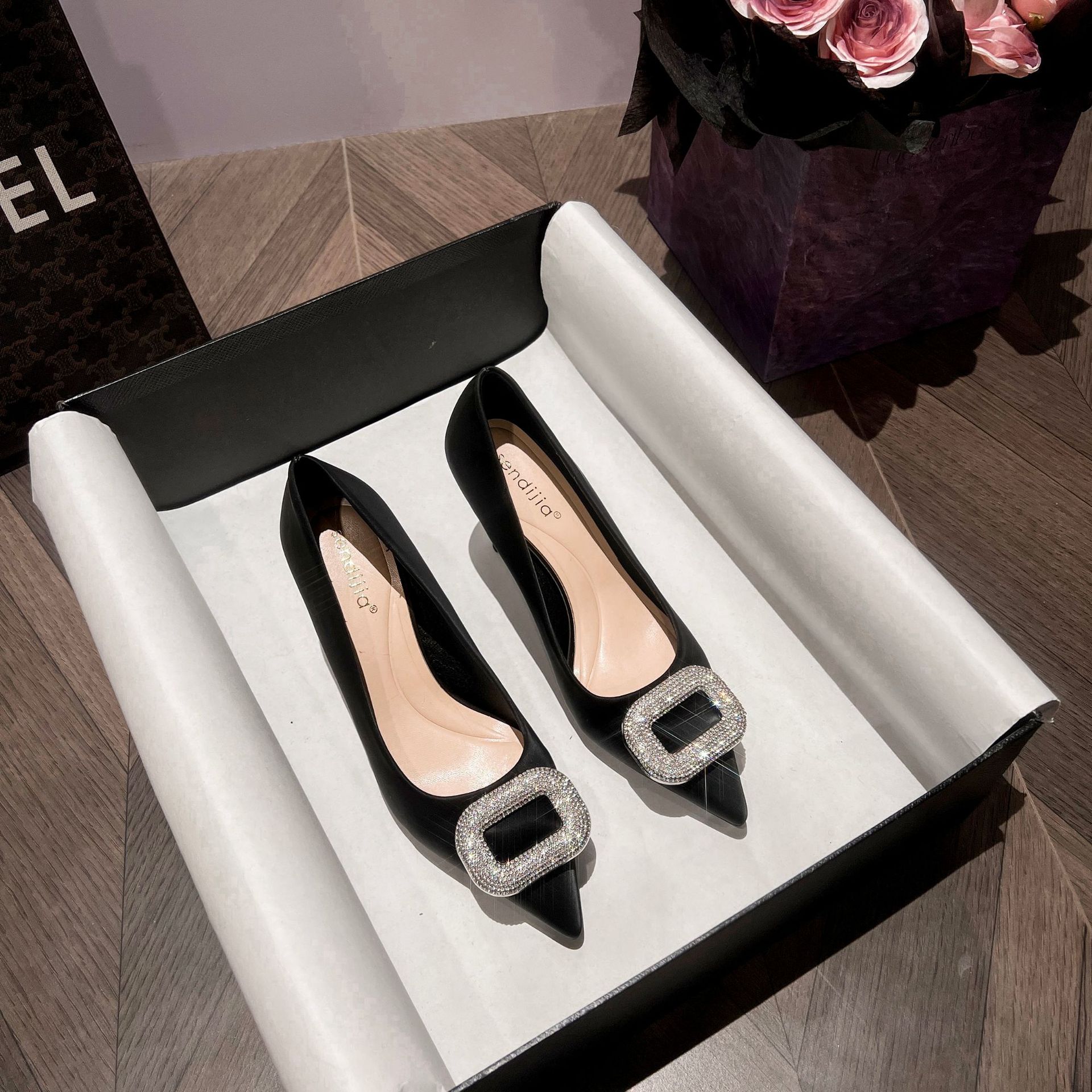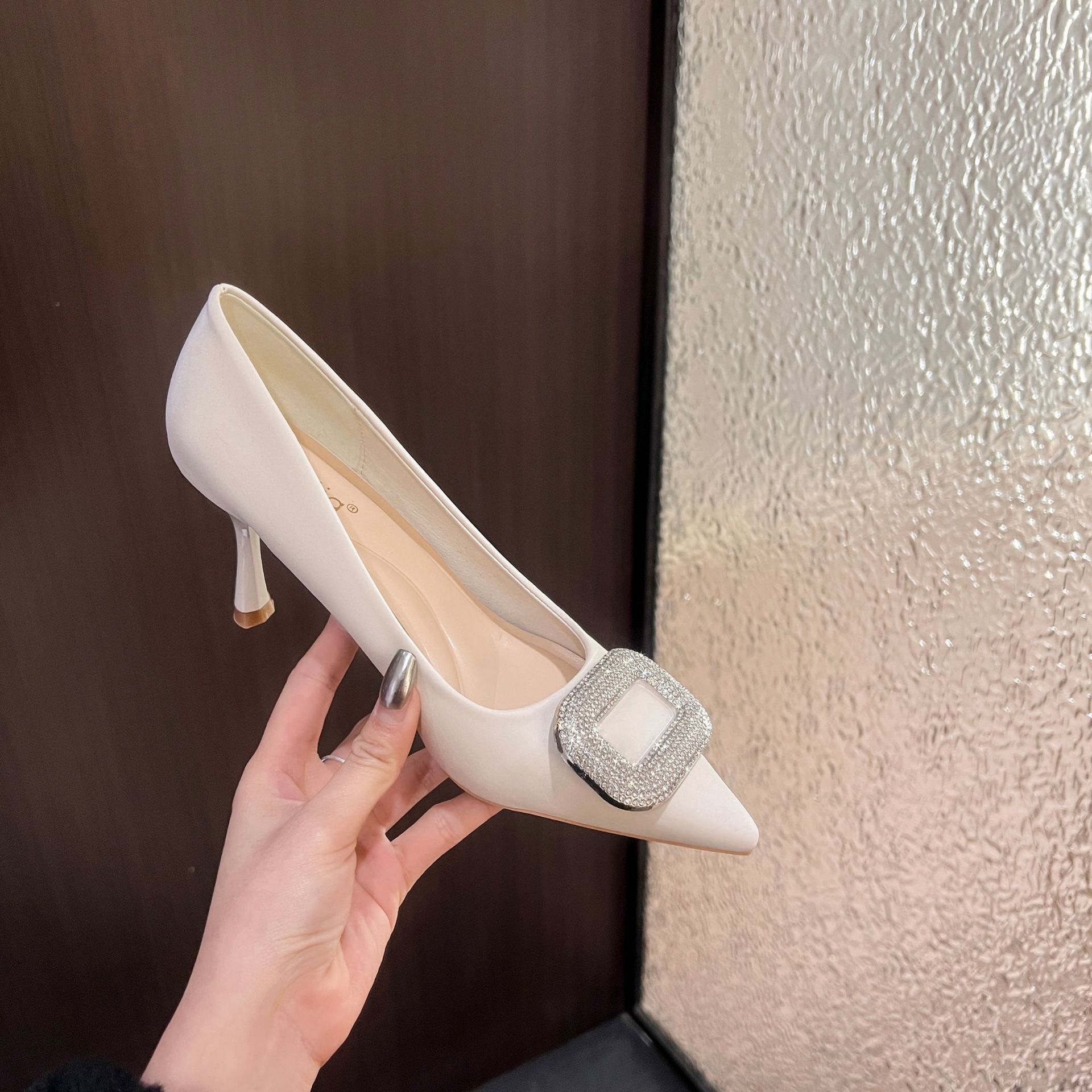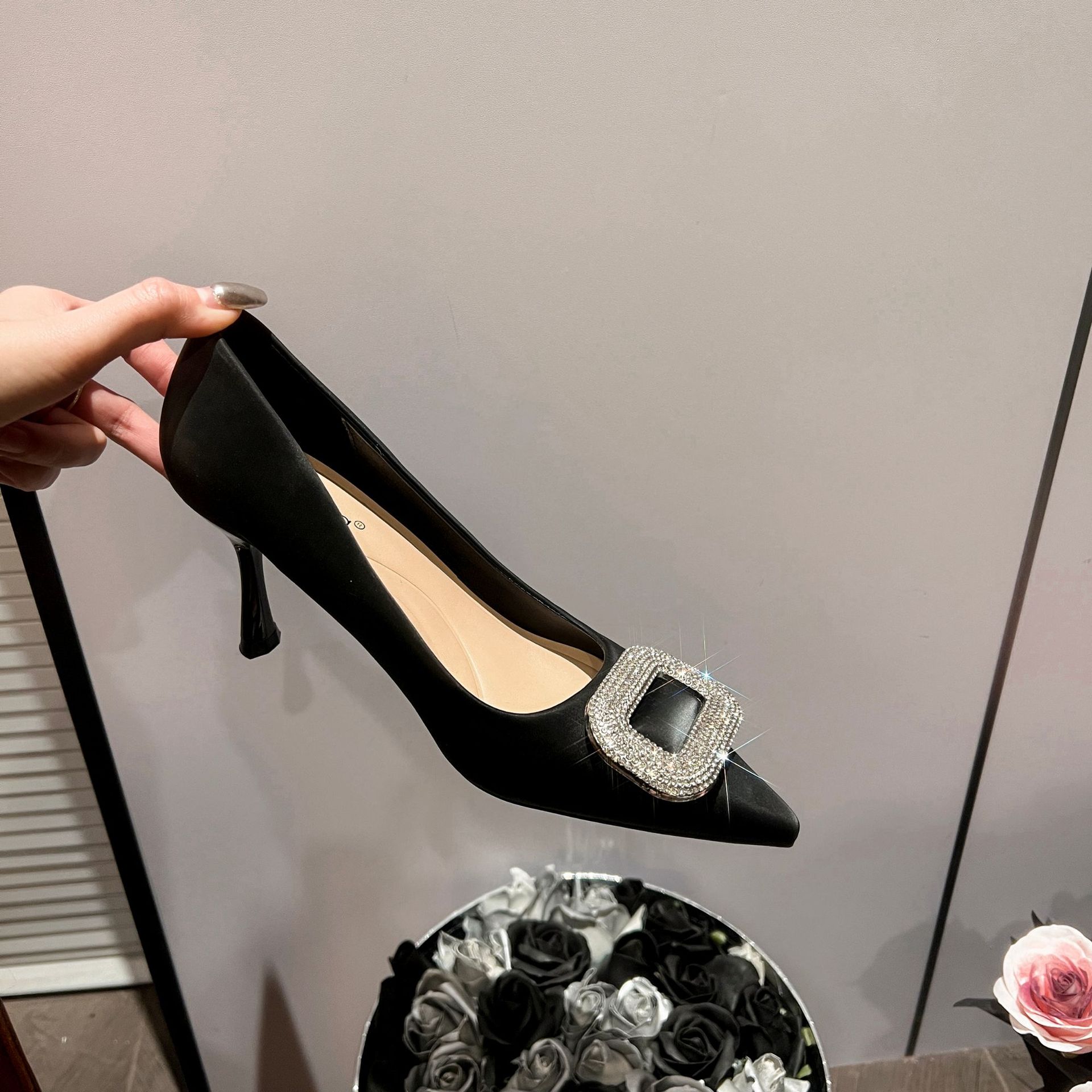 A555-8 하이힐 슈즈 여성용 2024 새로운 통근 스타일 작은 스퀘어 다이아몬드 버클 슈즈 올매치 우아한 포인팅 슈즈스토어 가기