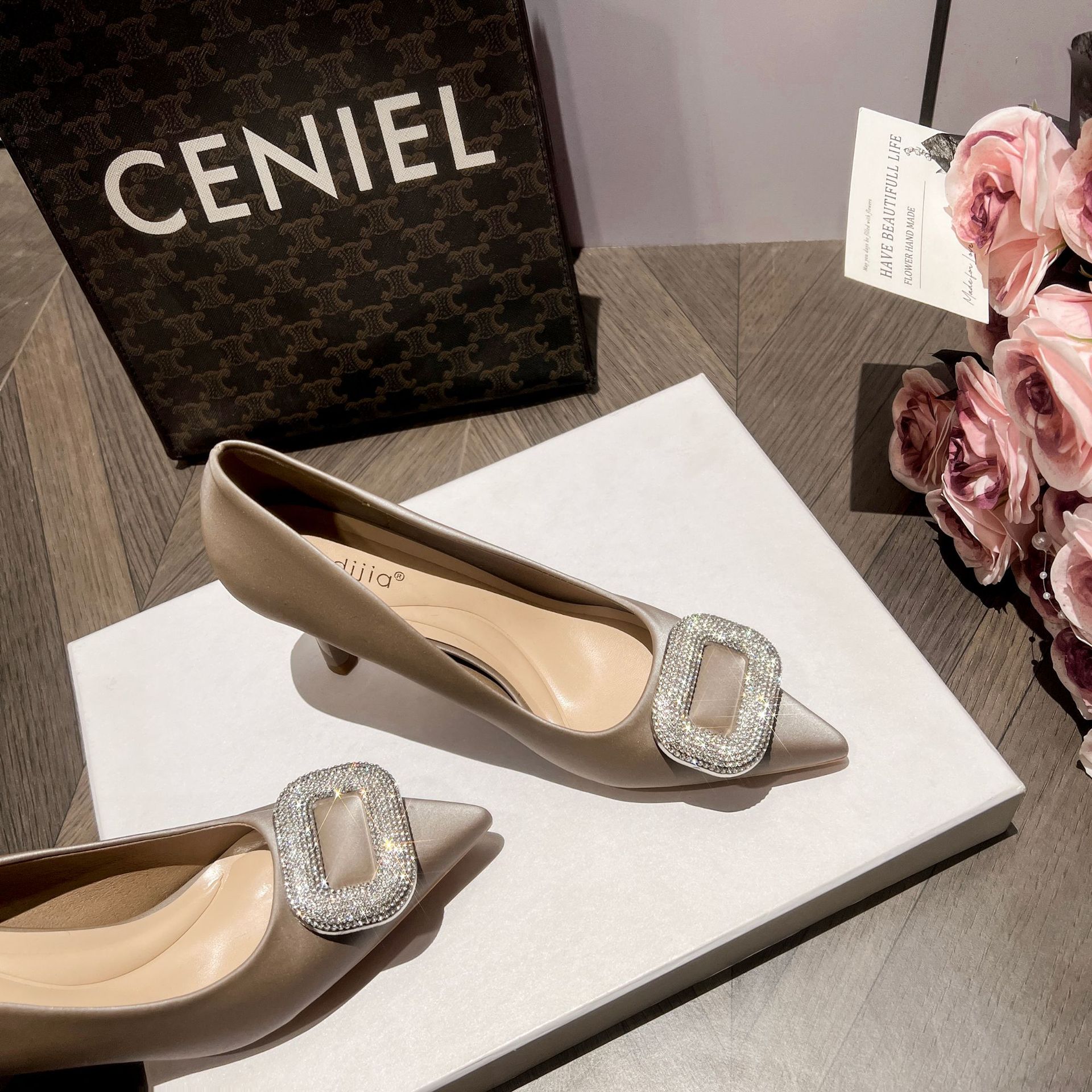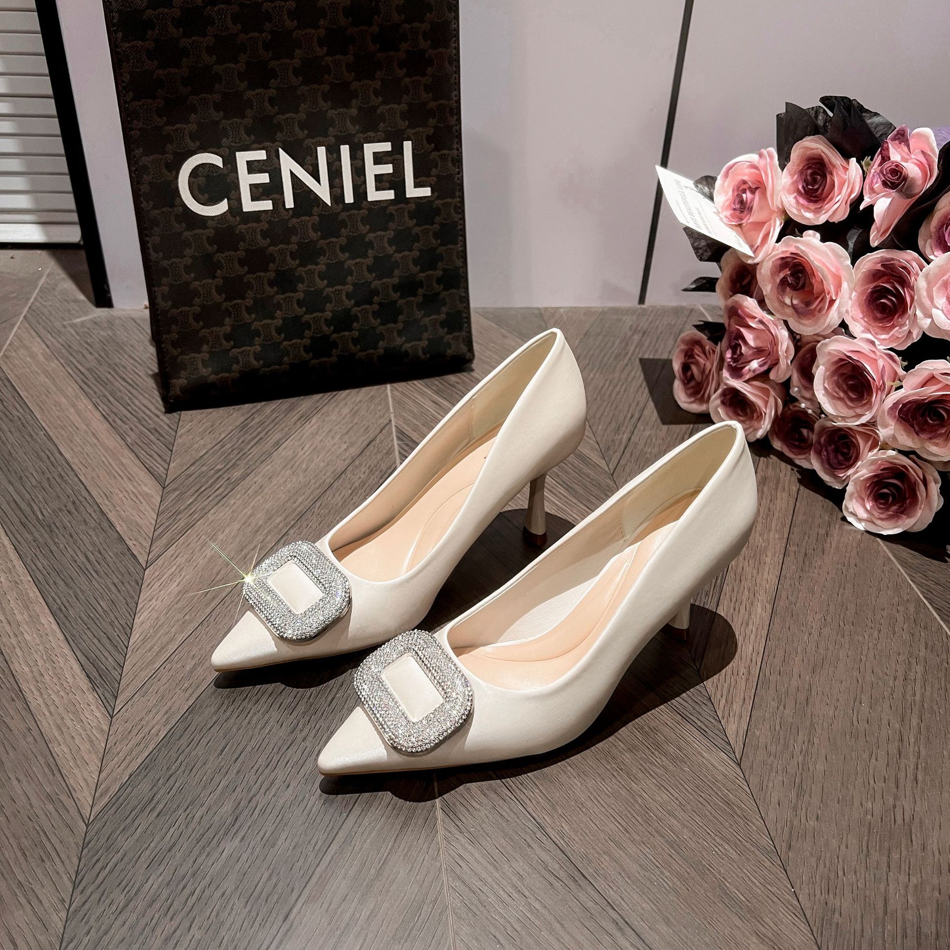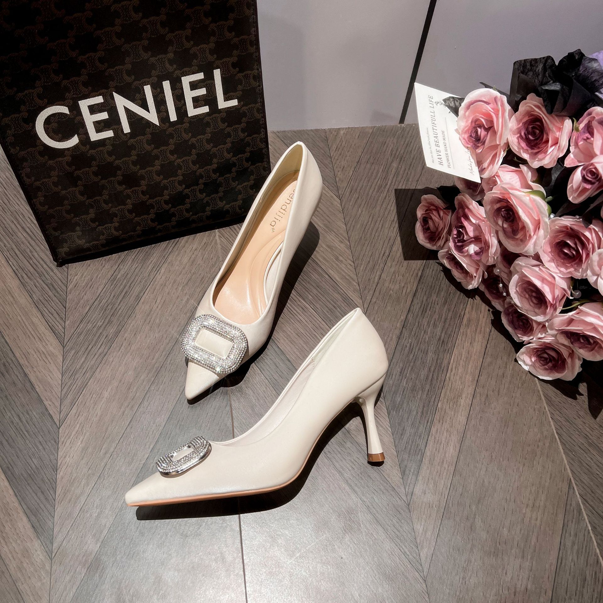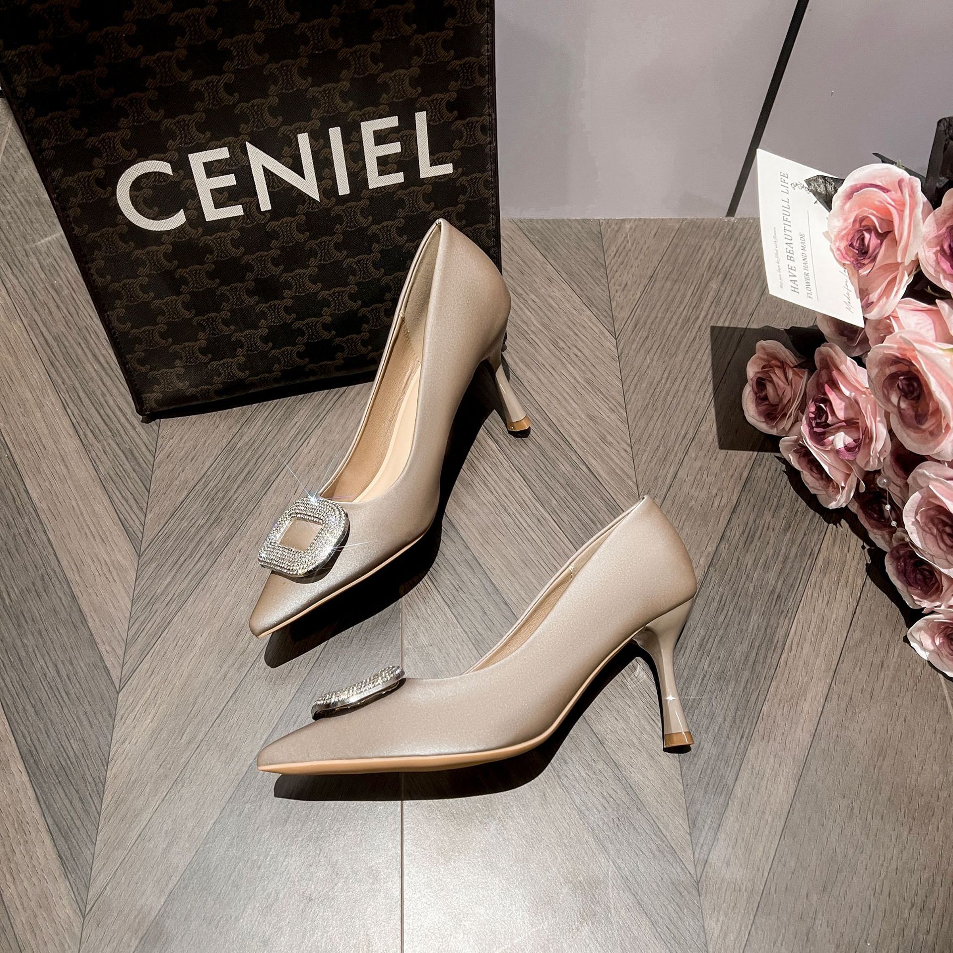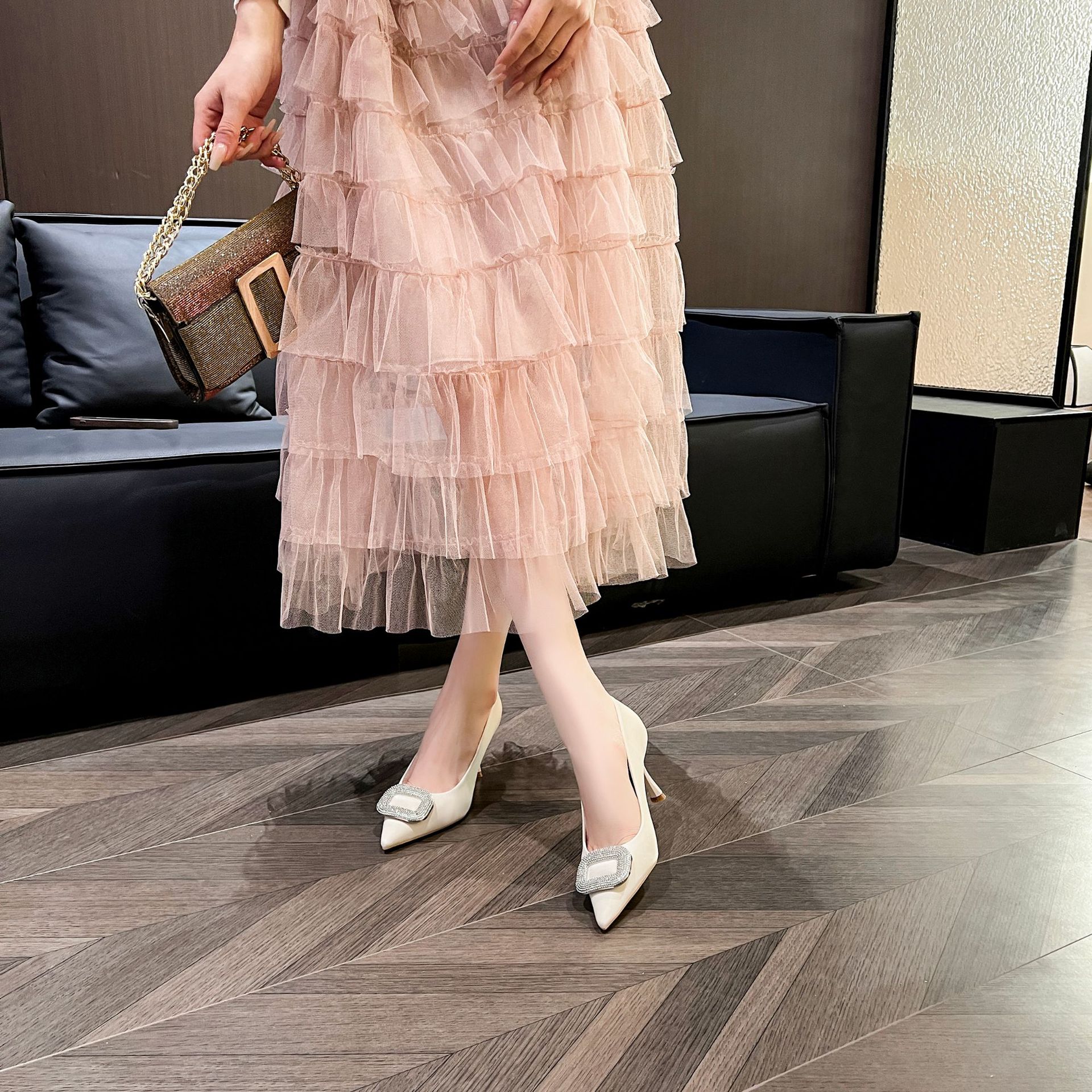 A555-8 하이힐 슈즈 여성용 2024 새로운 통근 스타일 작은 스퀘어 다이아몬드 버클 슈즈 올매치 우아한 포인팅 슈즈스토어 가기