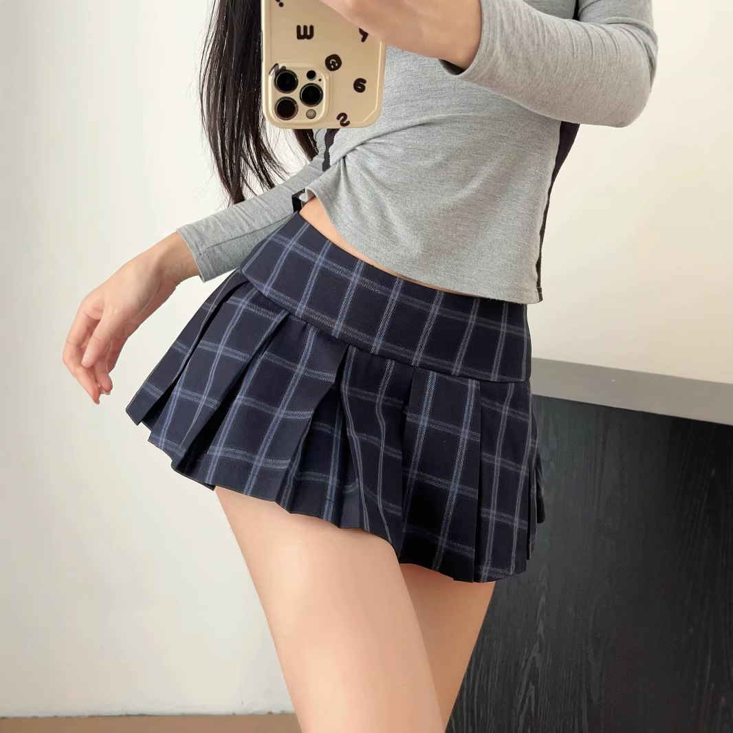 빈티지 블루 체크 울트라 짧은 치마 여성 2024 가을 및 겨울 새로운 미국 스타일 뜨거운 소녀 스타일 낮은 허리 슬리밍 A-라인 오버 스커트스토어 가기