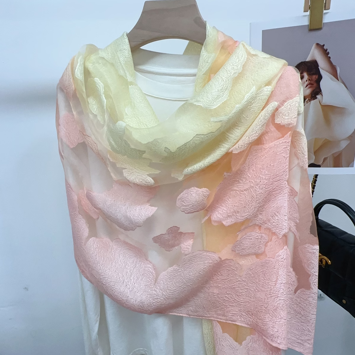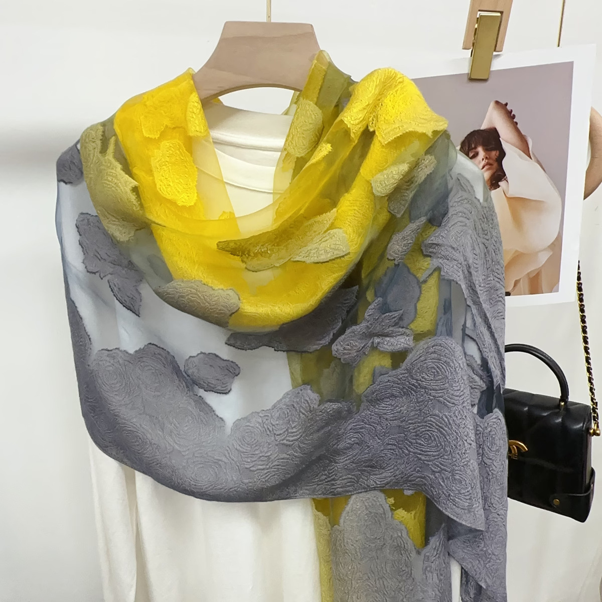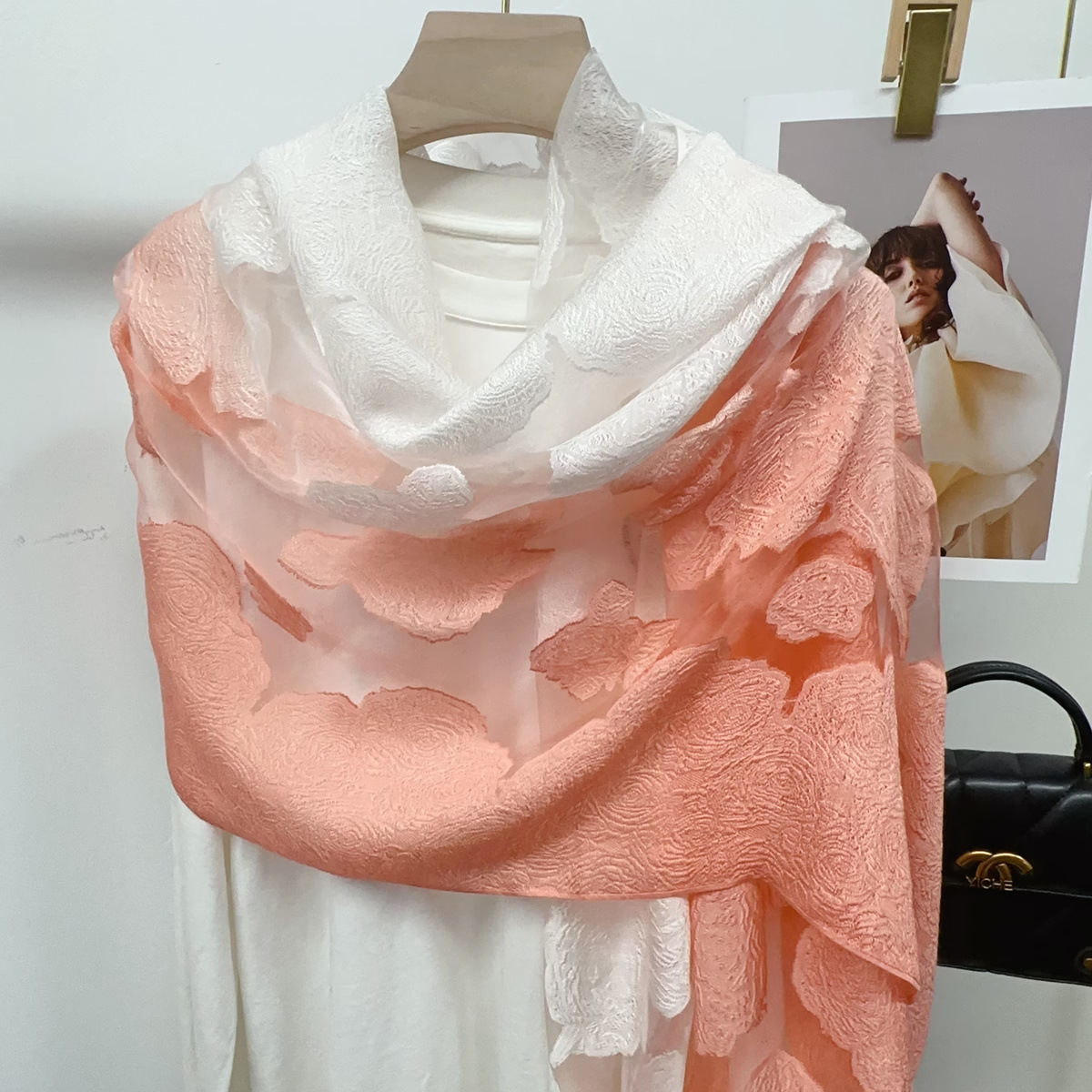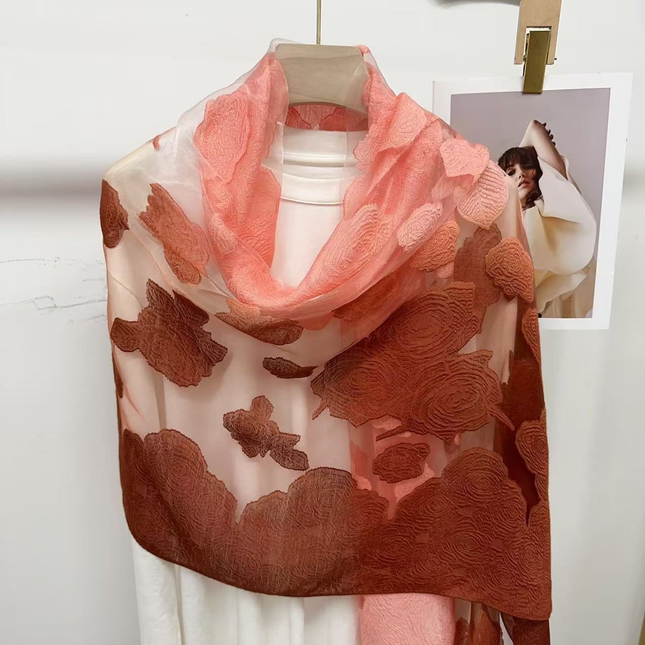 3 차원 꽃 커팅 스카프 여성의 봄과 가을 한국식 오간자 장미 긴 스카프 거즈 이중 사용 목도리
