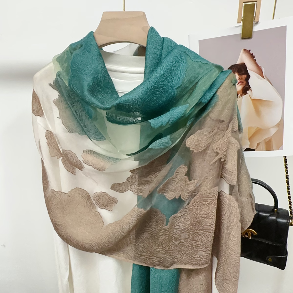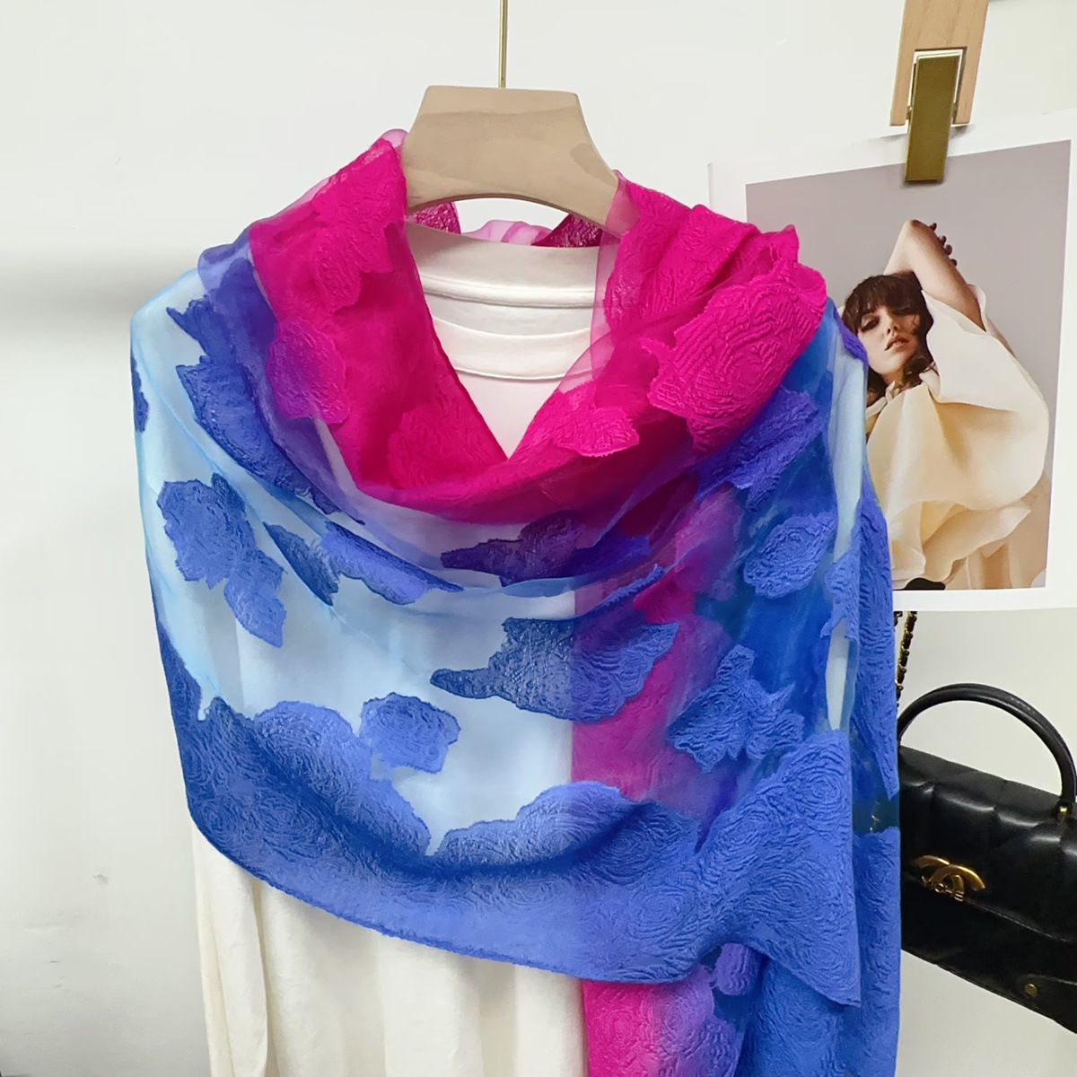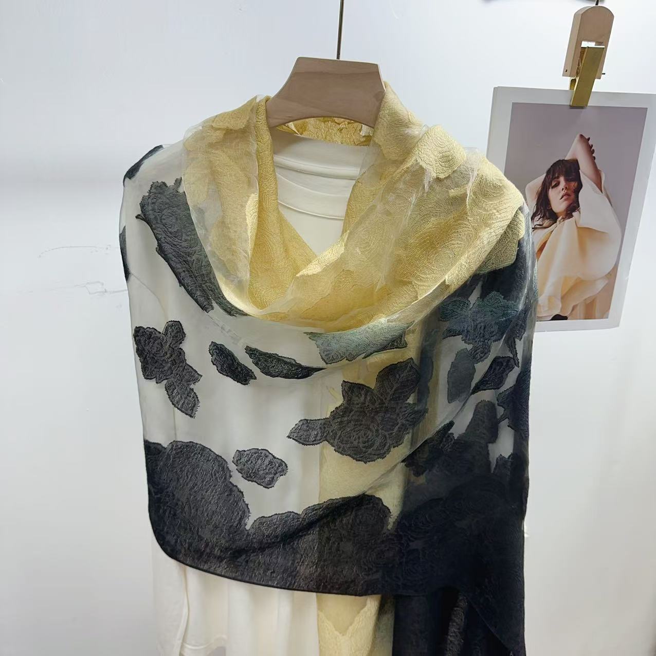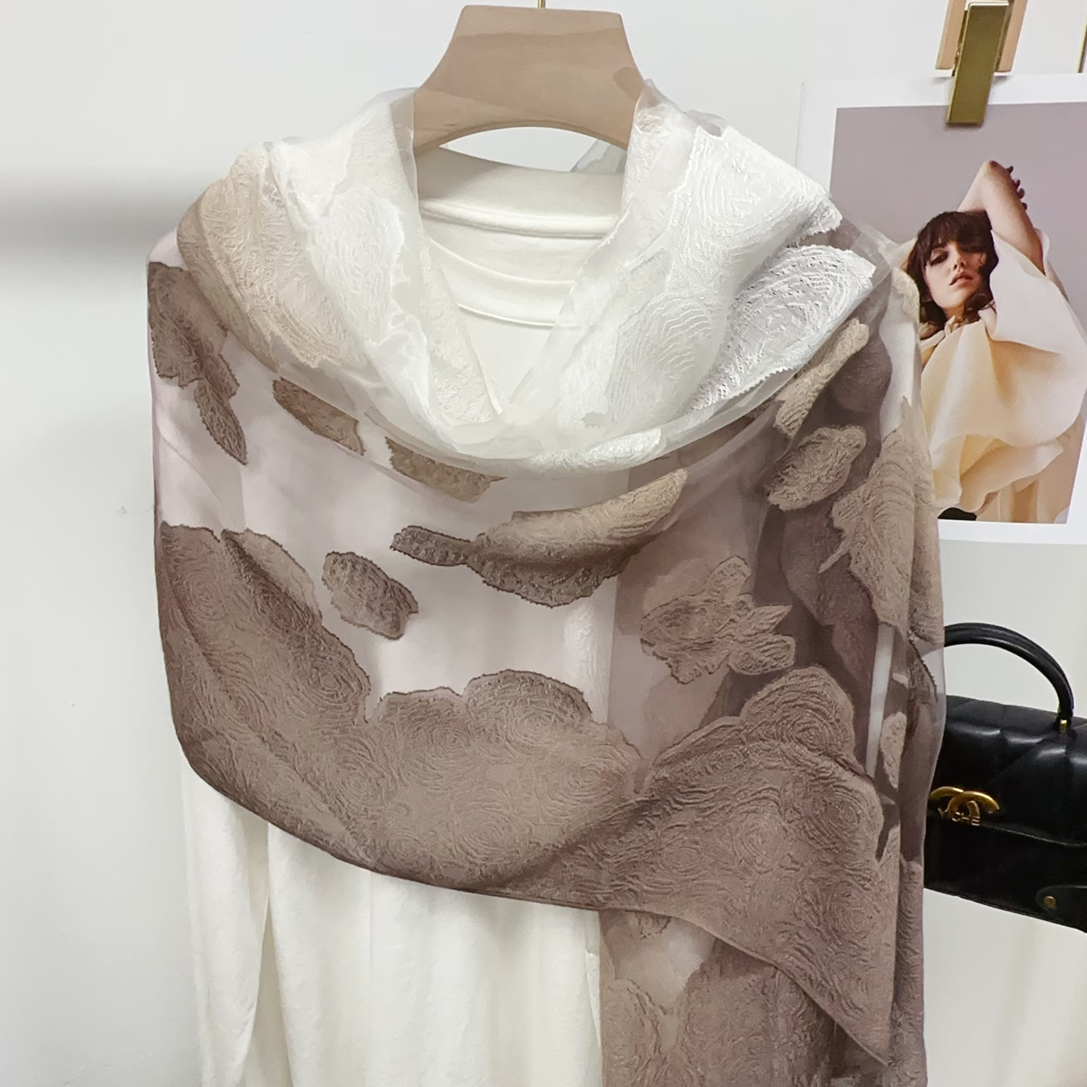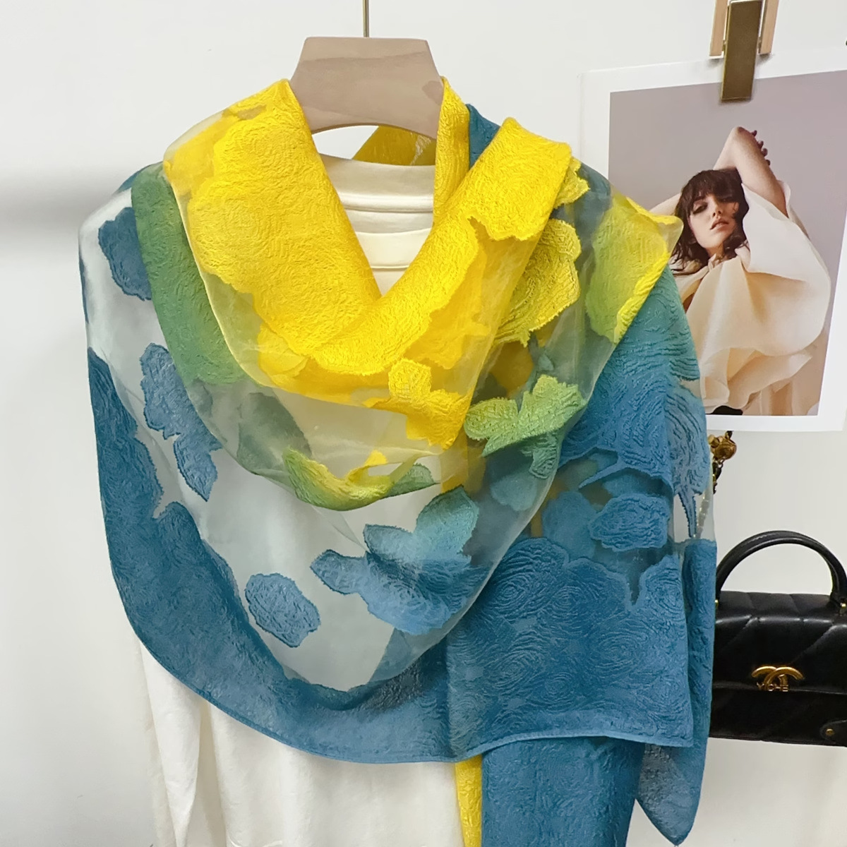 3 차원 꽃 커팅 스카프 여성의 봄과 가을 한국식 오간자 장미 긴 스카프 거즈 이중 사용 목도리