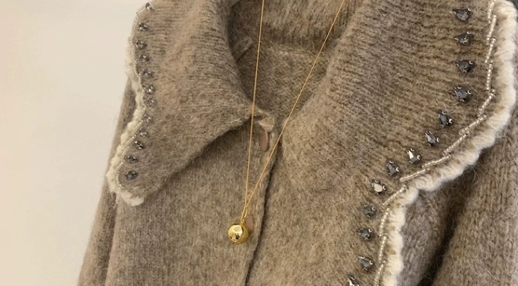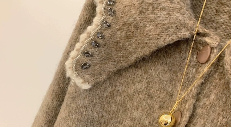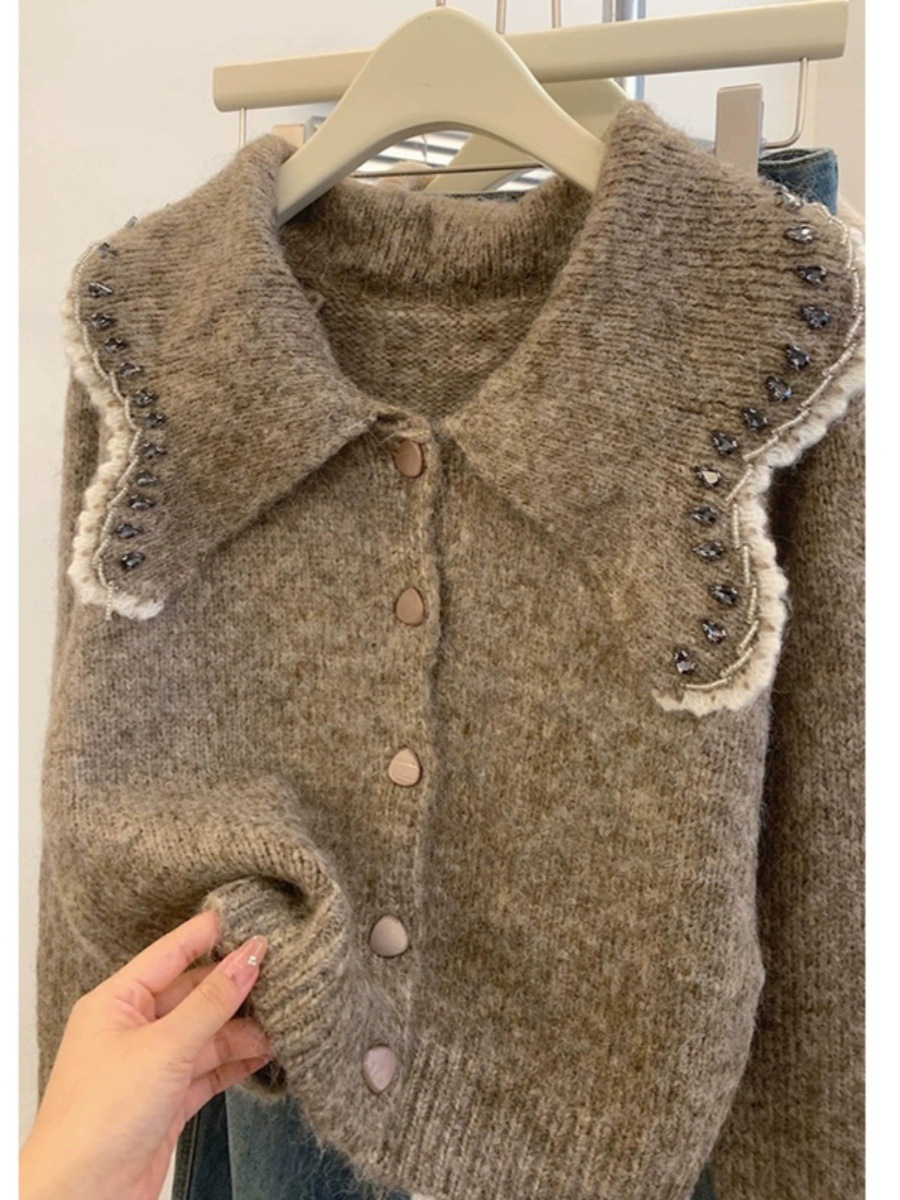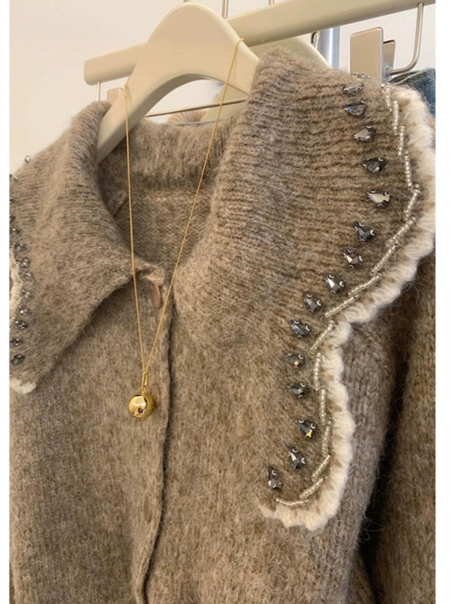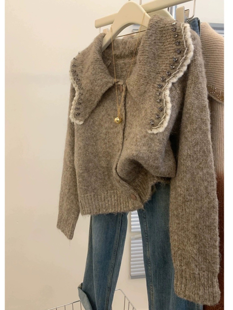 우아한 고급 샤넬 스타일 라싱 칼라 니트 스웨터 여성 가을 및 겨울 중공업 레트로 밀크 후후 대형 옷깃 스웨터 카디건
