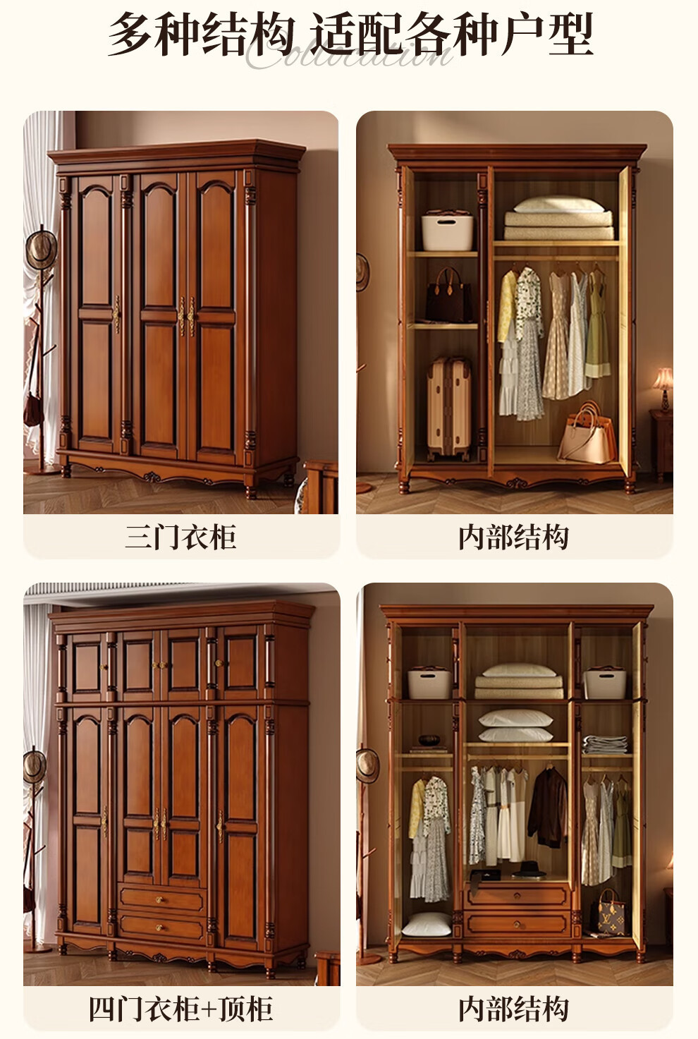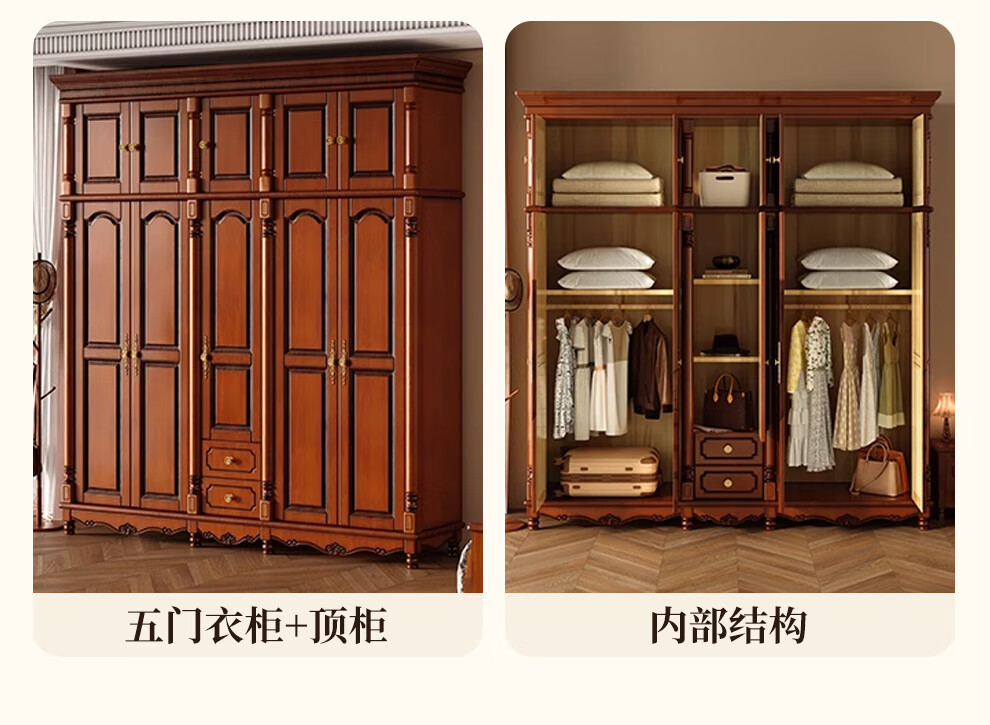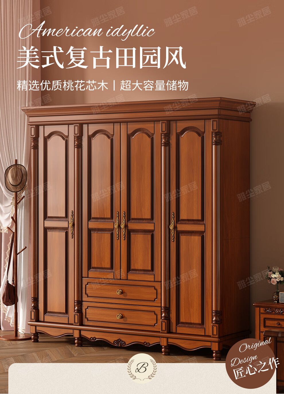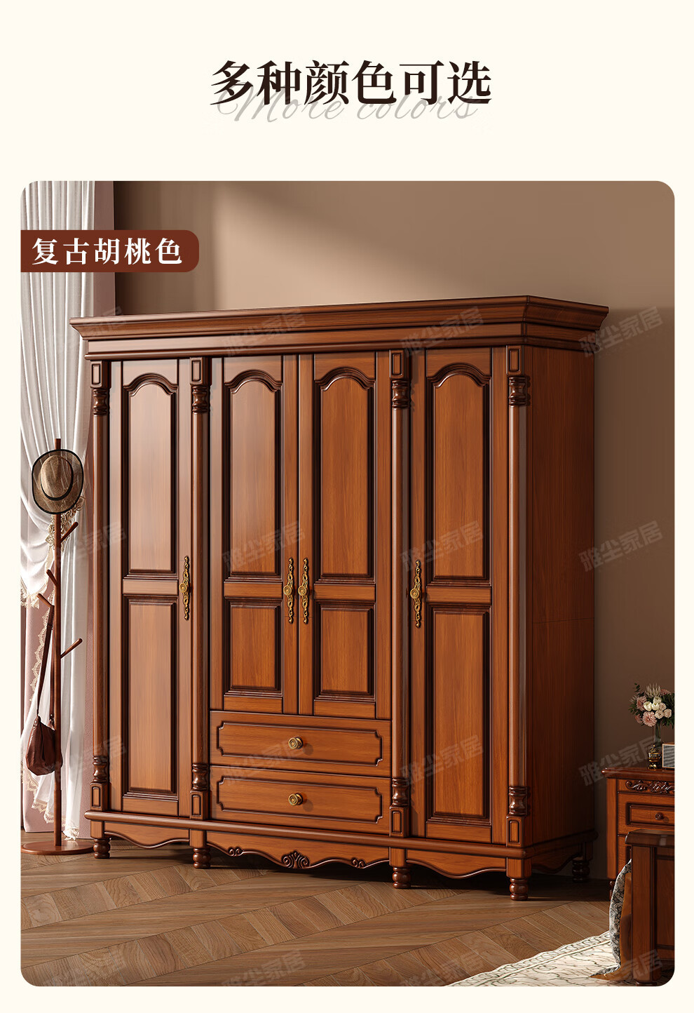 아메리칸 스타일 레트로 솔리드 우드 옷장 반대 문 4 도어 옷장 탑 캐비닛 마스터 침실 실내 대용량 저장 캐비닛