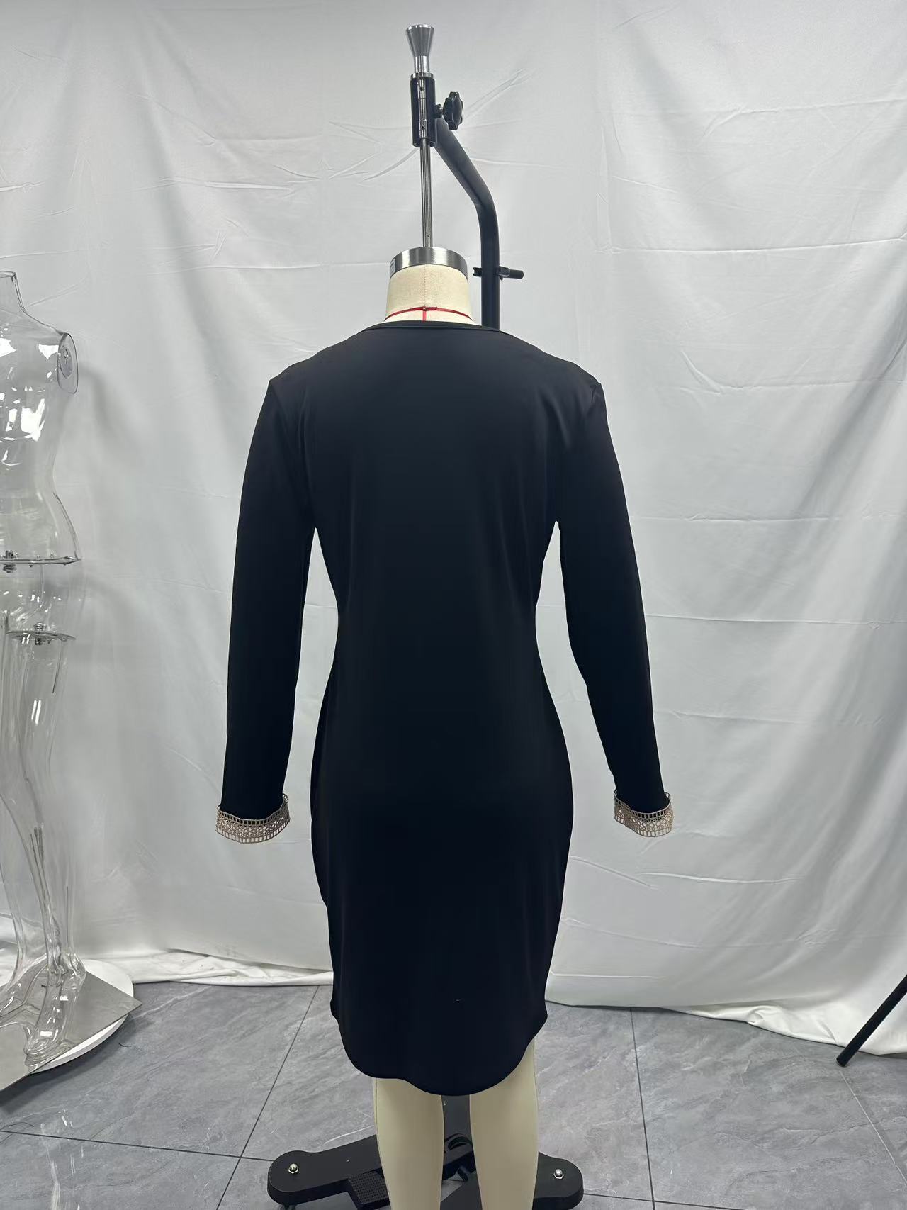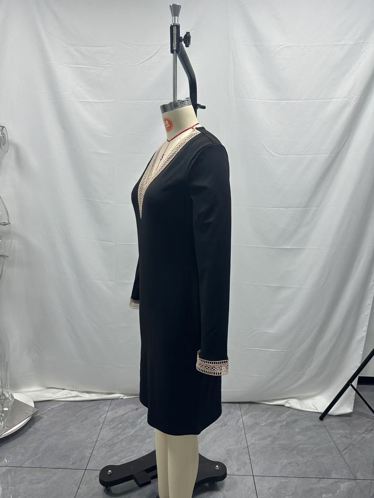 아마존 AliExpress 유럽 및 미국면 및 린넨 작은 V 넥 레이스 스티칭 복고풍 단색 긴 소매 원피스 여성