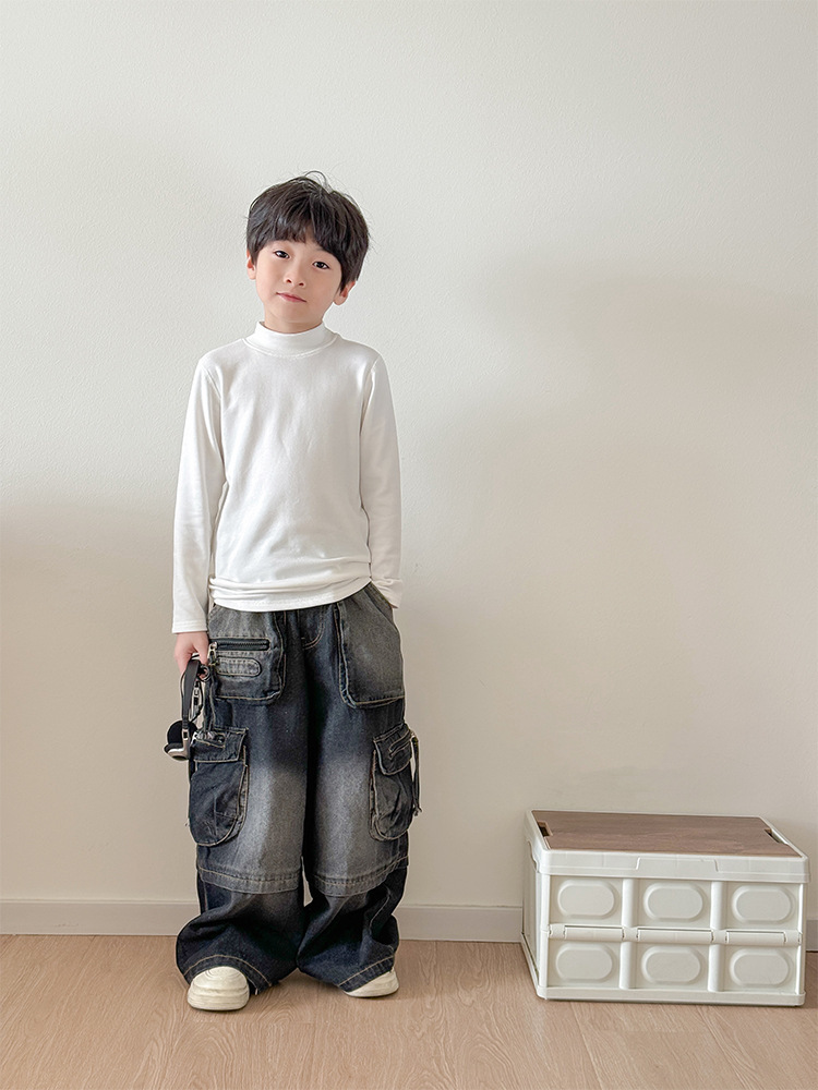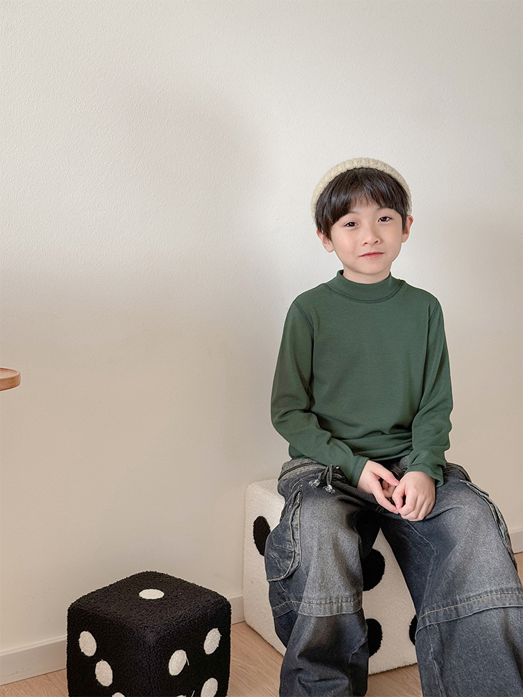 2025 가을 겨울 아동용 무봉제 얇은 벨벳 중간 칼라 이너웨어 남녀 공용 단색 상의 유아용 신축성 반하이넥스토어 가기