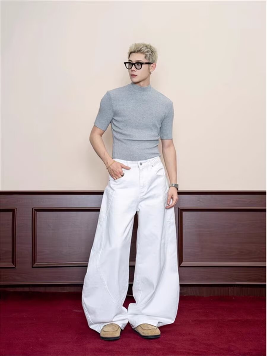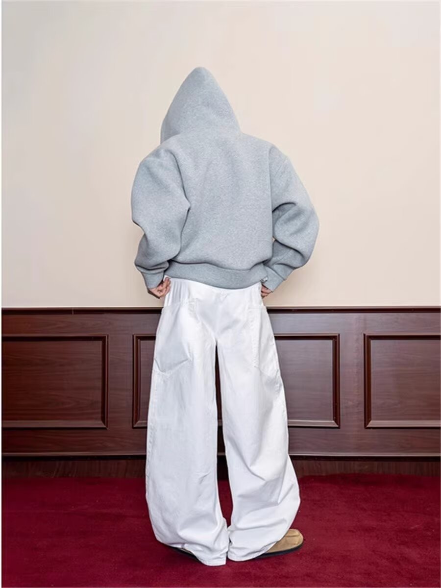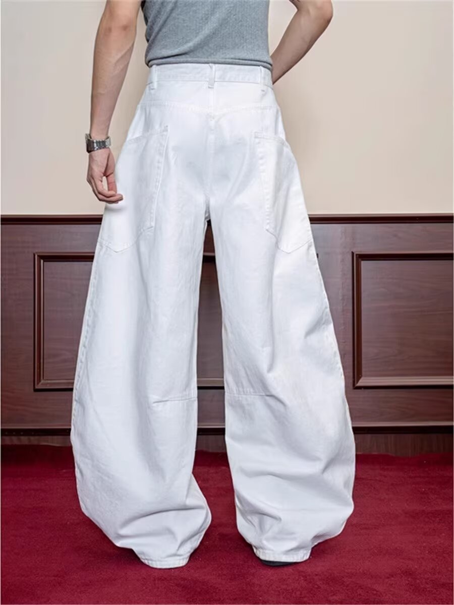 아메리칸 스타일 레트로 화이트 시미 터 청바지 남성 스트리트 더 작은 대형 포켓 느슨한 스트레이트 와이드 다리 바지