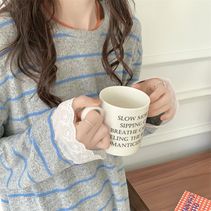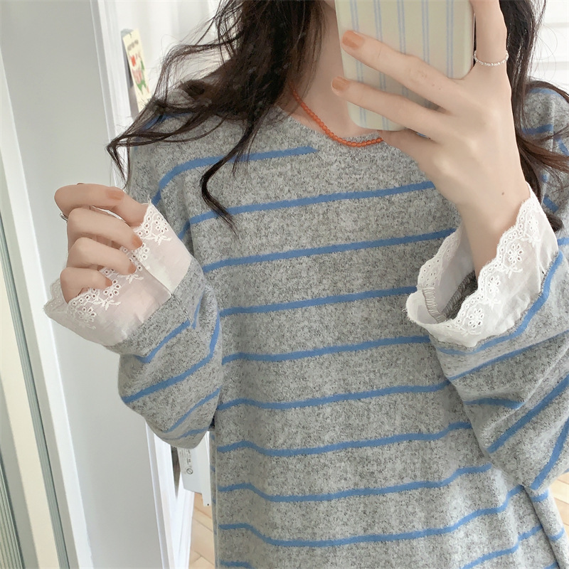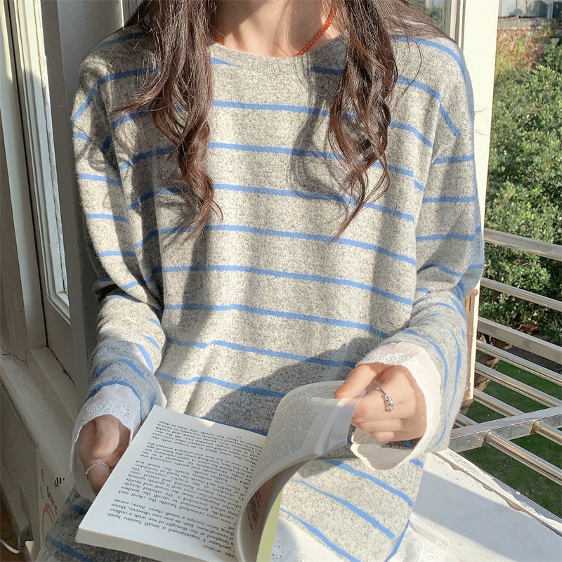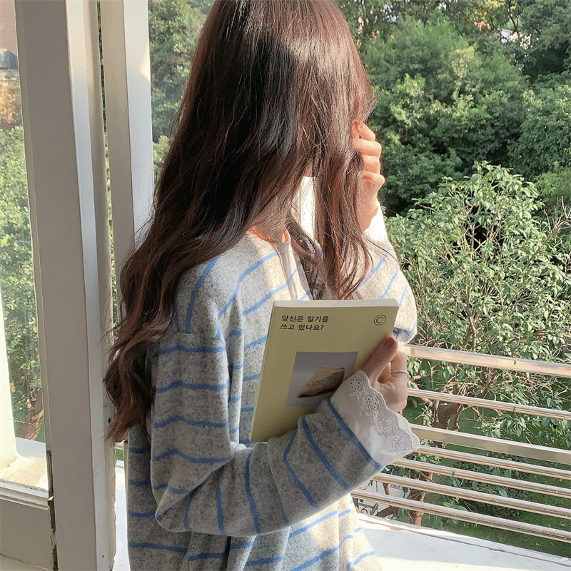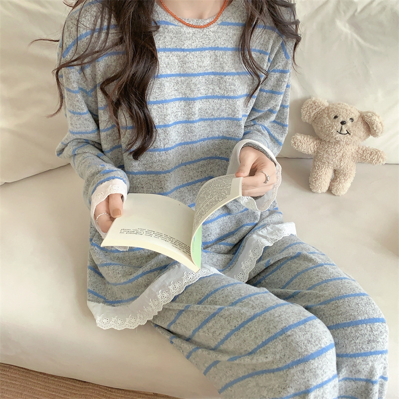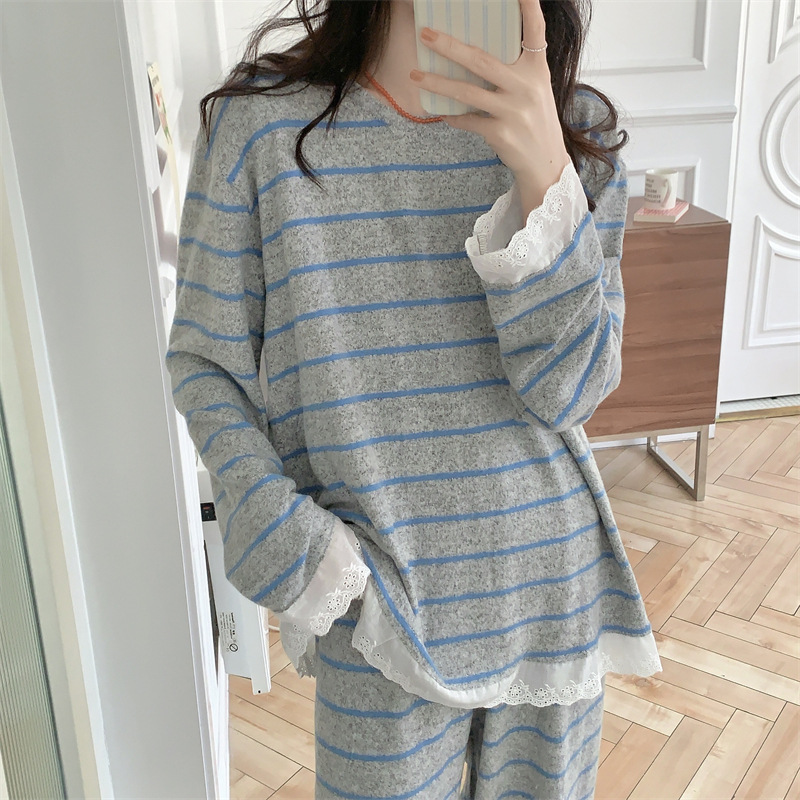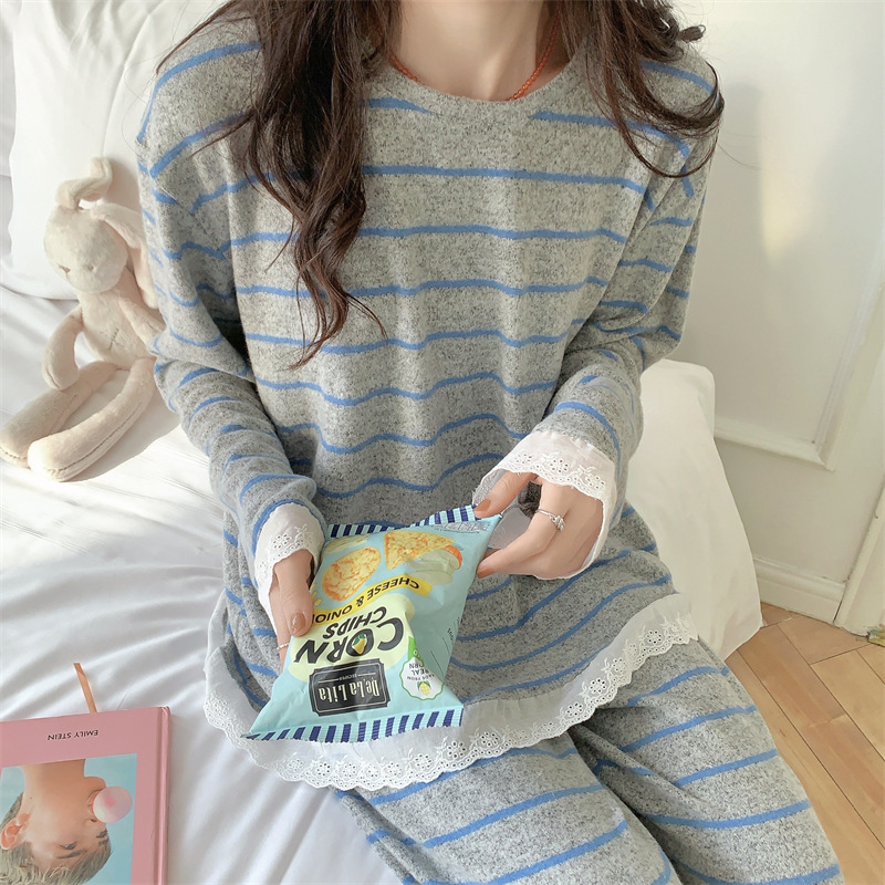 한국 새 도착 잠옷 여성 한국 스타일 줄무늬 간단한 편안한 레이스 세트 캐주얼 느슨한 캐주얼 홈 의류