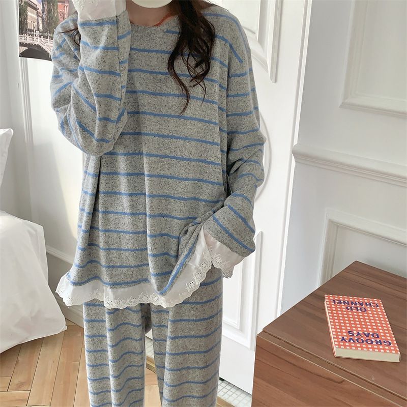 한국 새 도착 잠옷 여성 한국 스타일 줄무늬 간단한 편안한 레이스 세트 캐주얼 느슨한 캐주얼 홈 의류스토어 가기